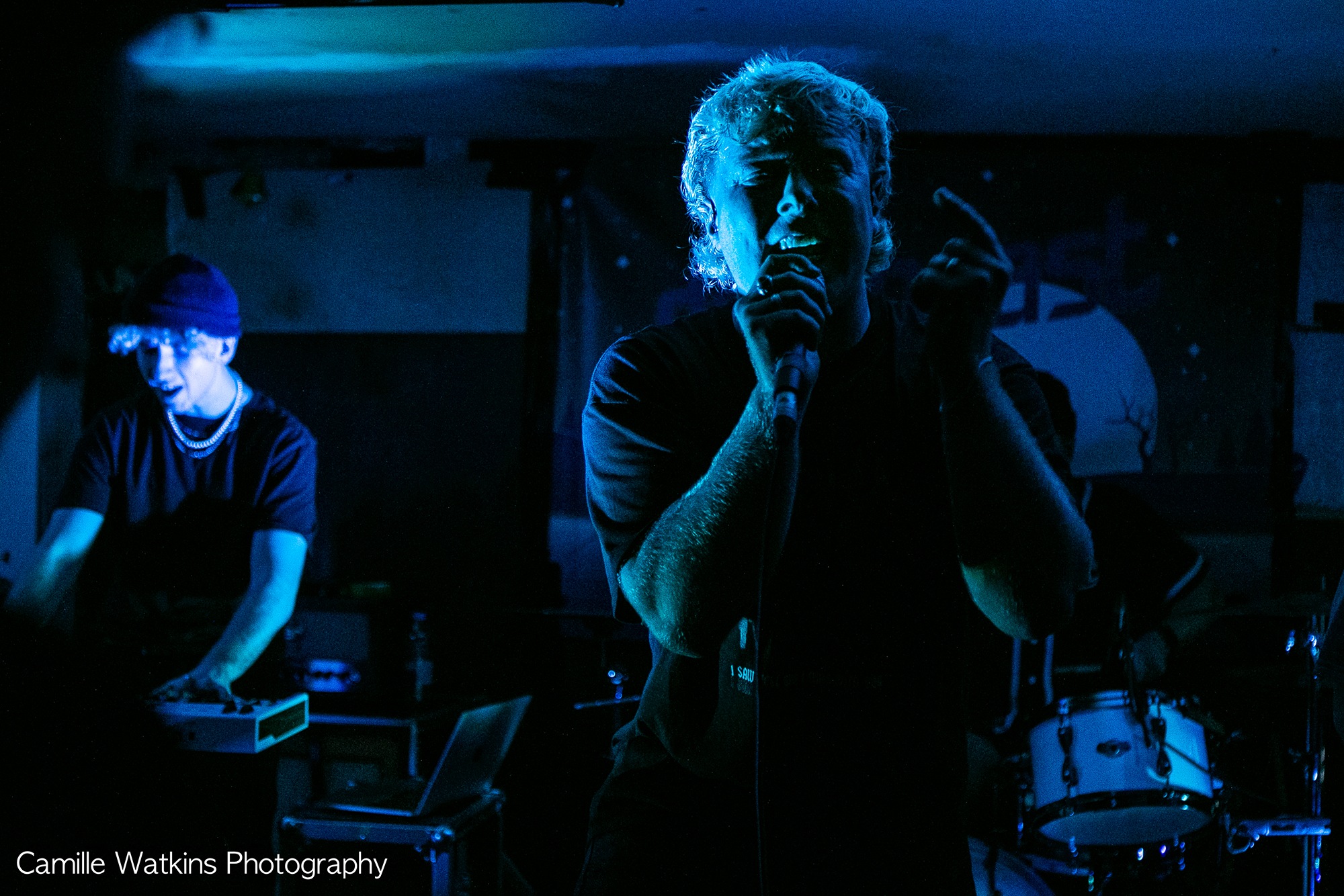 Fans, excited friends and a proud mum have now fully packed out this matchbox of a room, wall to wall – floor to ceiling, to spend an hour with the four Bristol lads who make up DOWNCAST (plus an extra guitarist). Opening with their set with the band’s first single britannia mills from recently released album i saw hell when I was with you, DOWNCAST are met with a lot of beaming smiles and singing along which sets the mood for the rest of their performance.