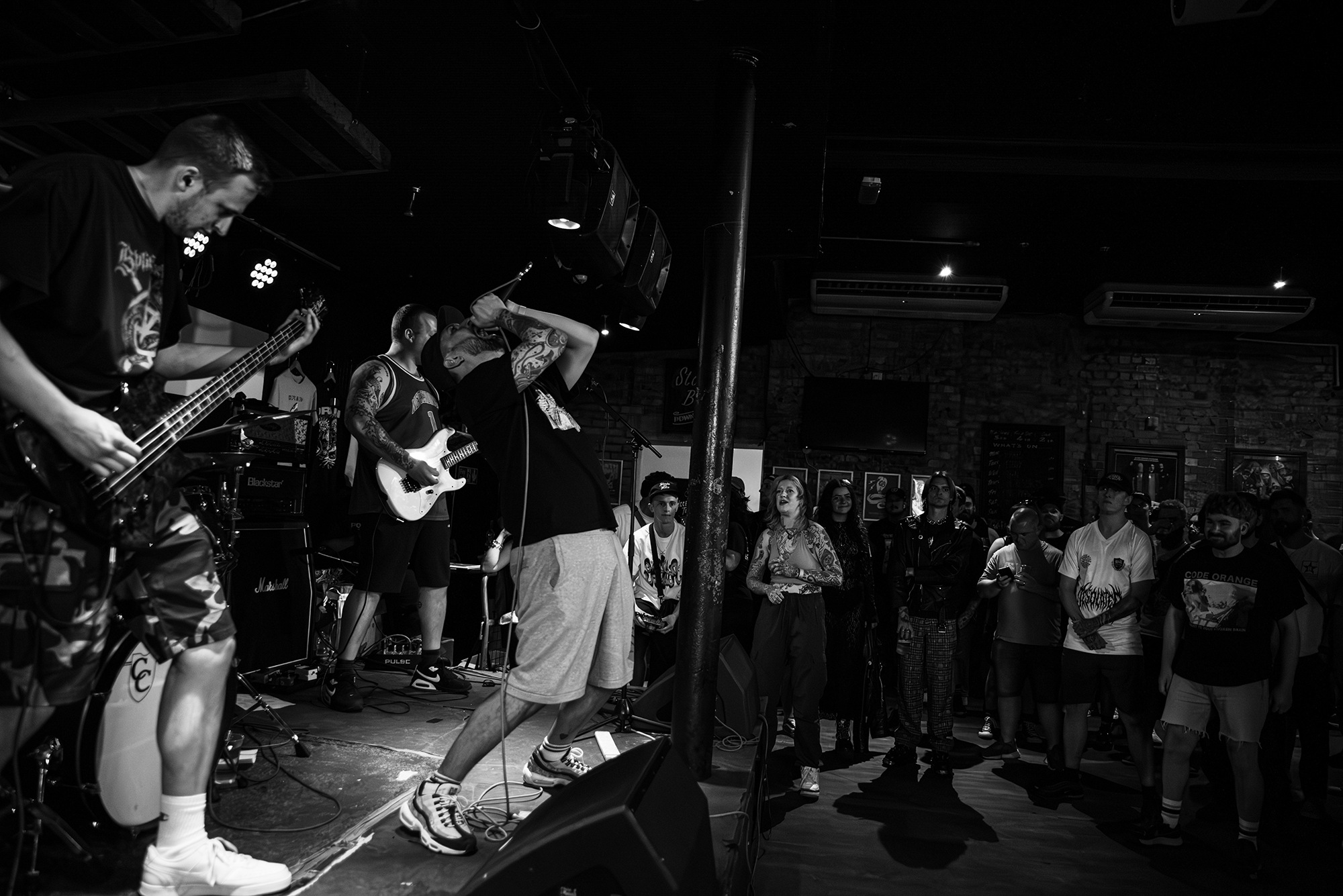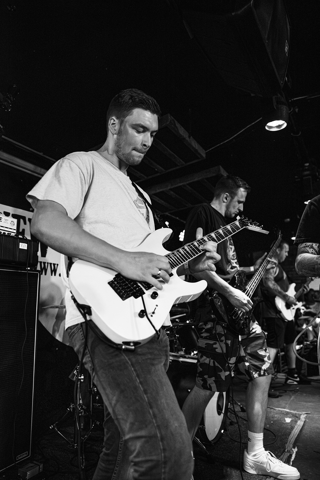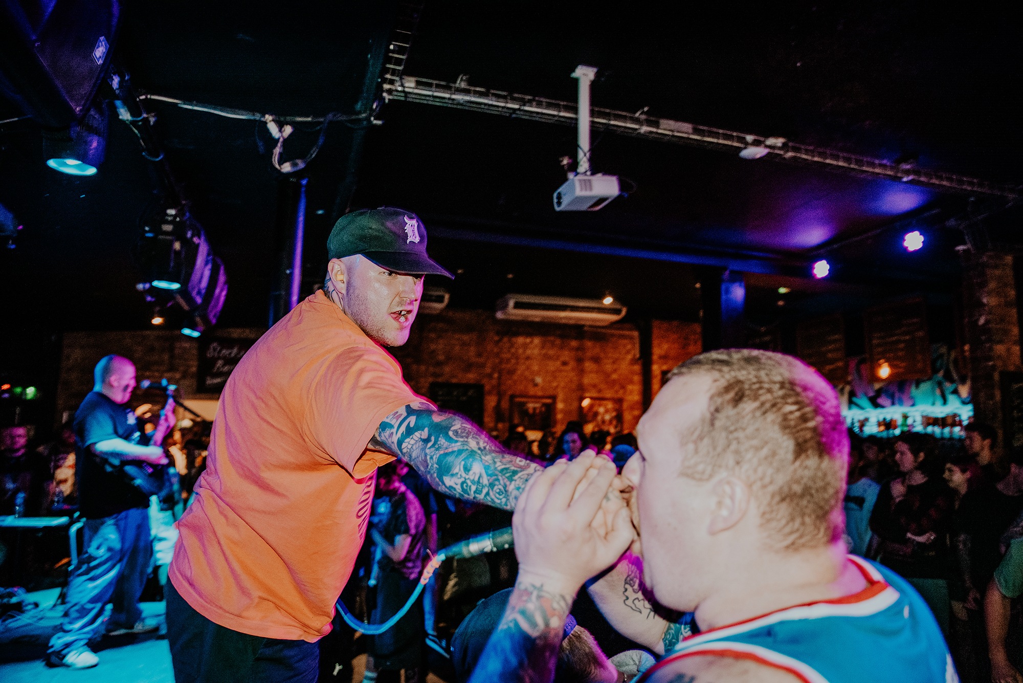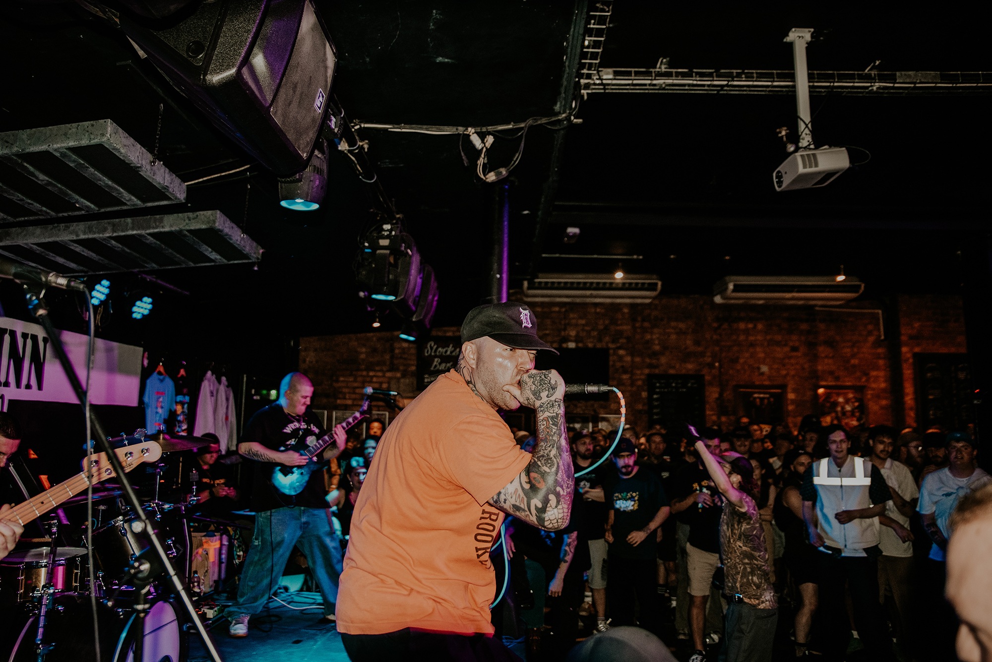 There’s considerably more moshing for the next band FINAL FORM as the already sizeable crowd responds exactly as they should to the metallic hardcore outfit’s 20-minute onslaught of thrashy riffs and gigantic breakdowns. There’s a new track off an upcoming EP that’s sure to be an absolute crusher, but it’s Blood On The Line – a contribution to The Coming Strife‘s UK Hardcore Comp released earlier this year – that provokes the most incendiary response, the crowd becoming a mass of two-steppers and even a few cartwheelers, which honestly looks way better than it sounds. By the time they wrap up with a final chugging beatdown there’s scarcely a body in the room that doesn’t need some fresh air as the temperature has just been raised considerably.