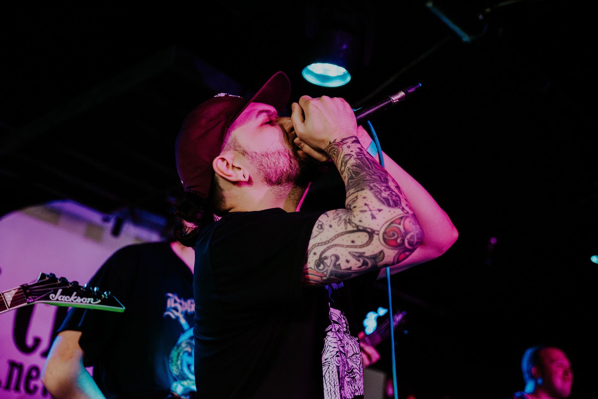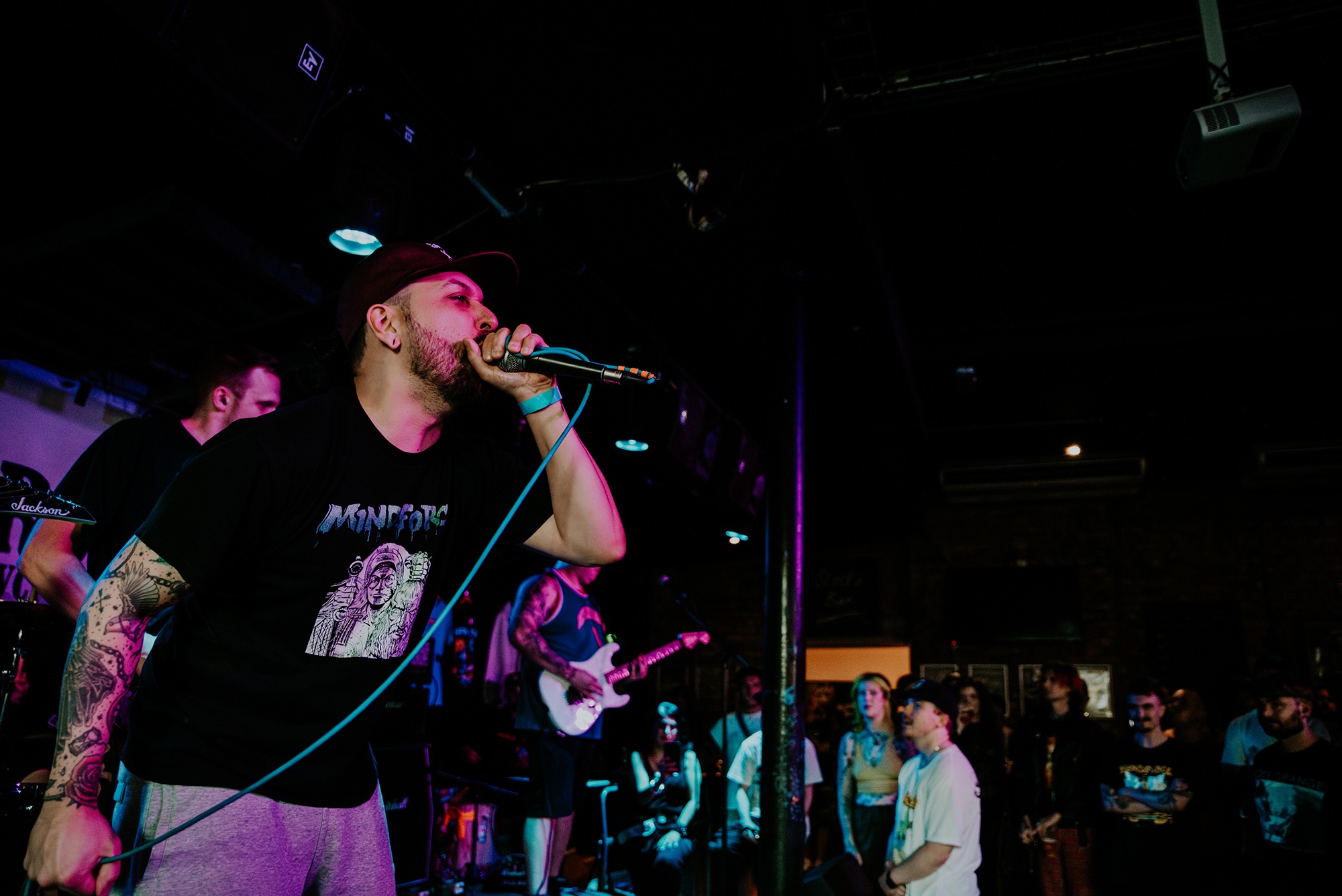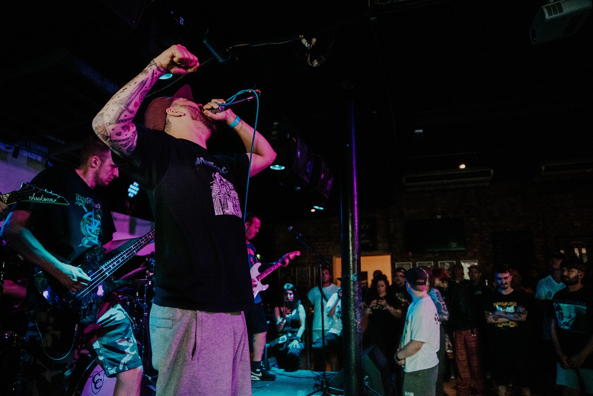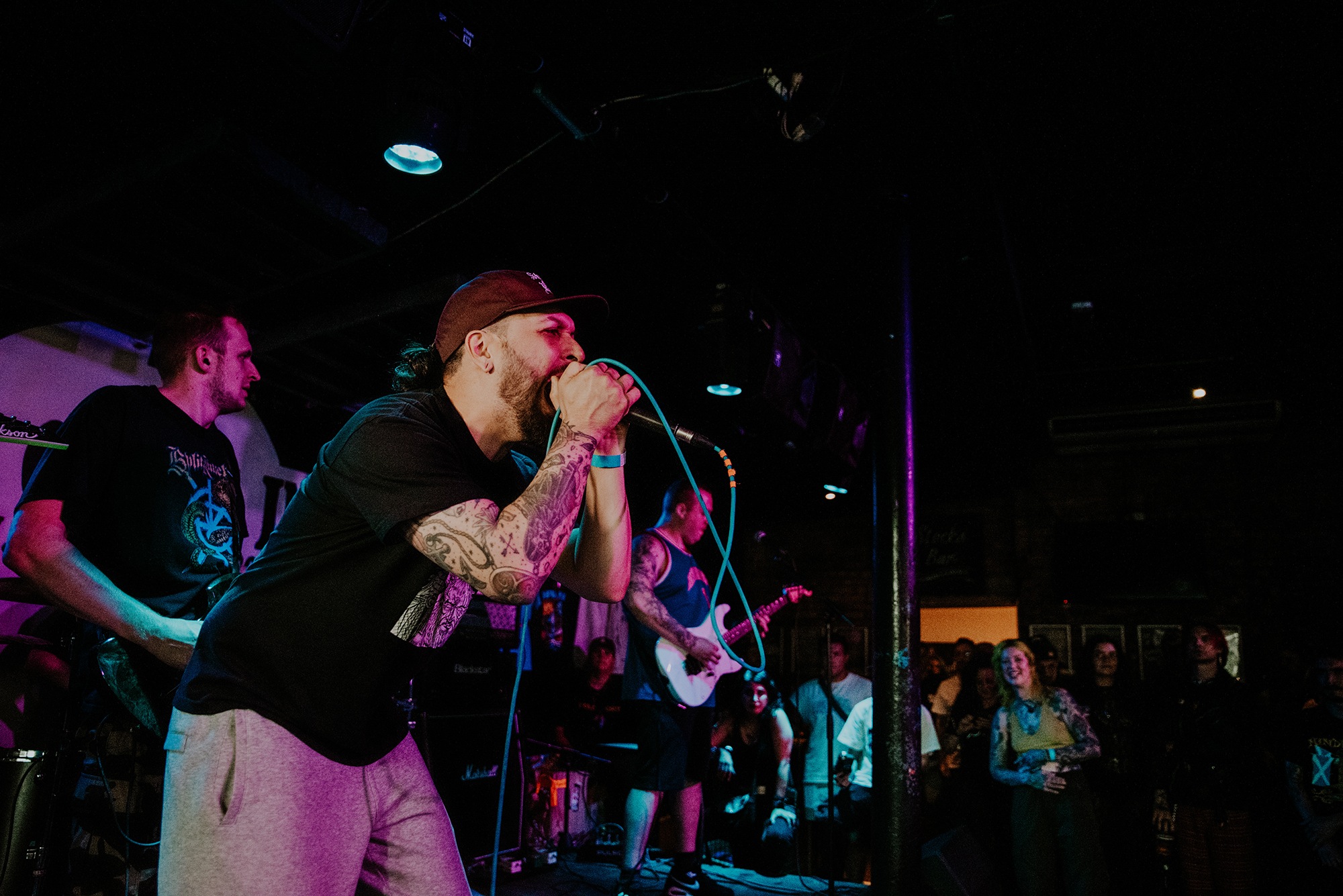 There’s considerably more moshing for the next band FINAL FORM as the already sizeable crowd responds exactly as they should to the metallic hardcore outfit’s 20-minute onslaught of thrashy riffs and gigantic breakdowns. There’s a new track off an upcoming EP that’s sure to be an absolute crusher, but it’s Blood On The Line – a contribution to The Coming Strife‘s UK Hardcore Comp released earlier this year – that provokes the most incendiary response, the crowd becoming a mass of two-steppers and even a few cartwheelers, which honestly looks way better than it sounds. By the time they wrap up with a final chugging beatdown there’s scarcely a body in the room that doesn’t need some fresh air as the temperature has just been raised considerably.