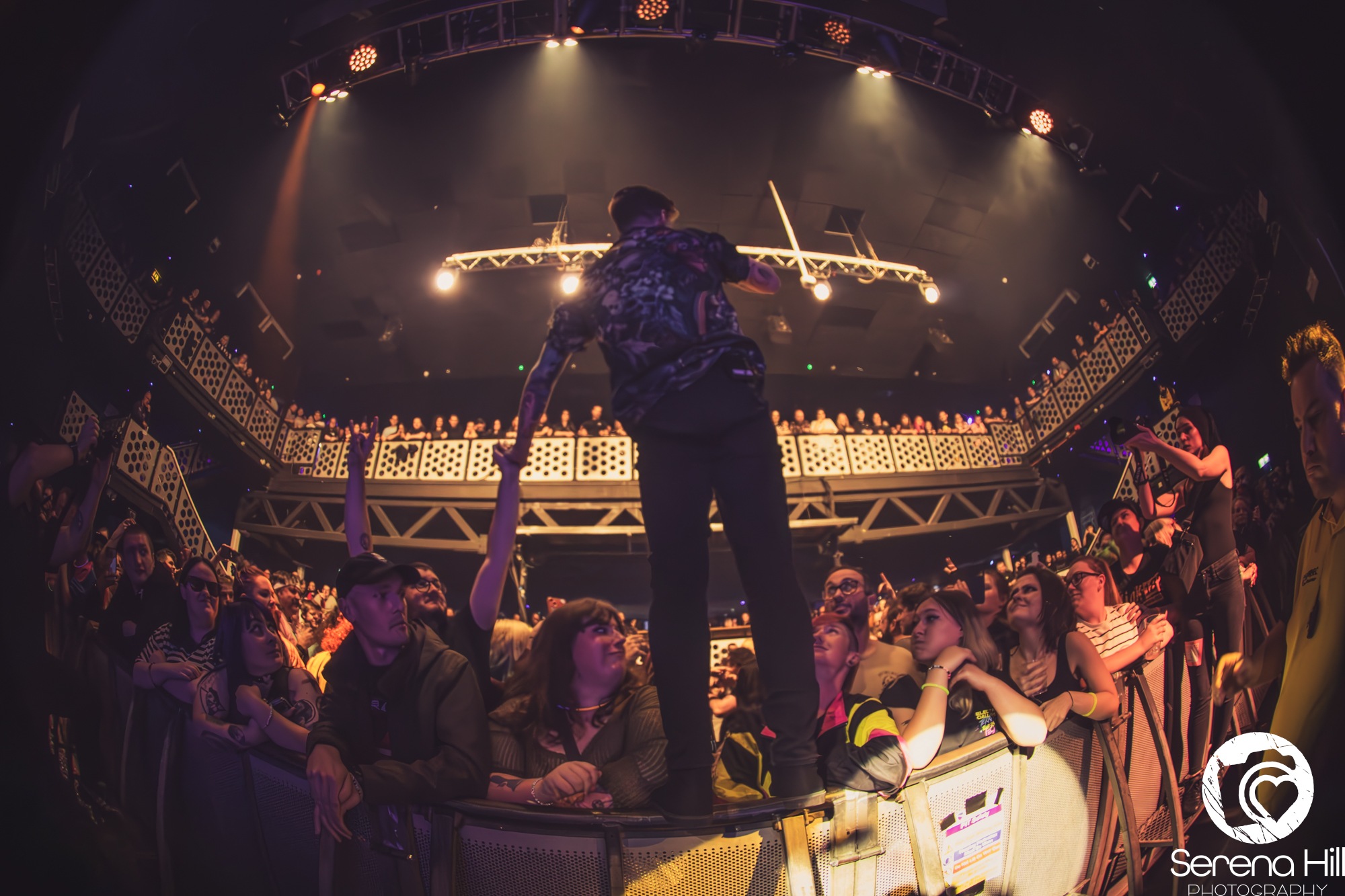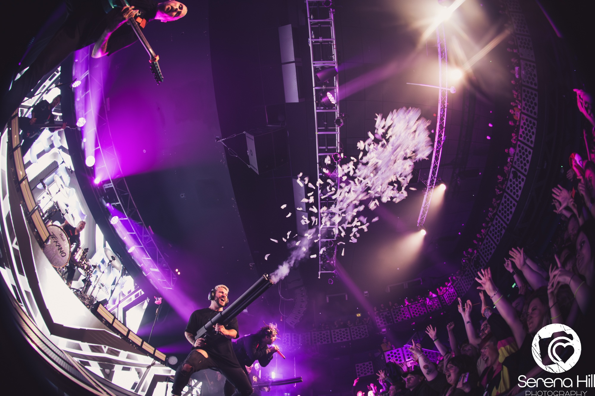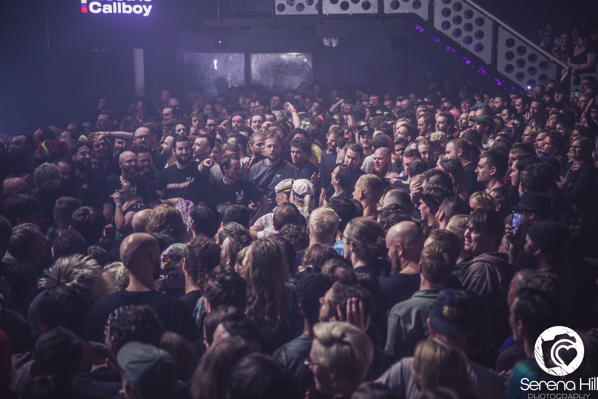 Sold out months in advance, the gig is packed and ready to party by the time tonight’s headliners take to the stage. Attendees lucky enough to have seen ELECTRIC CALLBOY’s Download Festival set know what to expect here, as a fake safety procedure introduces the German troupe to the stage. What becomes clear straight away is that the scale of production here far exceeds what we have come to expect from bands of this caliber. A light show complete with lasers accompanies Tekkno Train, as the audience bounces in unison to its techno beats and thunderous breakdowns.