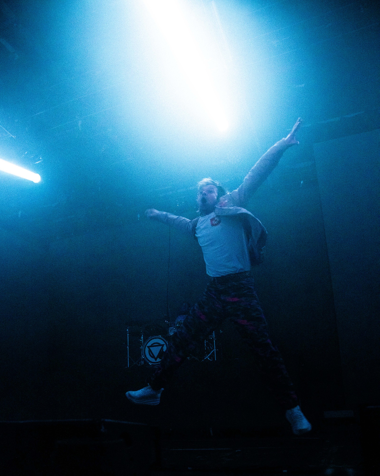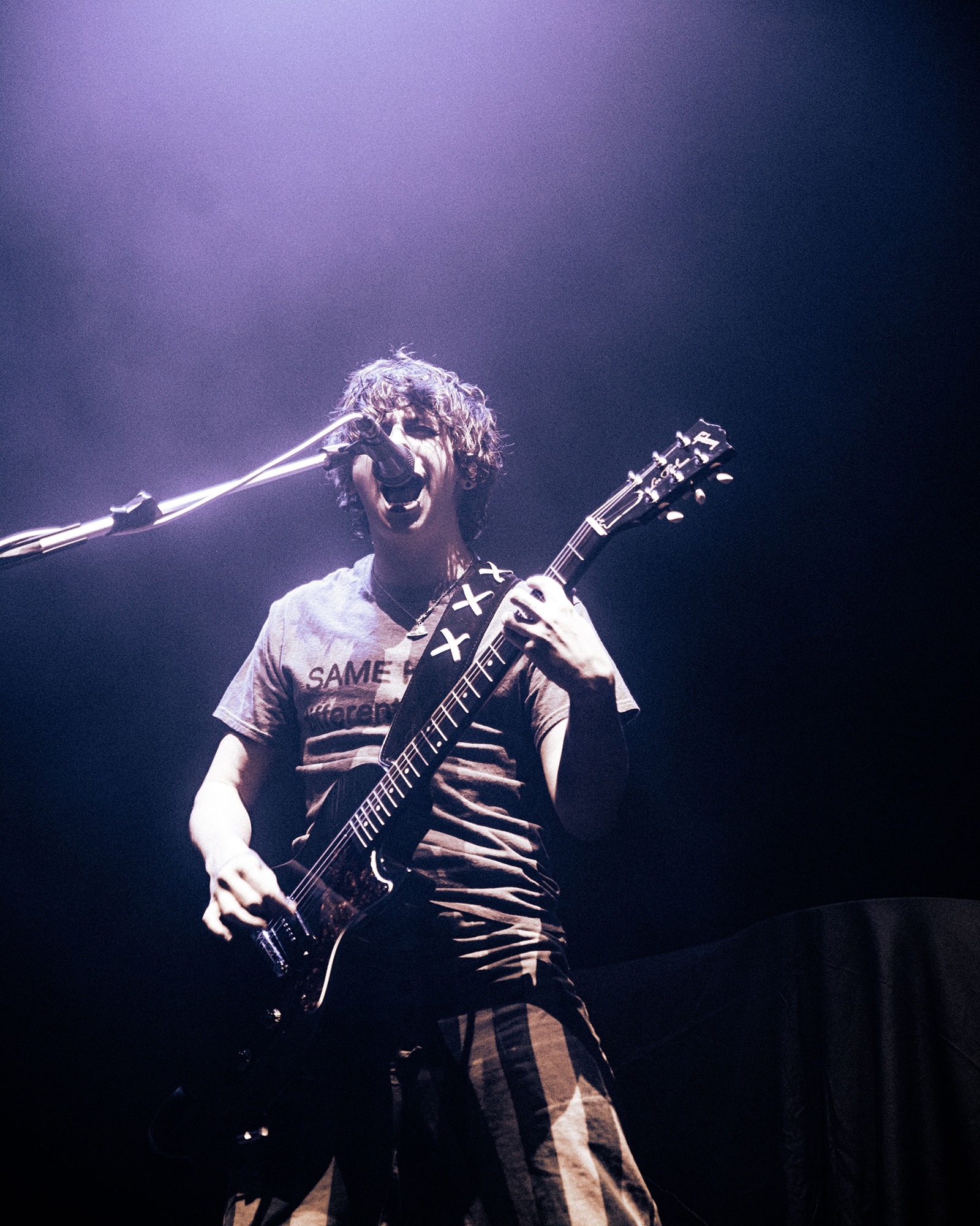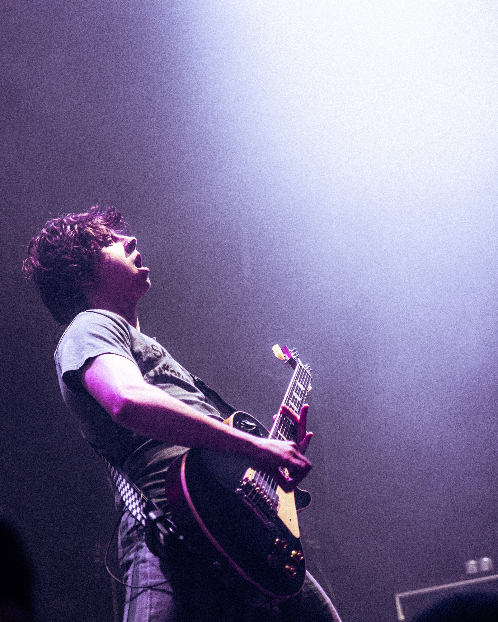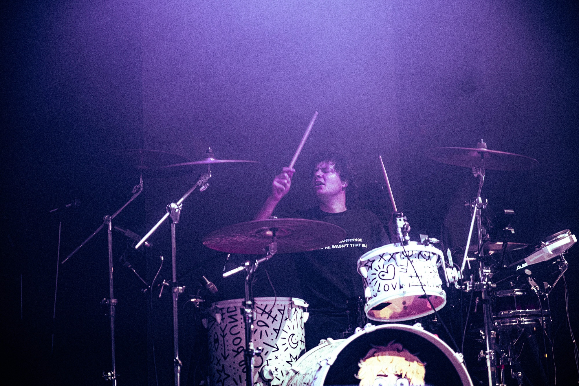 First to the stage is internet sweetheart NOAHFINNCE bringing crystal clean pop-punk and feel-good energy to warm up the room. “If you like pop-punk you might like this one, if not my bad” he says before playing latest single 3 Day Headache, a MACHINE GUN KELLY-esque hooky banger. His high energy performance is mirrored by drummer Matthew Swales and bassist Charlie Manning, who flings his bass around as he covers the full width of the stage, long blonde locks flinging about him. It’s an interesting choice as an opener to have a series of pauses in the set where the group depart, but with pre-recorded bits criticising the Tories and JK Rowling, we’ll allow it. Their encouragement of crowd participation in frequent clap alongs and joining in the la’s of punchy banger Lalala encourages a lot of headbanging and dancing along with the feel-good vibes. As the number of people in the room slowly rises during their set, NOAHFINNCE gets the energy going.