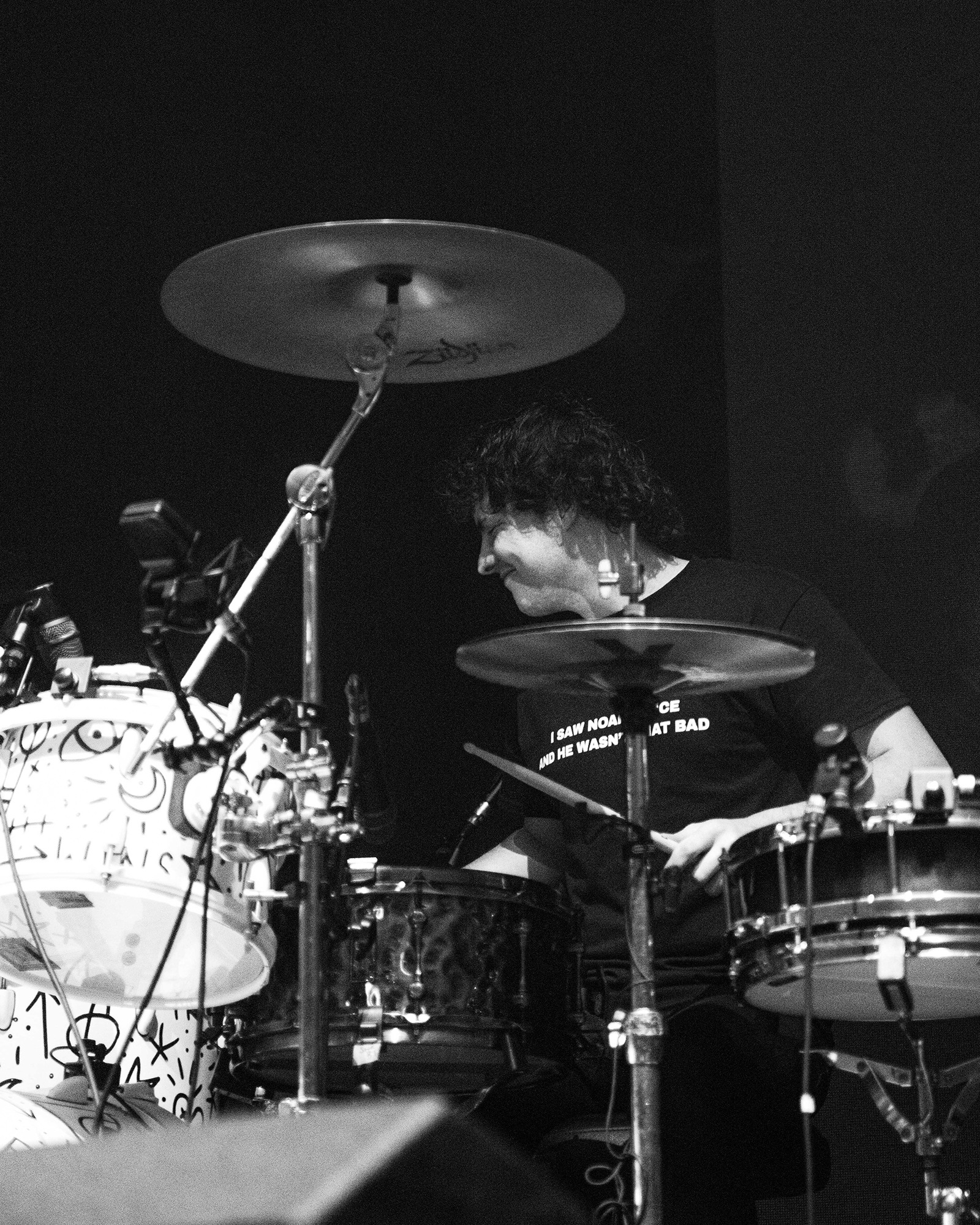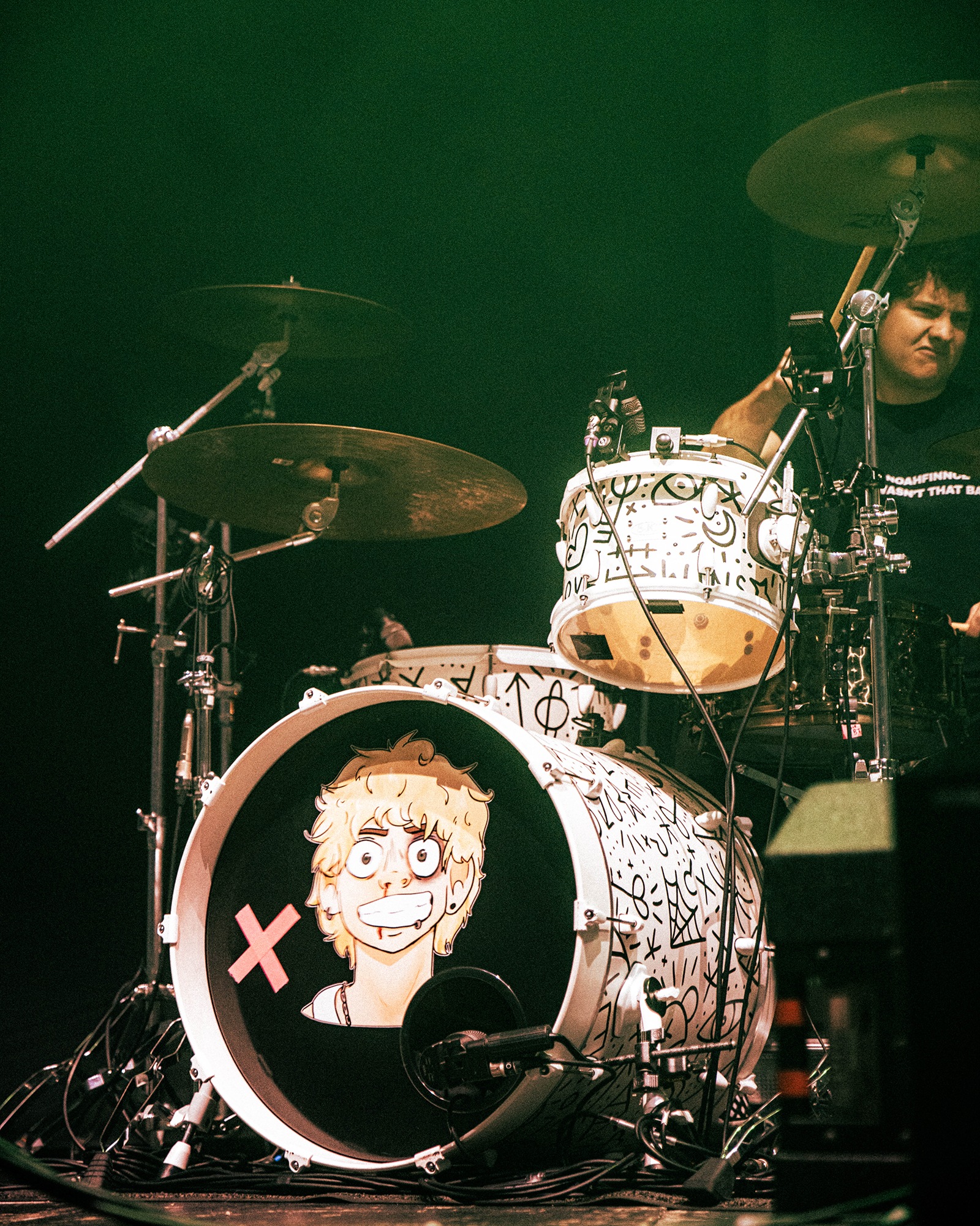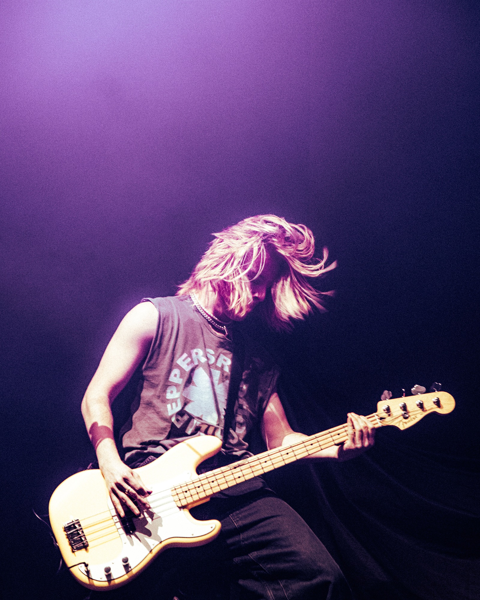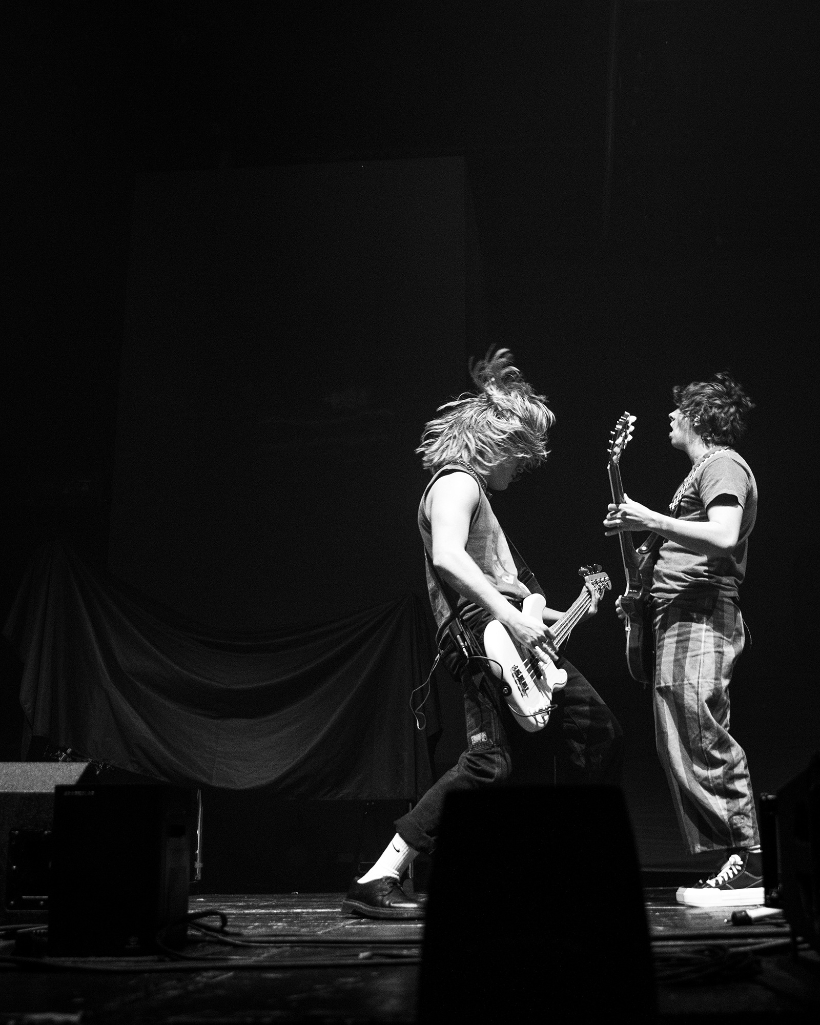 First to the stage is internet sweetheart NOAHFINNCE bringing crystal clean pop-punk and feel-good energy to warm up the room. “If you like pop-punk you might like this one, if not my bad” he says before playing latest single 3 Day Headache, a MACHINE GUN KELLY-esque hooky banger. His high energy performance is mirrored by drummer Matthew Swales and bassist Charlie Manning, who flings his bass around as he covers the full width of the stage, long blonde locks flinging about him. It’s an interesting choice as an opener to have a series of pauses in the set where the group depart, but with pre-recorded bits criticising the Tories and JK Rowling, we’ll allow it. Their encouragement of crowd participation in frequent clap alongs and joining in the la’s of punchy banger Lalala encourages a lot of headbanging and dancing along with the feel-good vibes. As the number of people in the room slowly rises during their set, NOAHFINNCE gets the energy going.