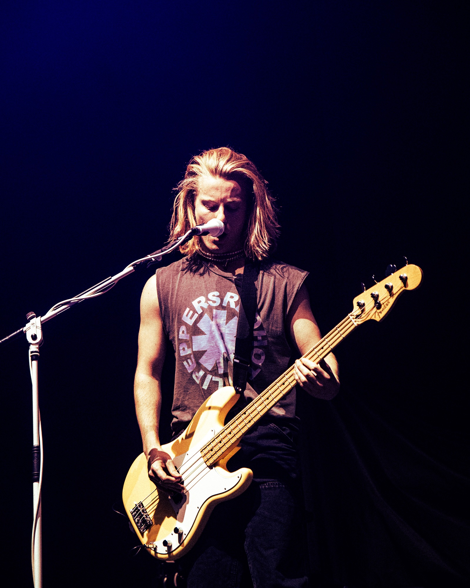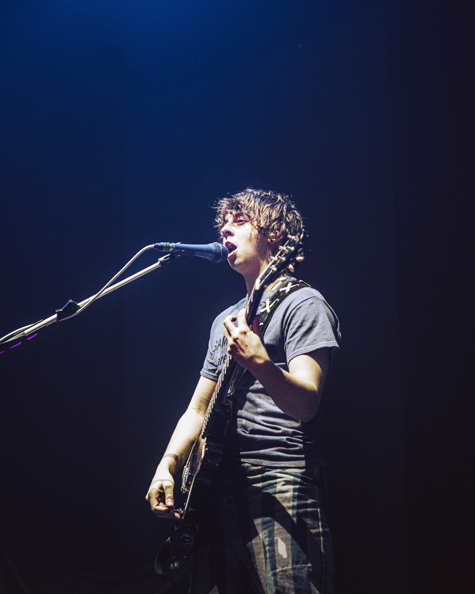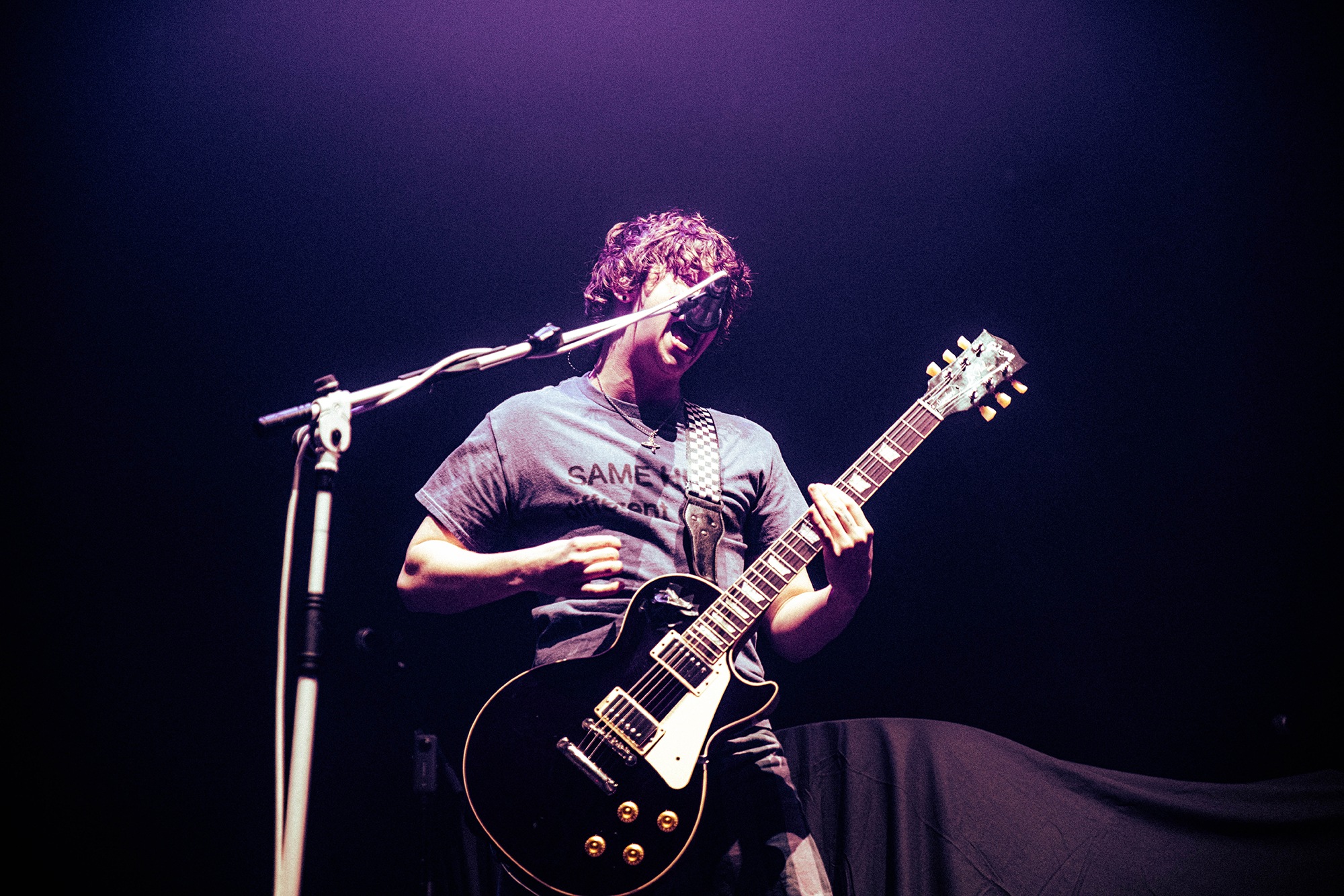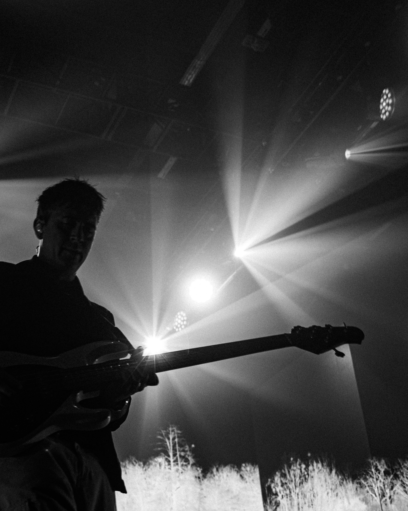 First to the stage is internet sweetheart NOAHFINNCE bringing crystal clean pop-punk and feel-good energy to warm up the room. “If you like pop-punk you might like this one, if not my bad” he says before playing latest single 3 Day Headache, a MACHINE GUN KELLY-esque hooky banger. His high energy performance is mirrored by drummer Matthew Swales and bassist Charlie Manning, who flings his bass around as he covers the full width of the stage, long blonde locks flinging about him. It’s an interesting choice as an opener to have a series of pauses in the set where the group depart, but with pre-recorded bits criticising the Tories and JK Rowling, we’ll allow it. Their encouragement of crowd participation in frequent clap alongs and joining in the la’s of punchy banger Lalala encourages a lot of headbanging and dancing along with the feel-good vibes. As the number of people in the room slowly rises during their set, NOAHFINNCE gets the energy going.