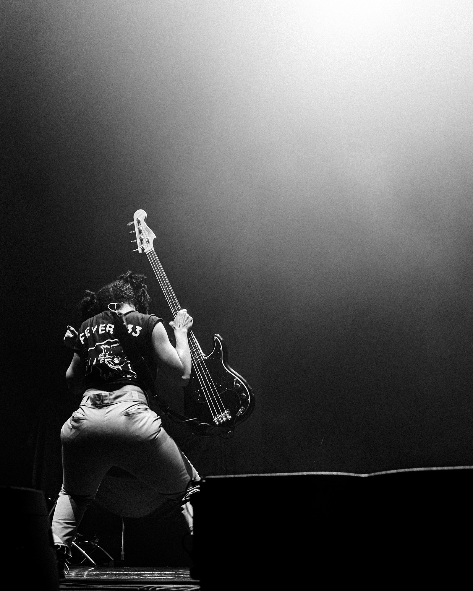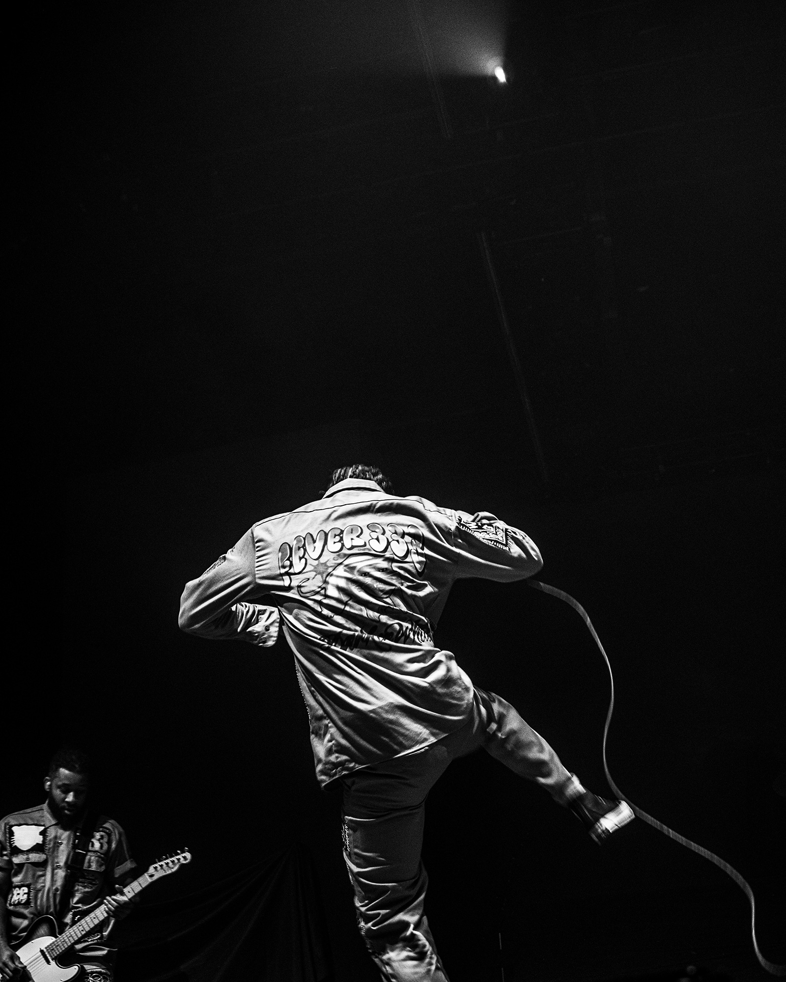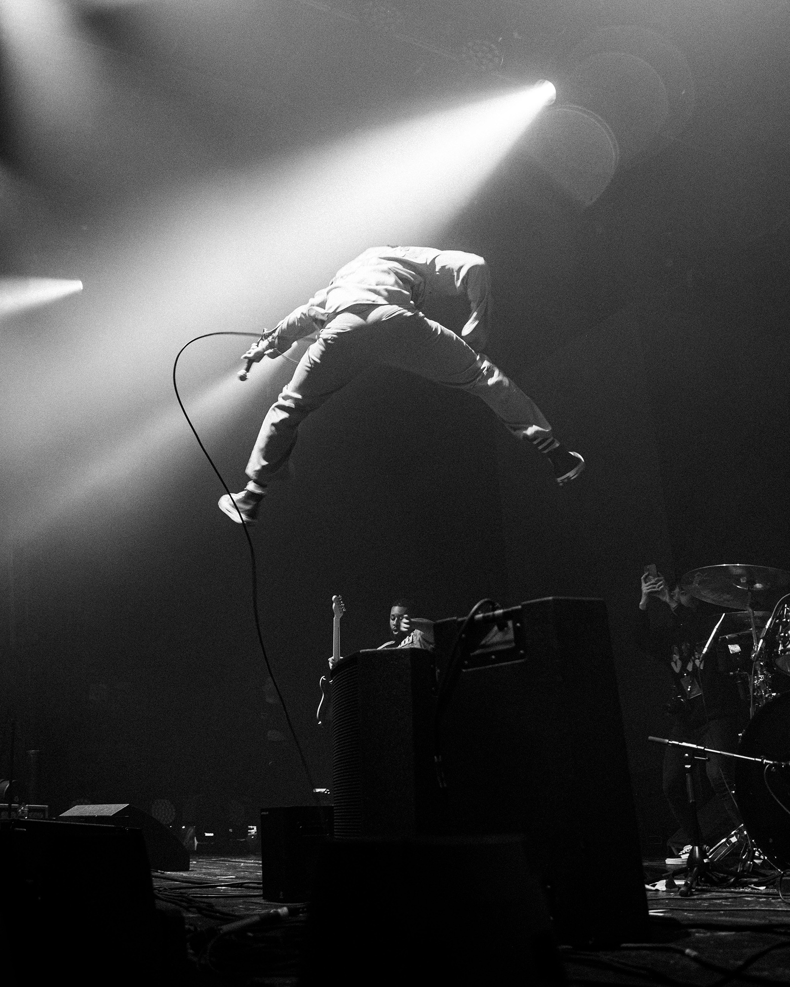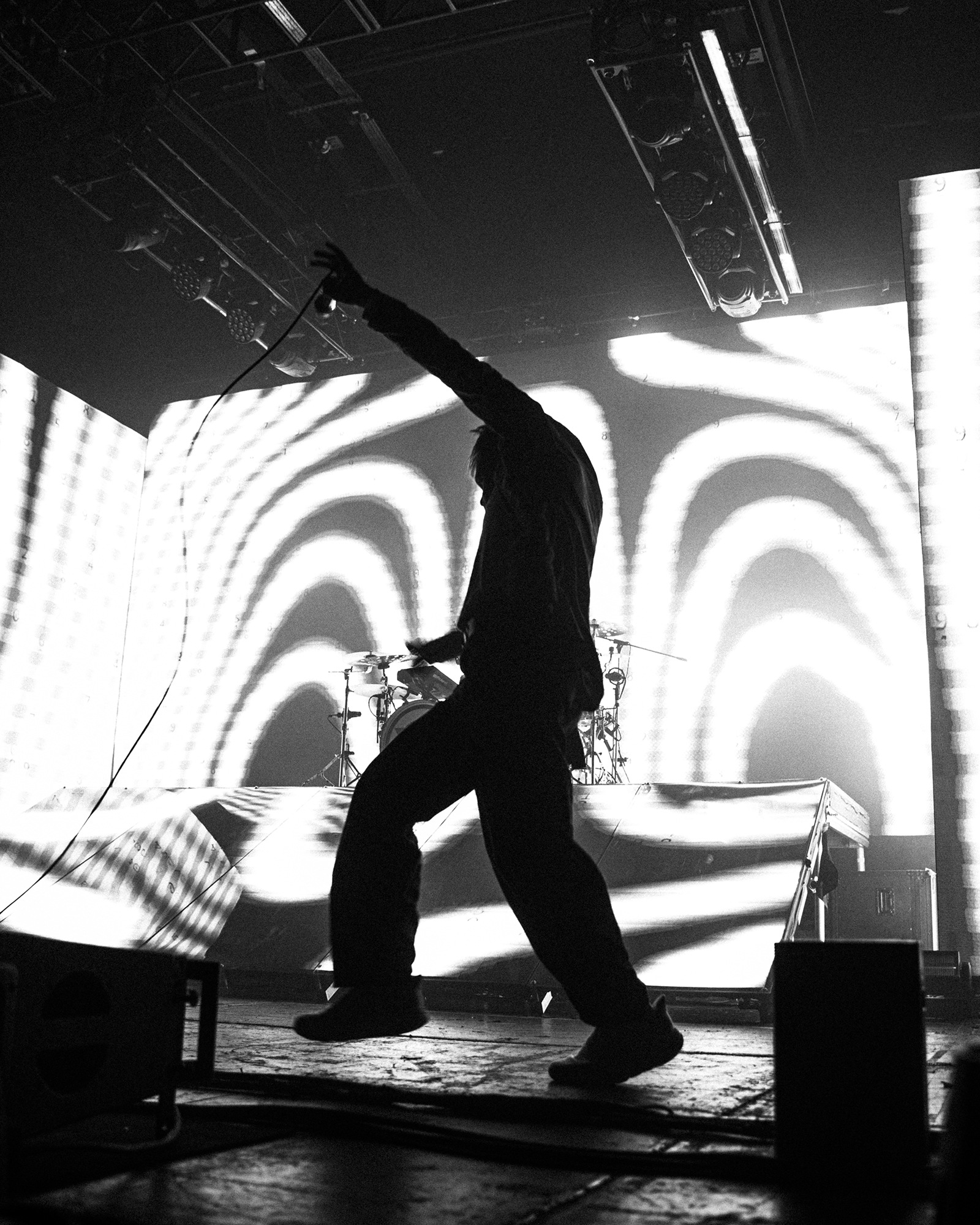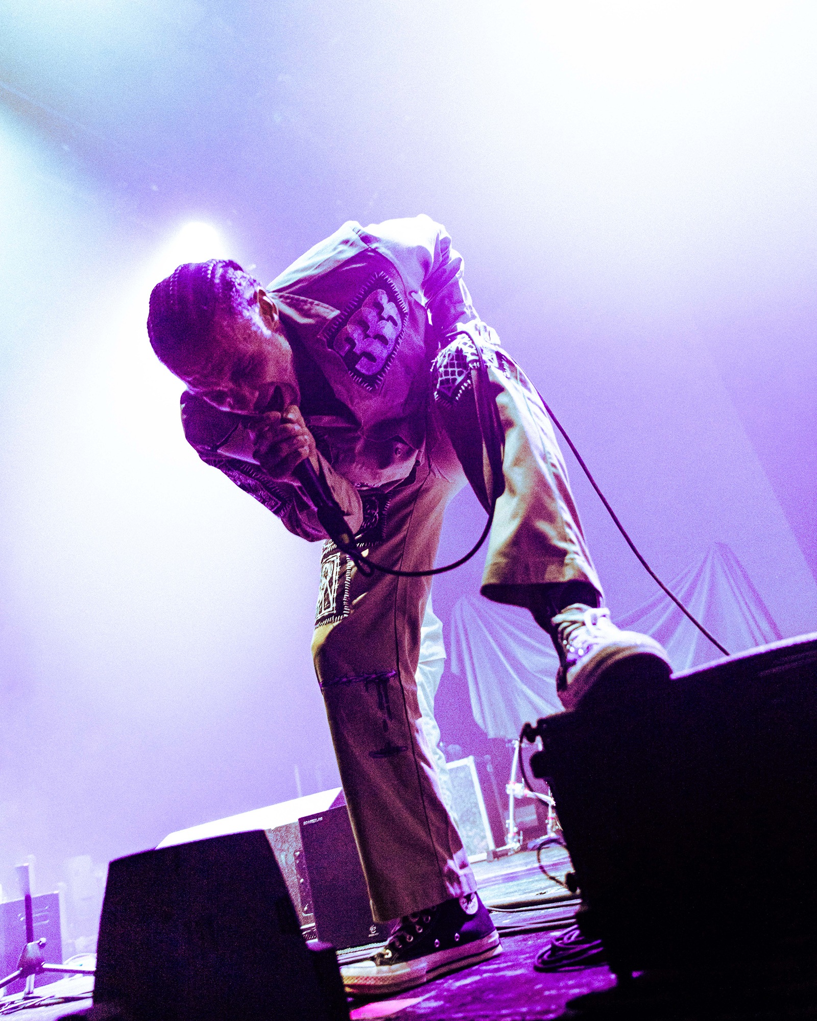 This is displayed no better than guitarist Rory Clewlow sliding down the ramp screen from the drum riser – they remain joyous and juvenile while also structured. The return of FEVER 333’s Jason Aalon Butler for colab track Losing My Grip escalates the energy in the room even further as he bundles about the stage like a fly bouncing off the edges in unpredictable chaos. Brief release is sought as Reynolds once again mounts the high-rise screen pillar for mellow renditions of T.I.N.A, Juggernauts and Gap In The Fence before the band return to complete the dance ending of the latter.