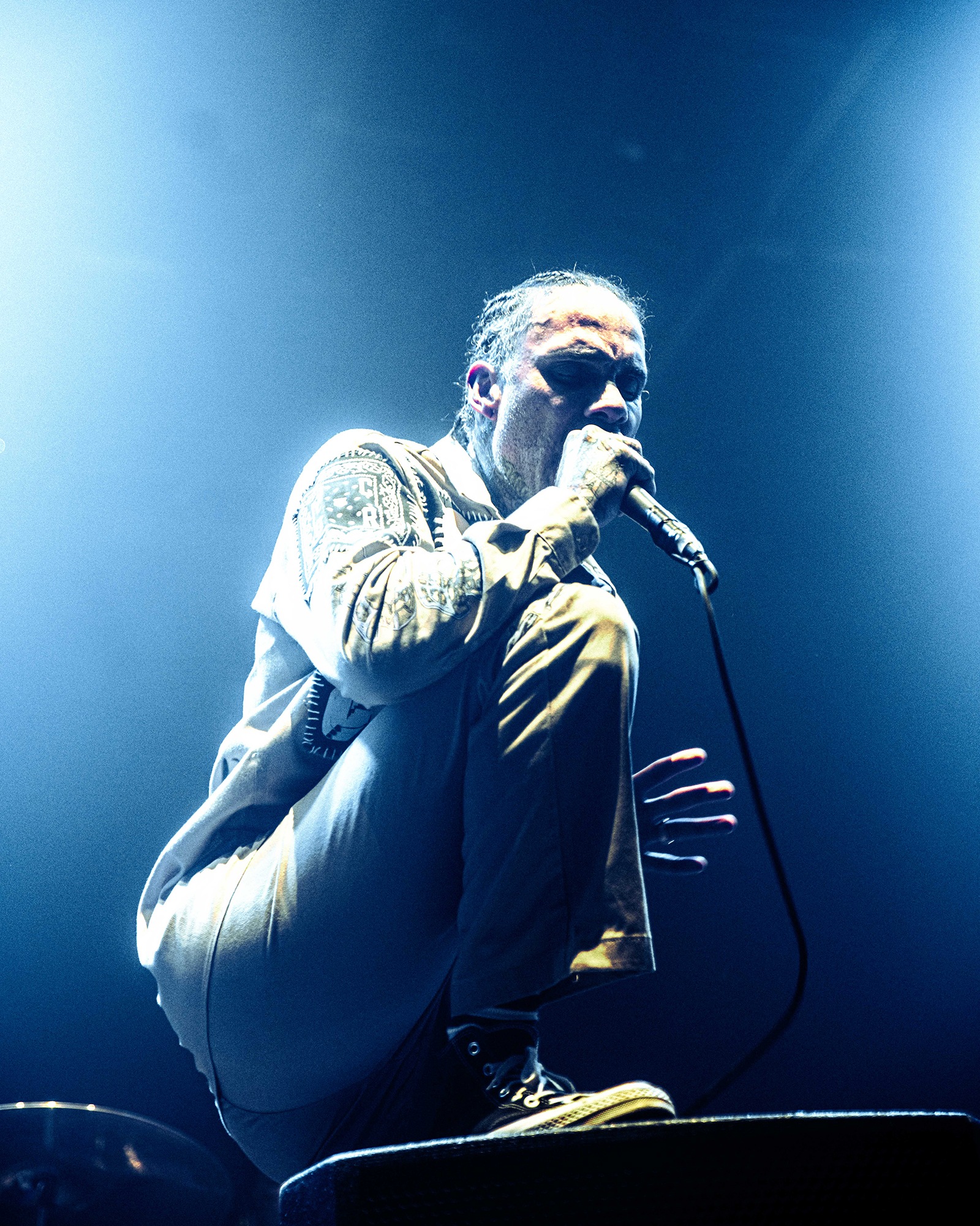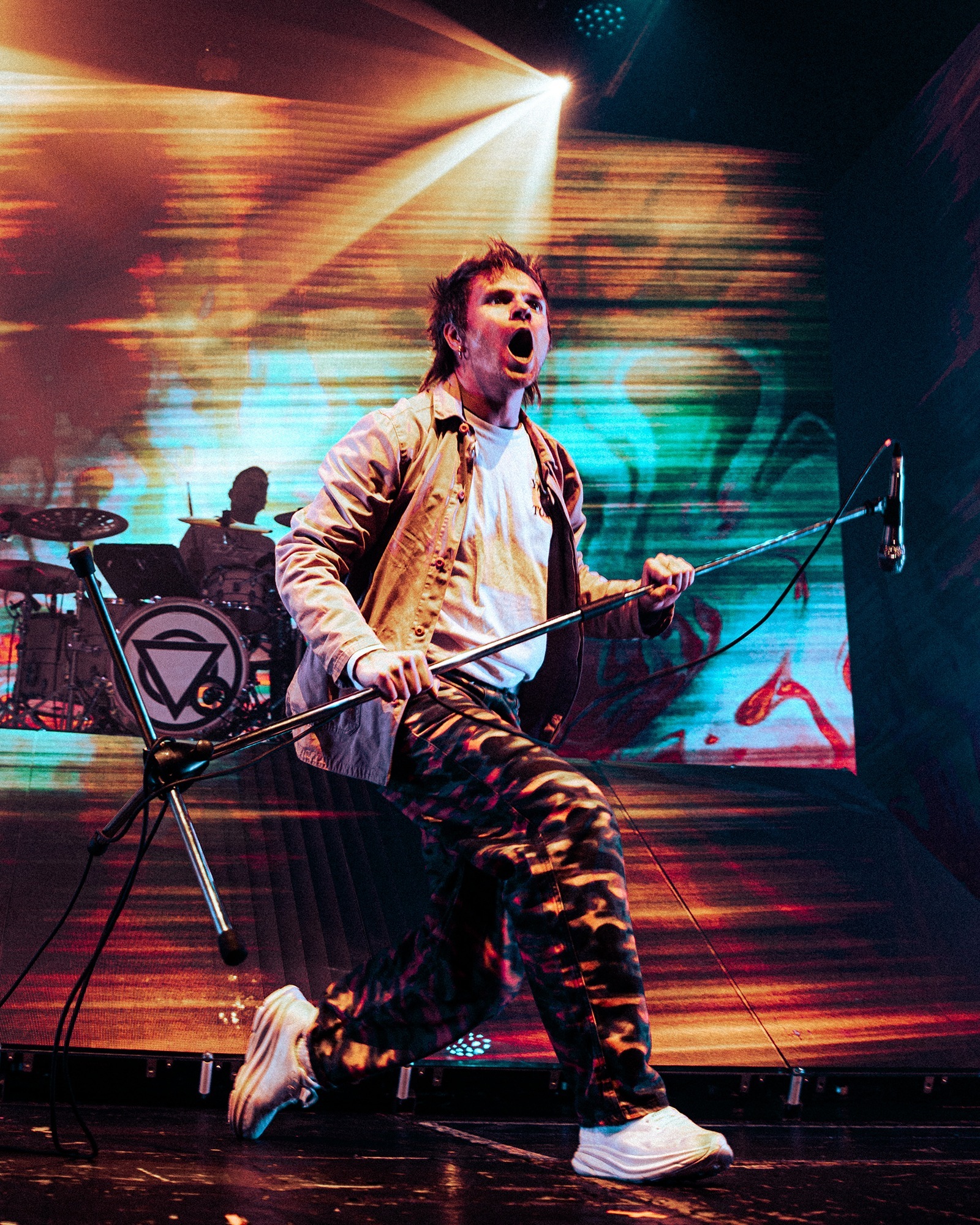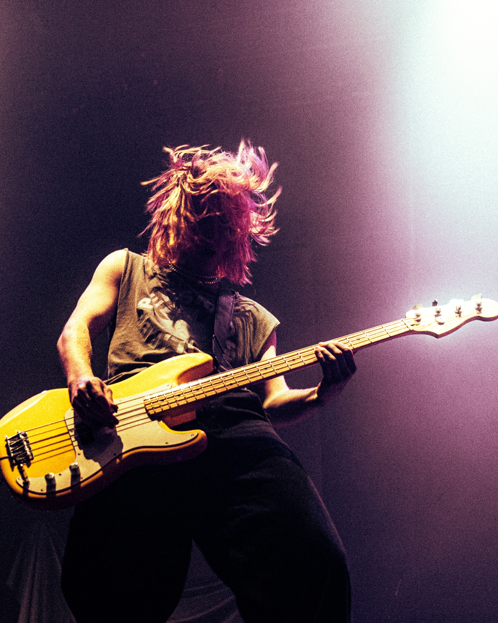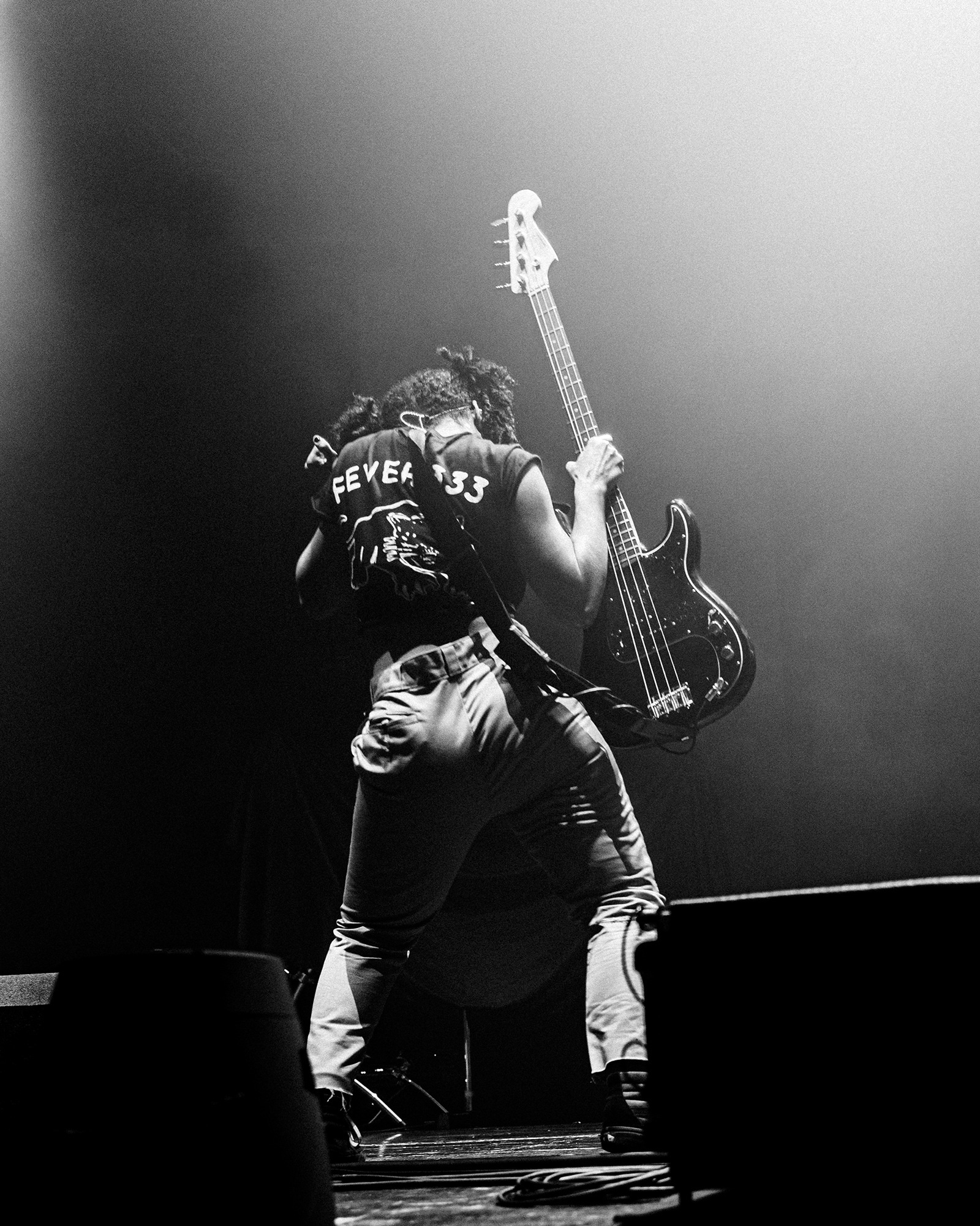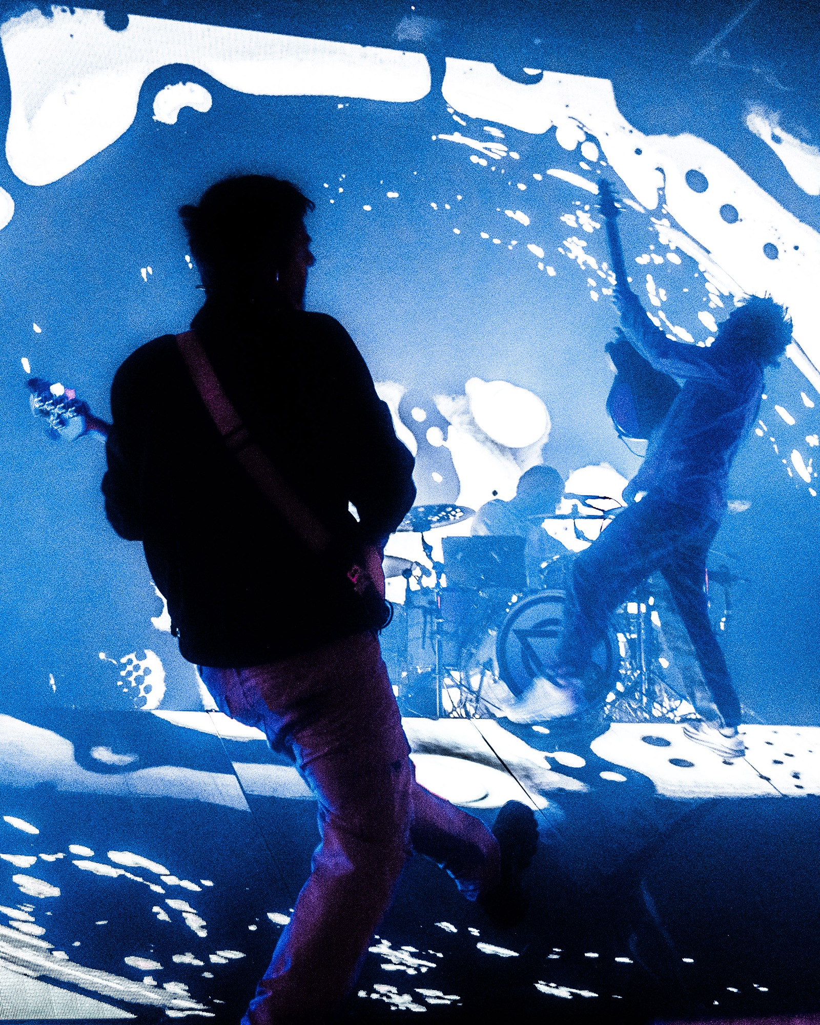 This is displayed no better than guitarist Rory Clewlow sliding down the ramp screen from the drum riser – they remain joyous and juvenile while also structured. The return of FEVER 333’s Jason Aalon Butler for colab track Losing My Grip escalates the energy in the room even further as he bundles about the stage like a fly bouncing off the edges in unpredictable chaos. Brief release is sought as Reynolds once again mounts the high-rise screen pillar for mellow renditions of T.I.N.A, Juggernauts and Gap In The Fence before the band return to complete the dance ending of the latter.