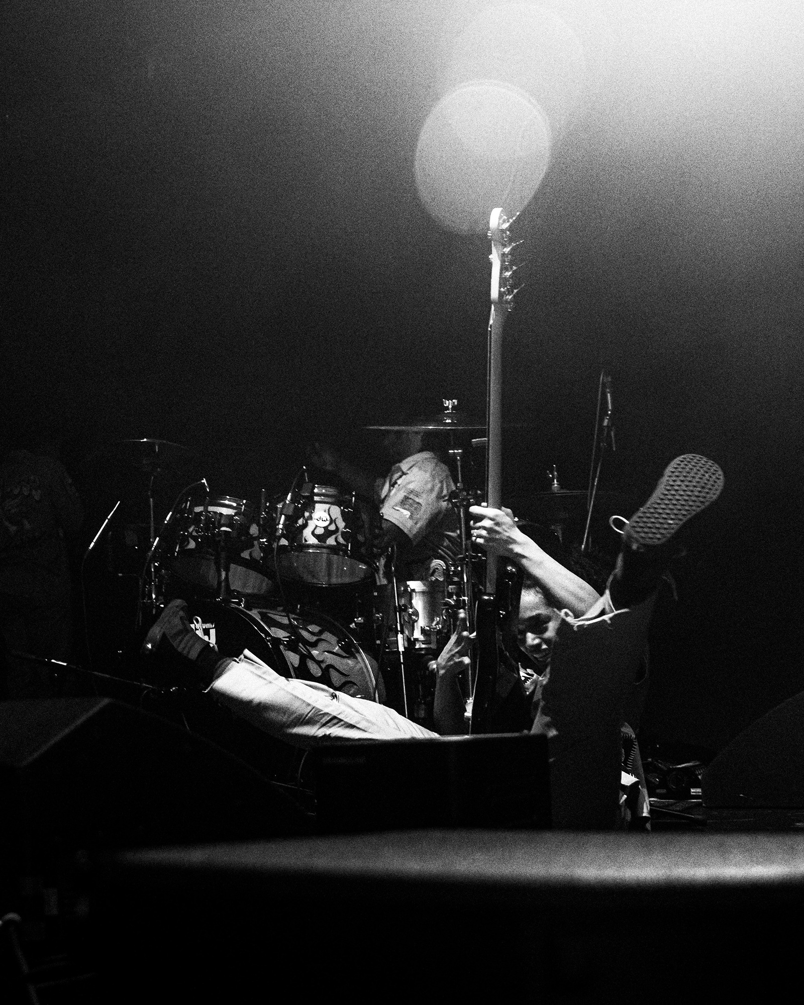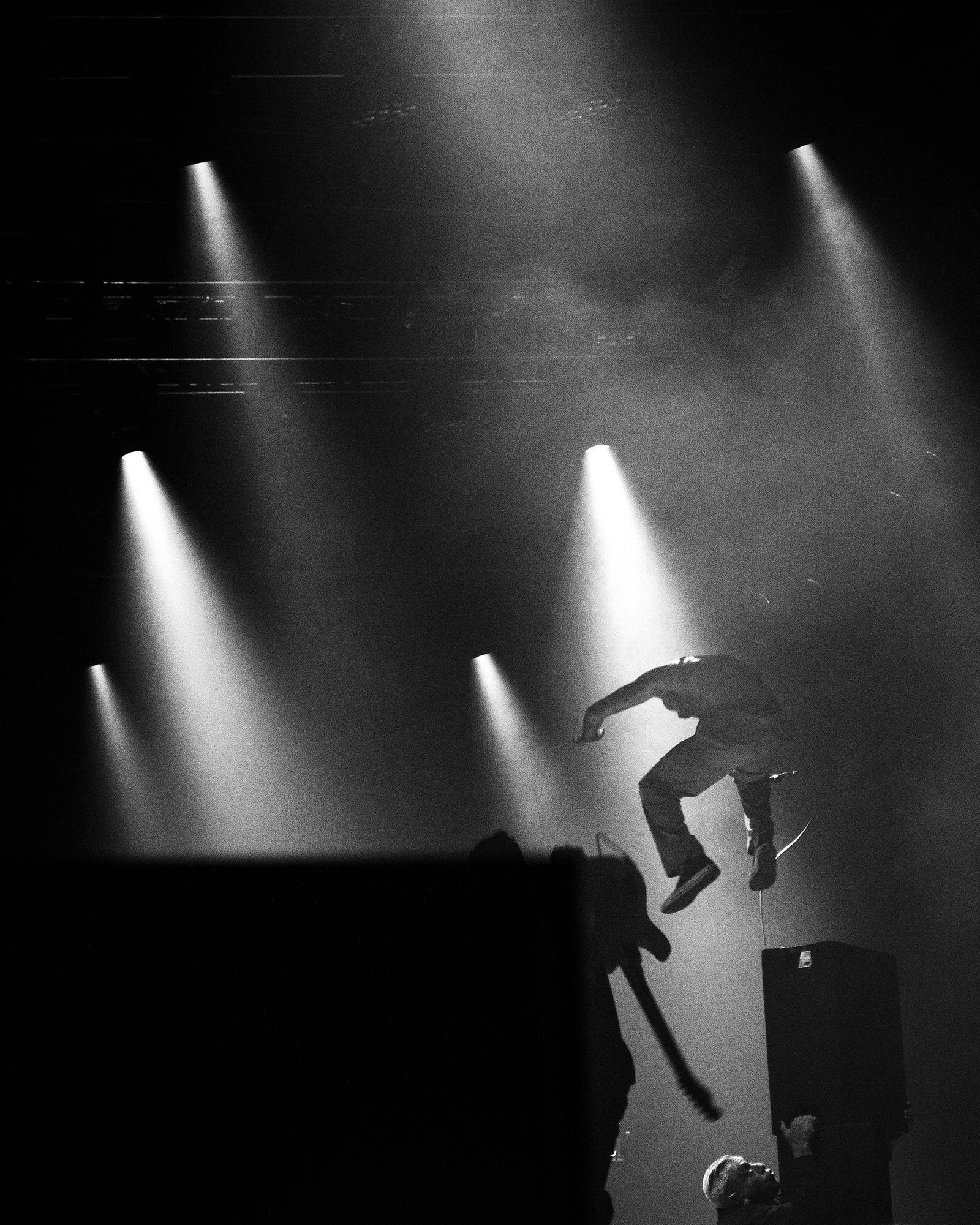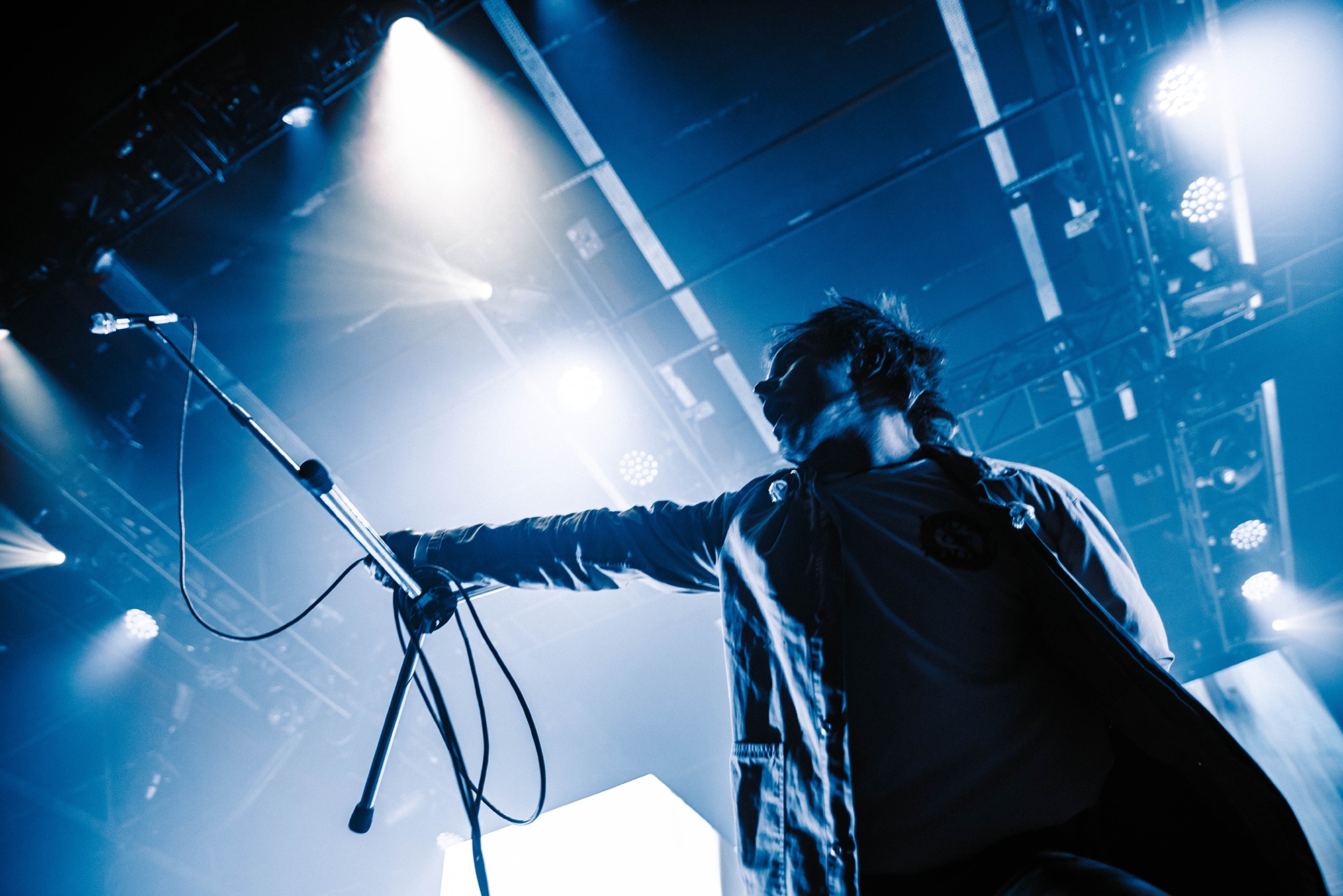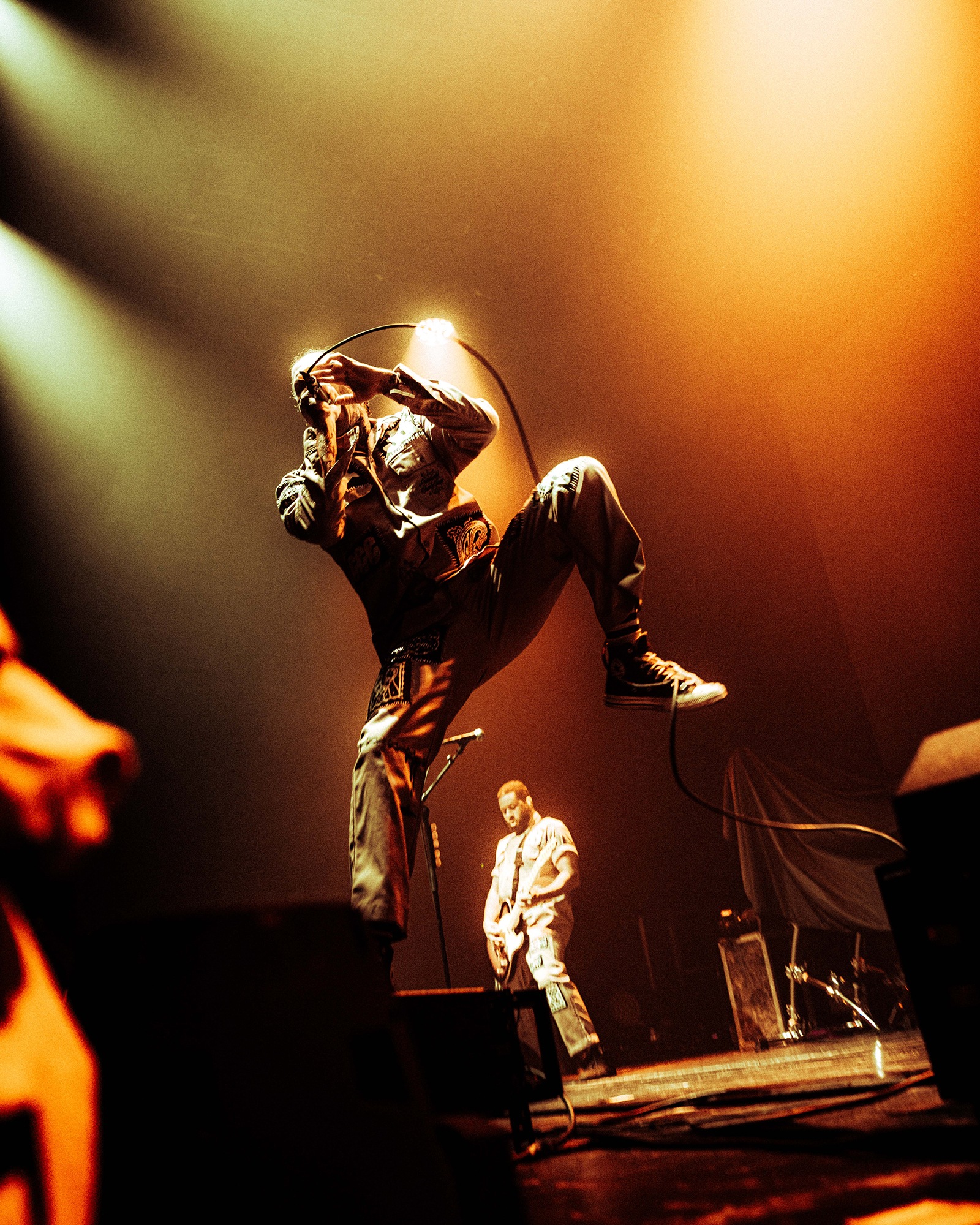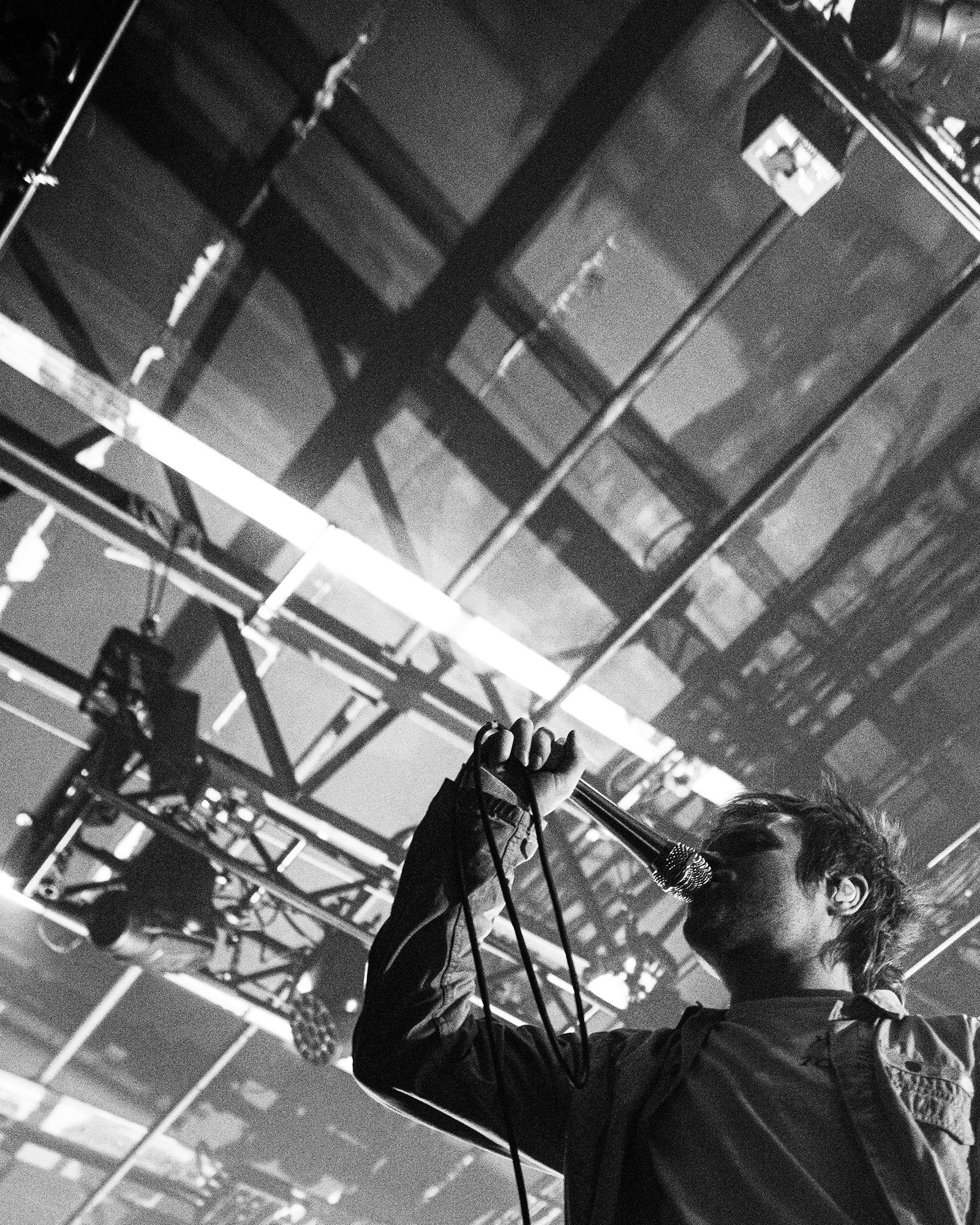 This is displayed no better than guitarist Rory Clewlow sliding down the ramp screen from the drum riser – they remain joyous and juvenile while also structured. The return of FEVER 333’s Jason Aalon Butler for colab track Losing My Grip escalates the energy in the room even further as he bundles about the stage like a fly bouncing off the edges in unpredictable chaos. Brief release is sought as Reynolds once again mounts the high-rise screen pillar for mellow renditions of T.I.N.A, Juggernauts and Gap In The Fence before the band return to complete the dance ending of the latter.
