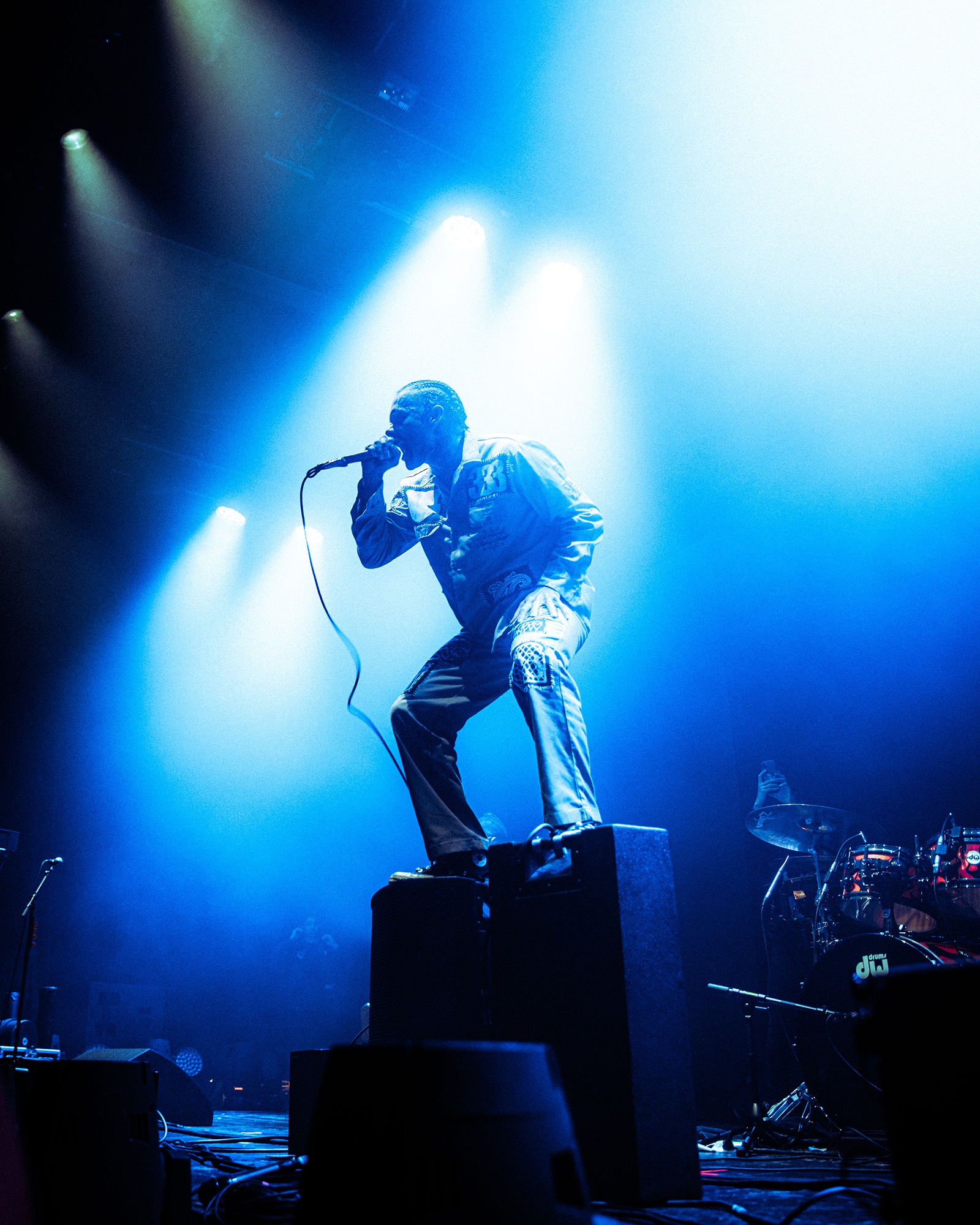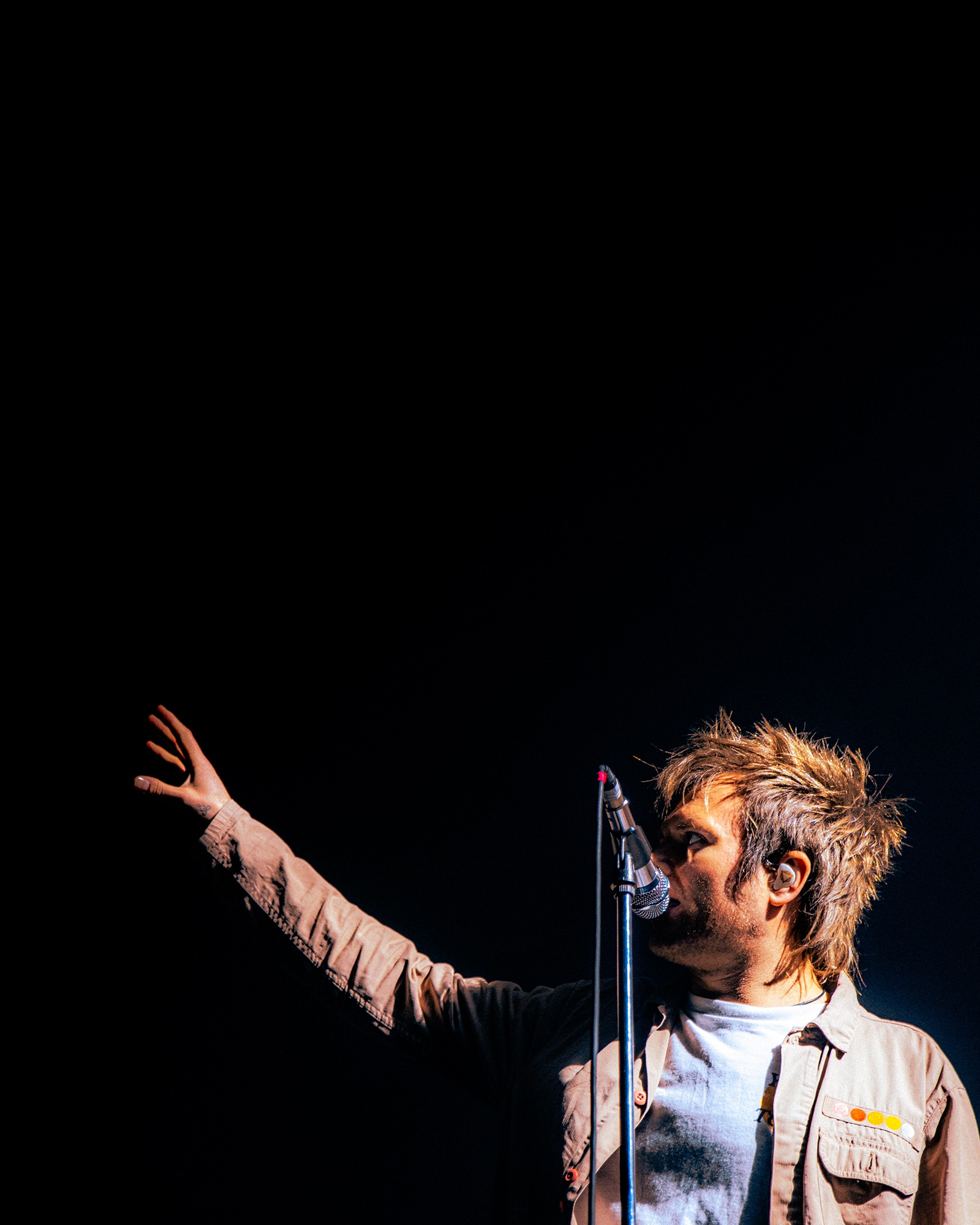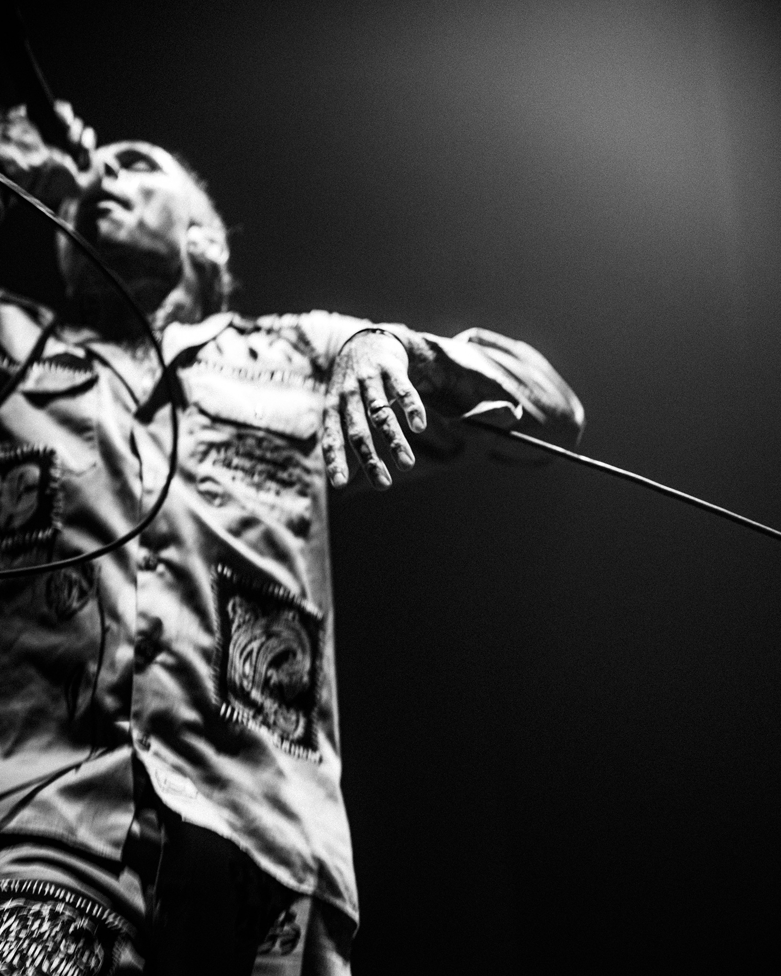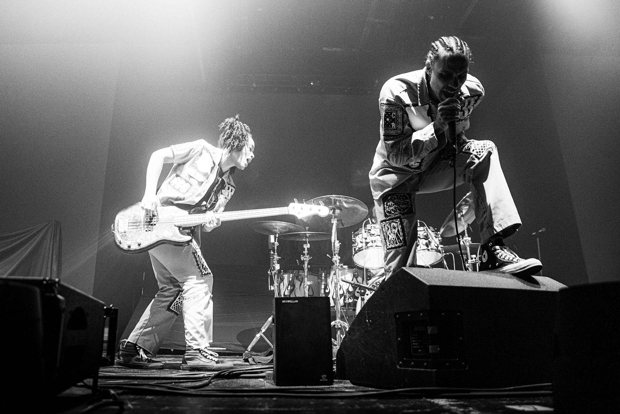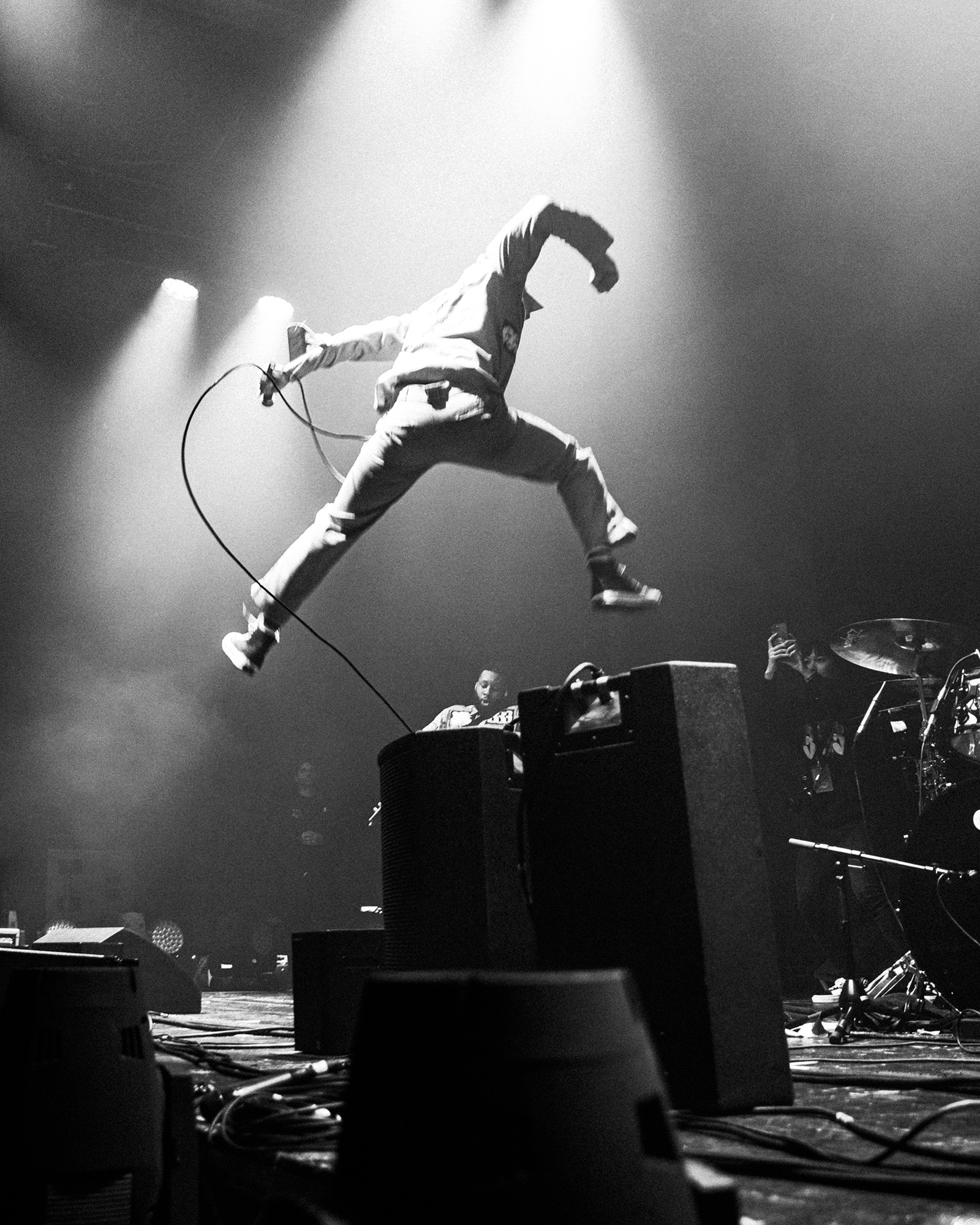 This is displayed no better than guitarist Rory Clewlow sliding down the ramp screen from the drum riser – they remain joyous and juvenile while also structured. The return of FEVER 333’s Jason Aalon Butler for colab track Losing My Grip escalates the energy in the room even further as he bundles about the stage like a fly bouncing off the edges in unpredictable chaos. Brief release is sought as Reynolds once again mounts the high-rise screen pillar for mellow renditions of T.I.N.A, Juggernauts and Gap In The Fence before the band return to complete the dance ending of the latter.
