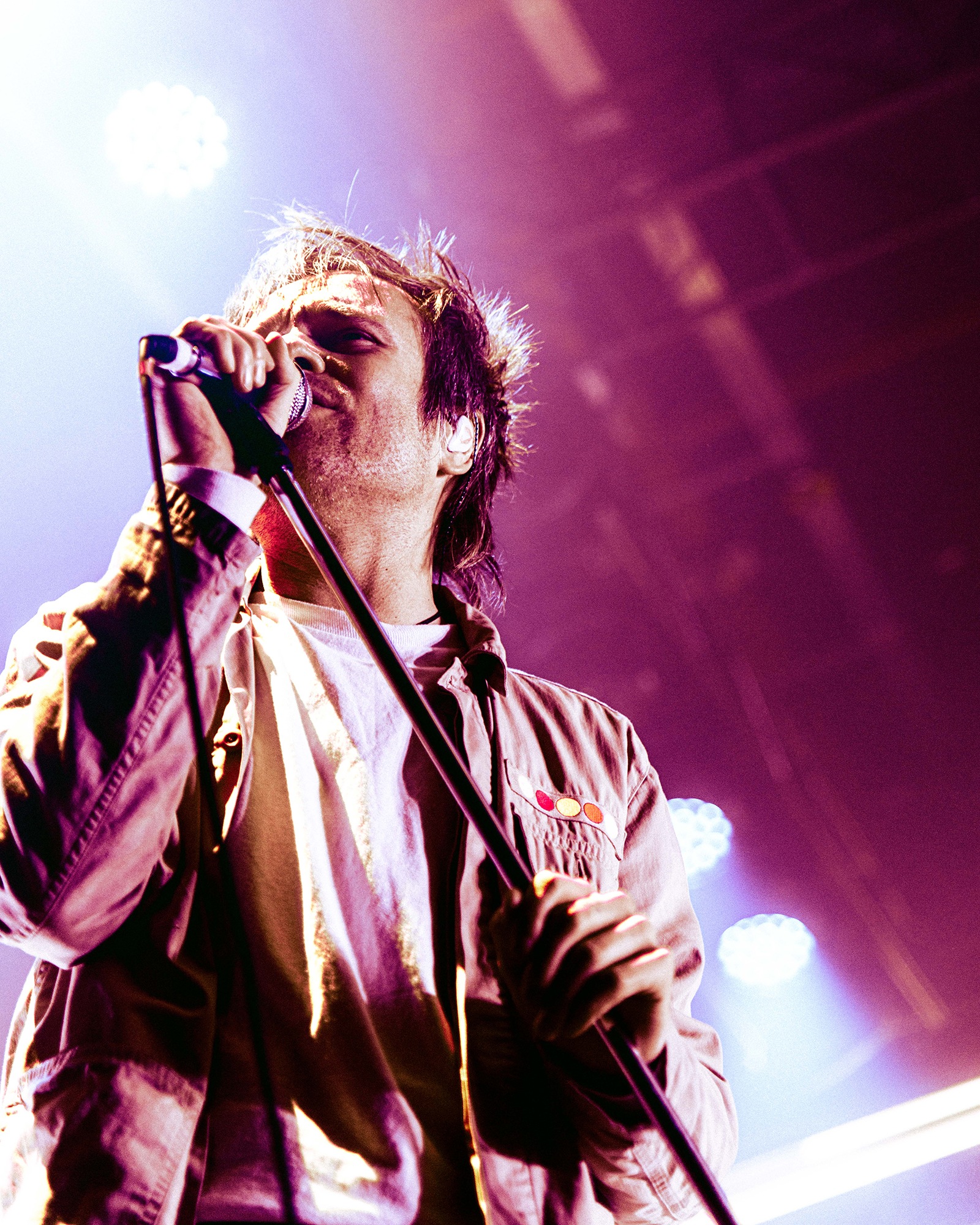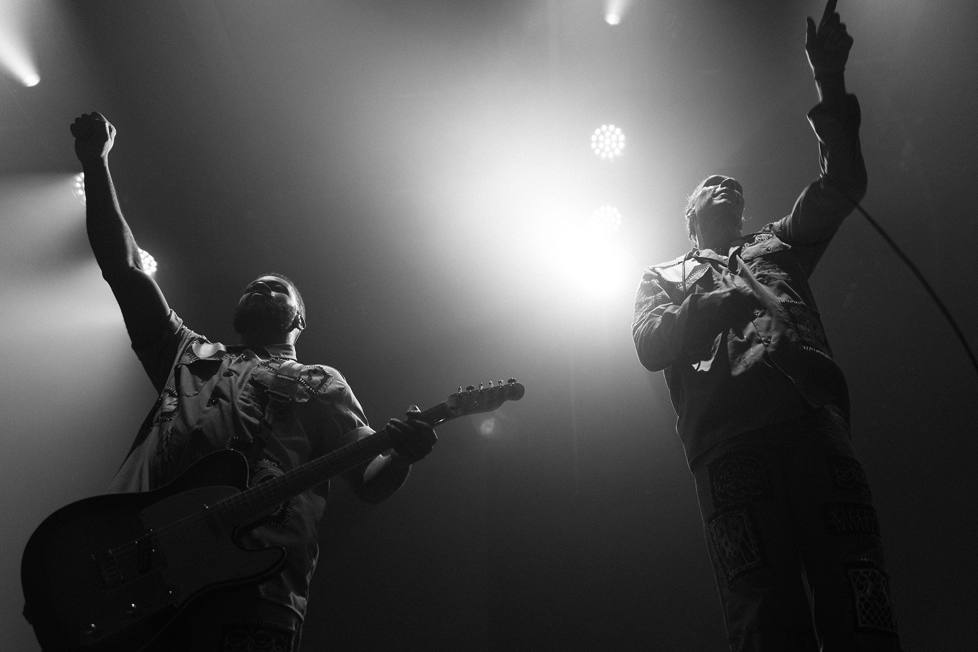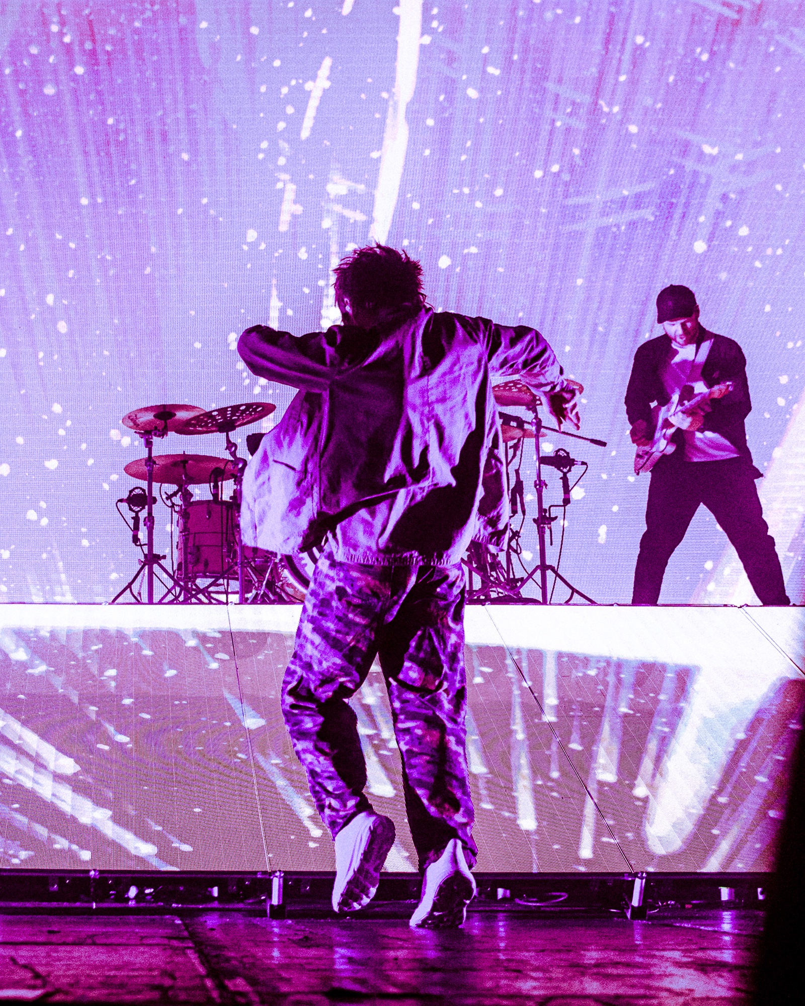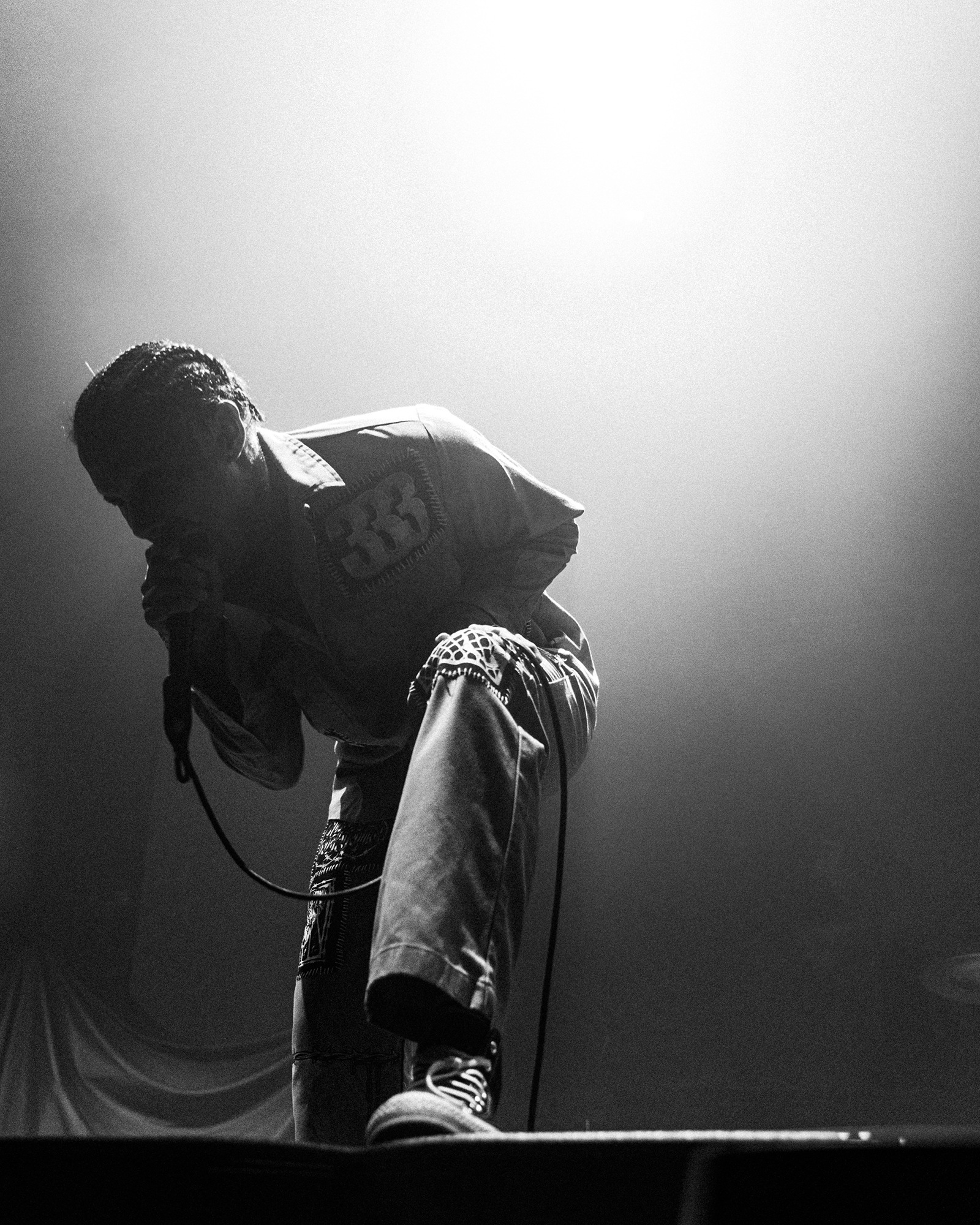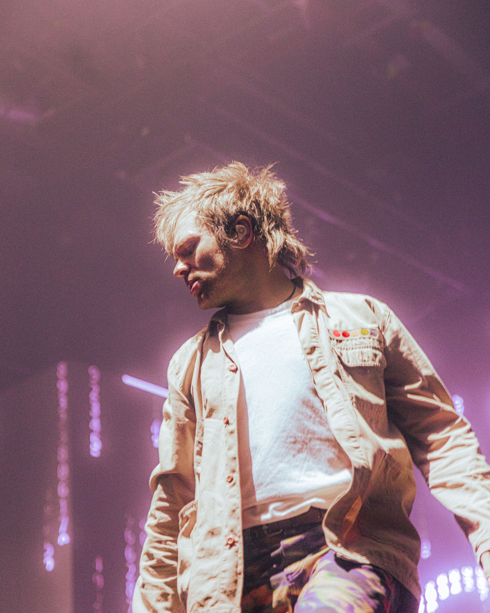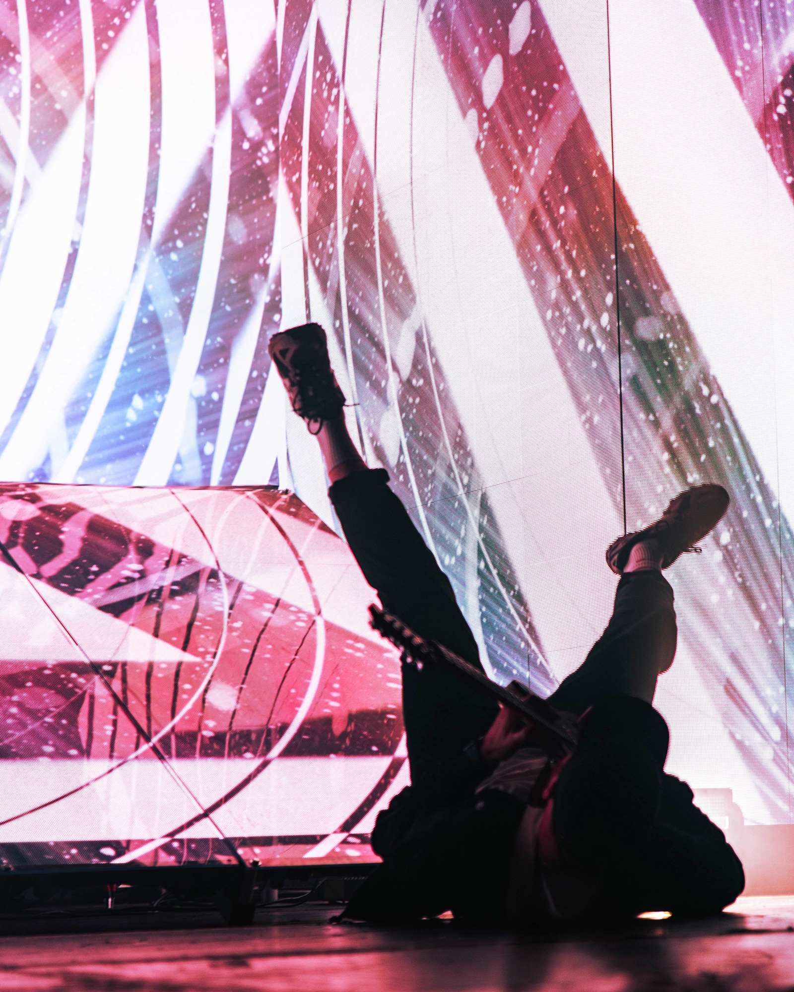 This is displayed no better than guitarist Rory Clewlow sliding down the ramp screen from the drum riser – they remain joyous and juvenile while also structured. The return of FEVER 333’s Jason Aalon Butler for colab track Losing My Grip escalates the energy in the room even further as he bundles about the stage like a fly bouncing off the edges in unpredictable chaos. Brief release is sought as Reynolds once again mounts the high-rise screen pillar for mellow renditions of T.I.N.A, Juggernauts and Gap In The Fence before the band return to complete the dance ending of the latter.