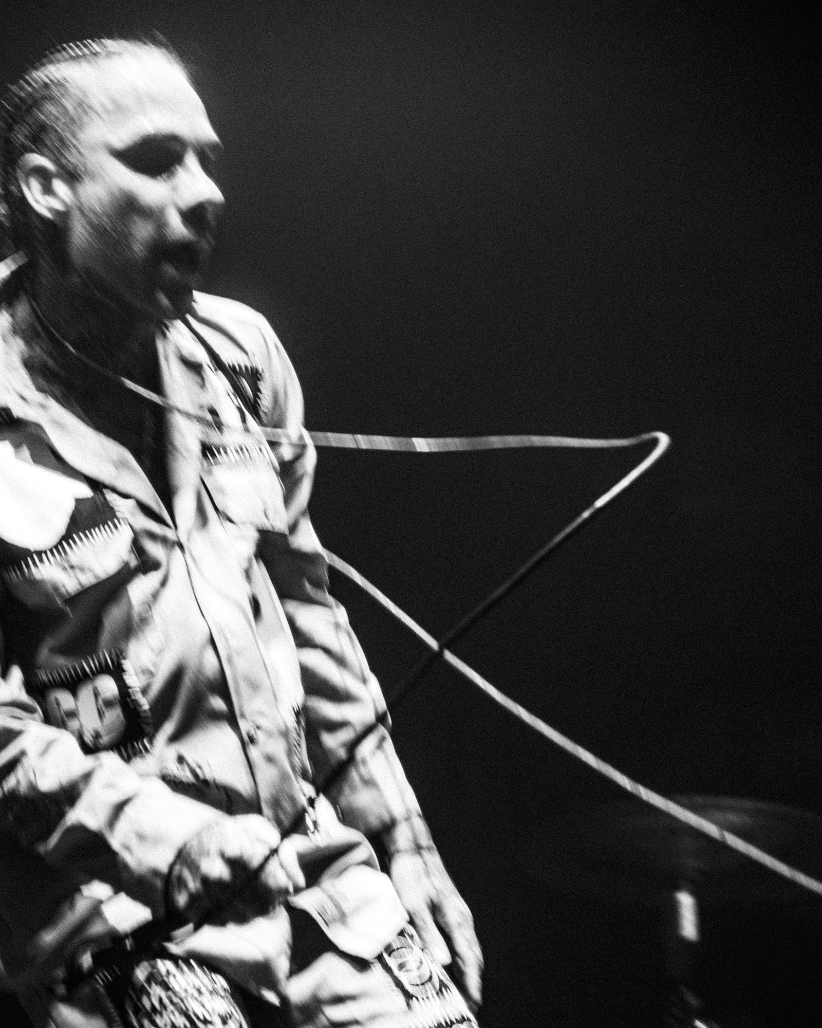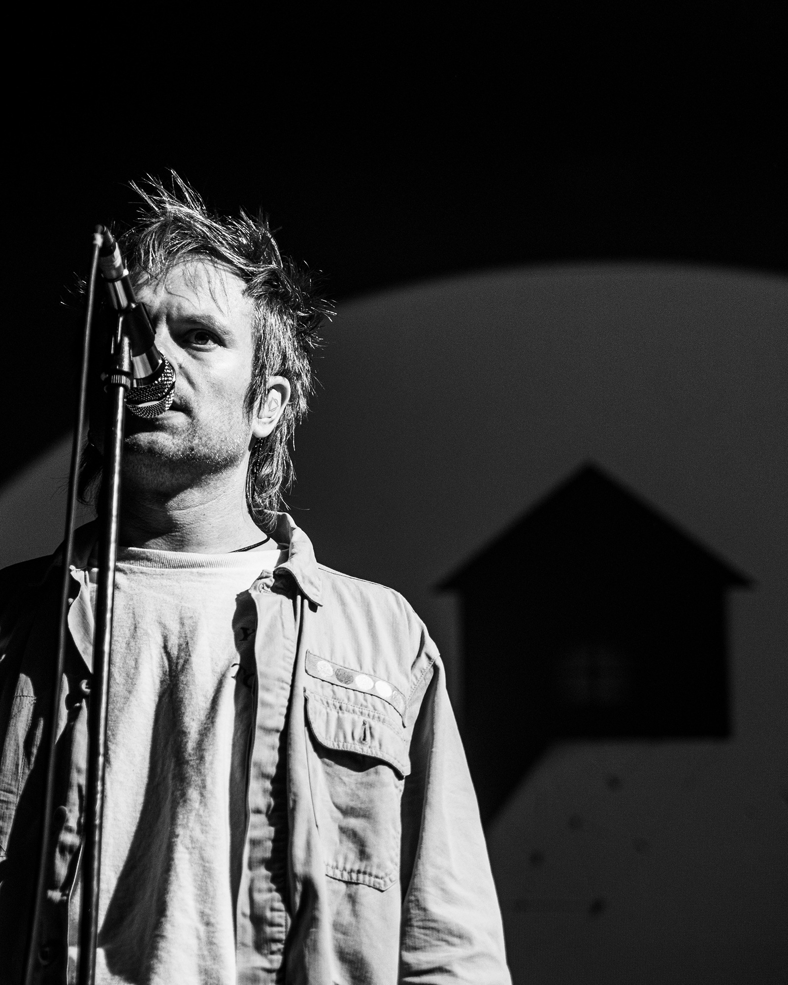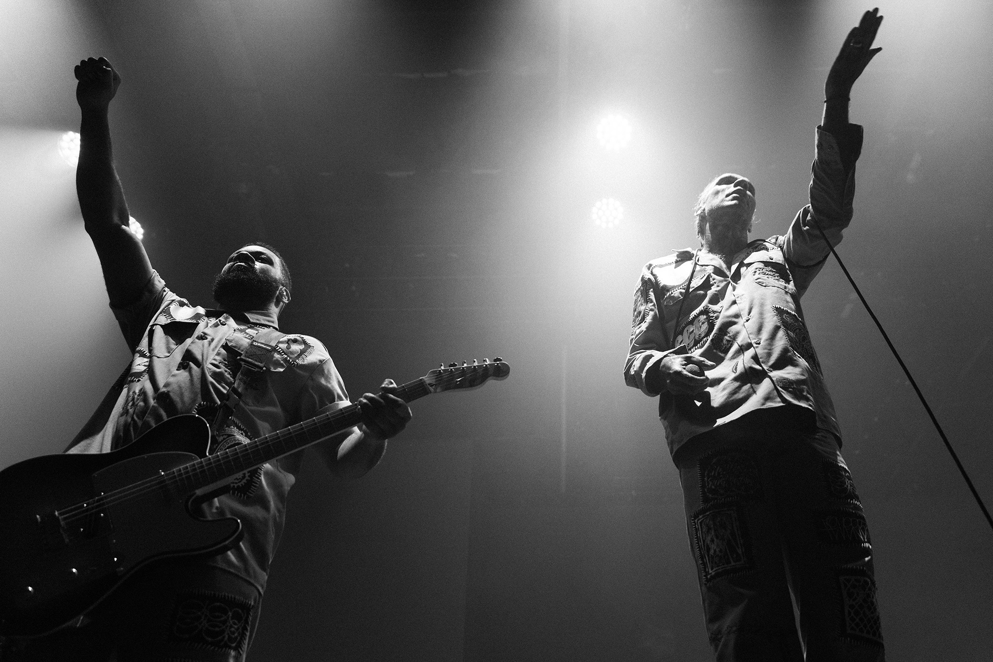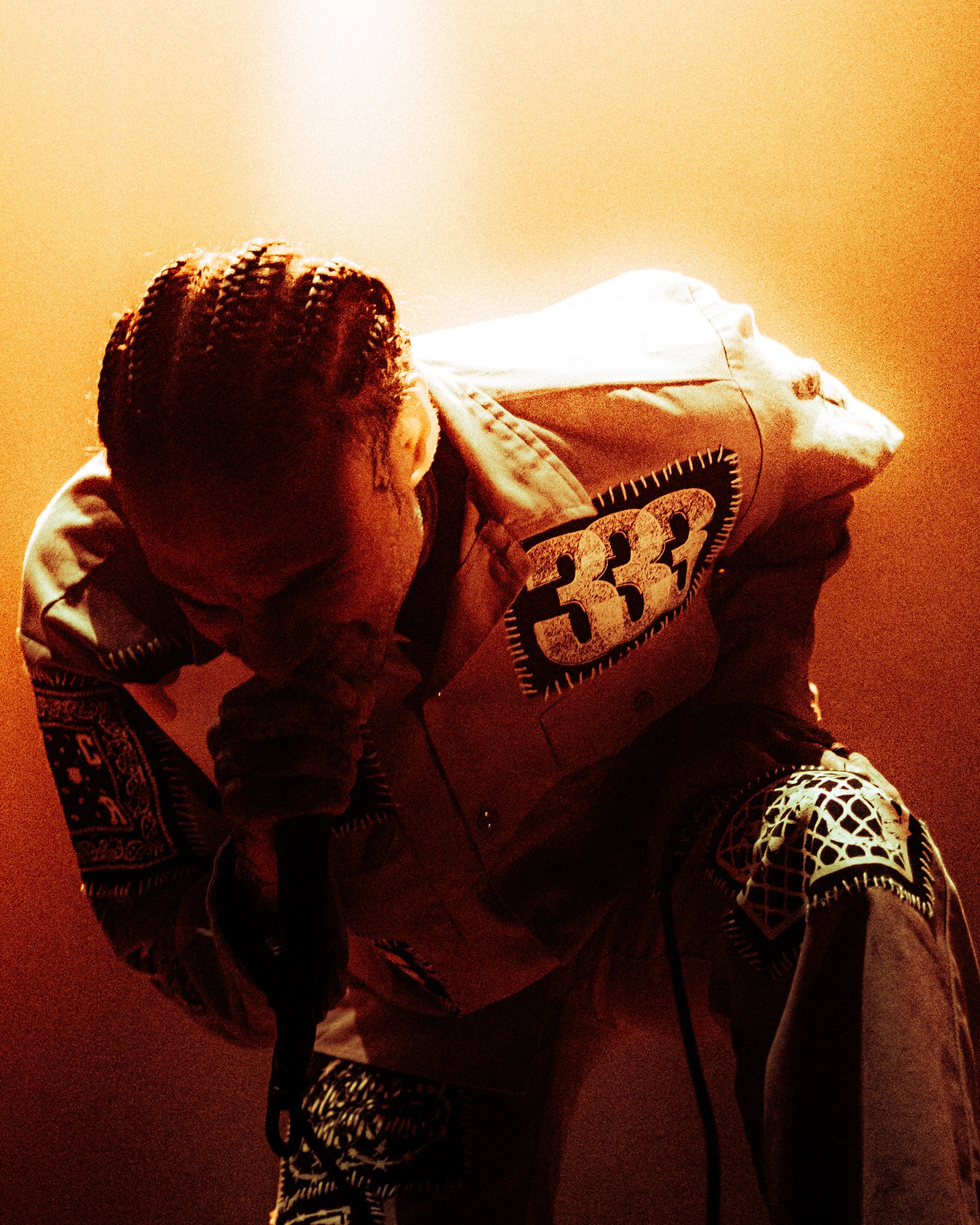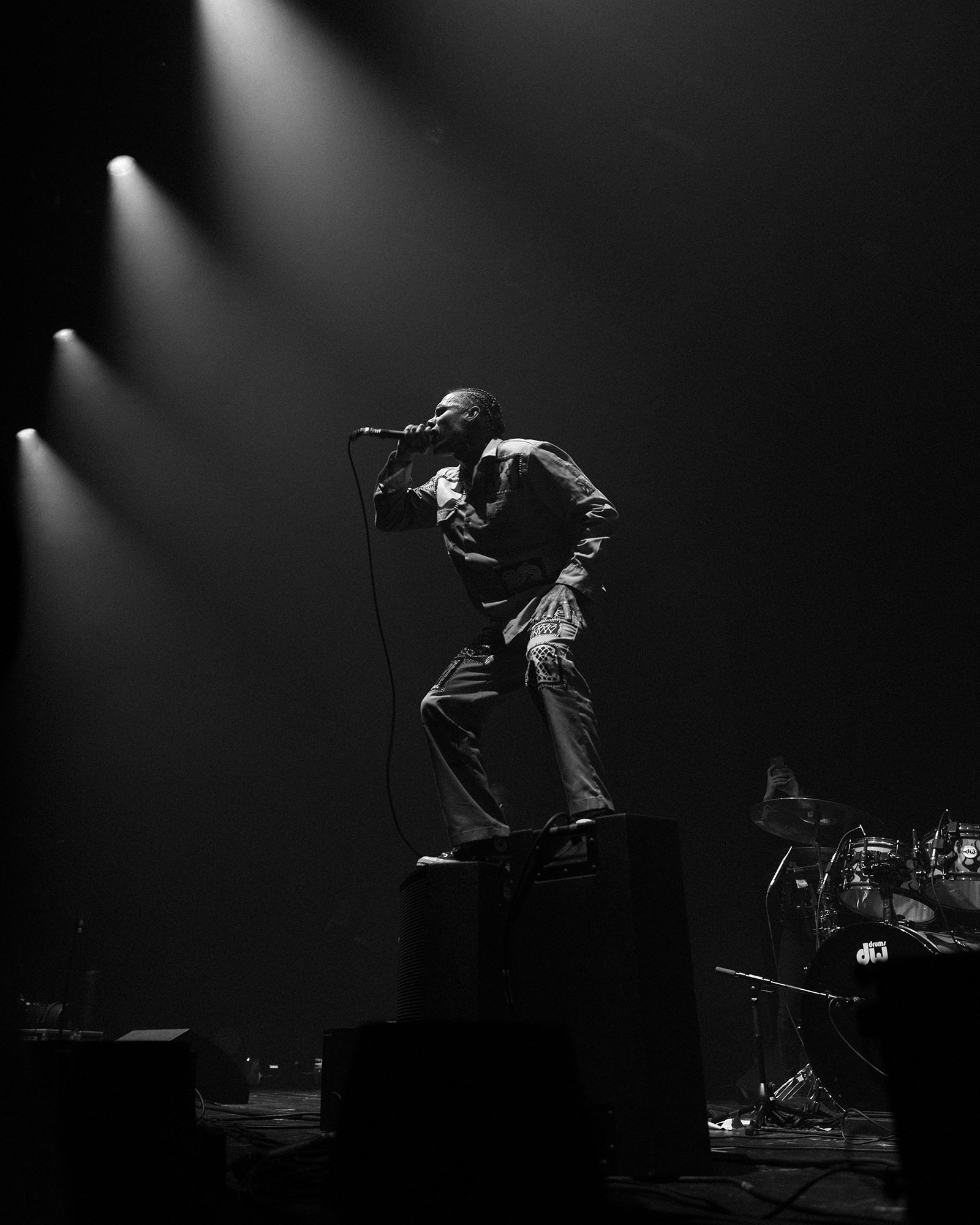 This is displayed no better than guitarist Rory Clewlow sliding down the ramp screen from the drum riser – they remain joyous and juvenile while also structured. The return of FEVER 333’s Jason Aalon Butler for colab track Losing My Grip escalates the energy in the room even further as he bundles about the stage like a fly bouncing off the edges in unpredictable chaos. Brief release is sought as Reynolds once again mounts the high-rise screen pillar for mellow renditions of T.I.N.A, Juggernauts and Gap In The Fence before the band return to complete the dance ending of the latter.