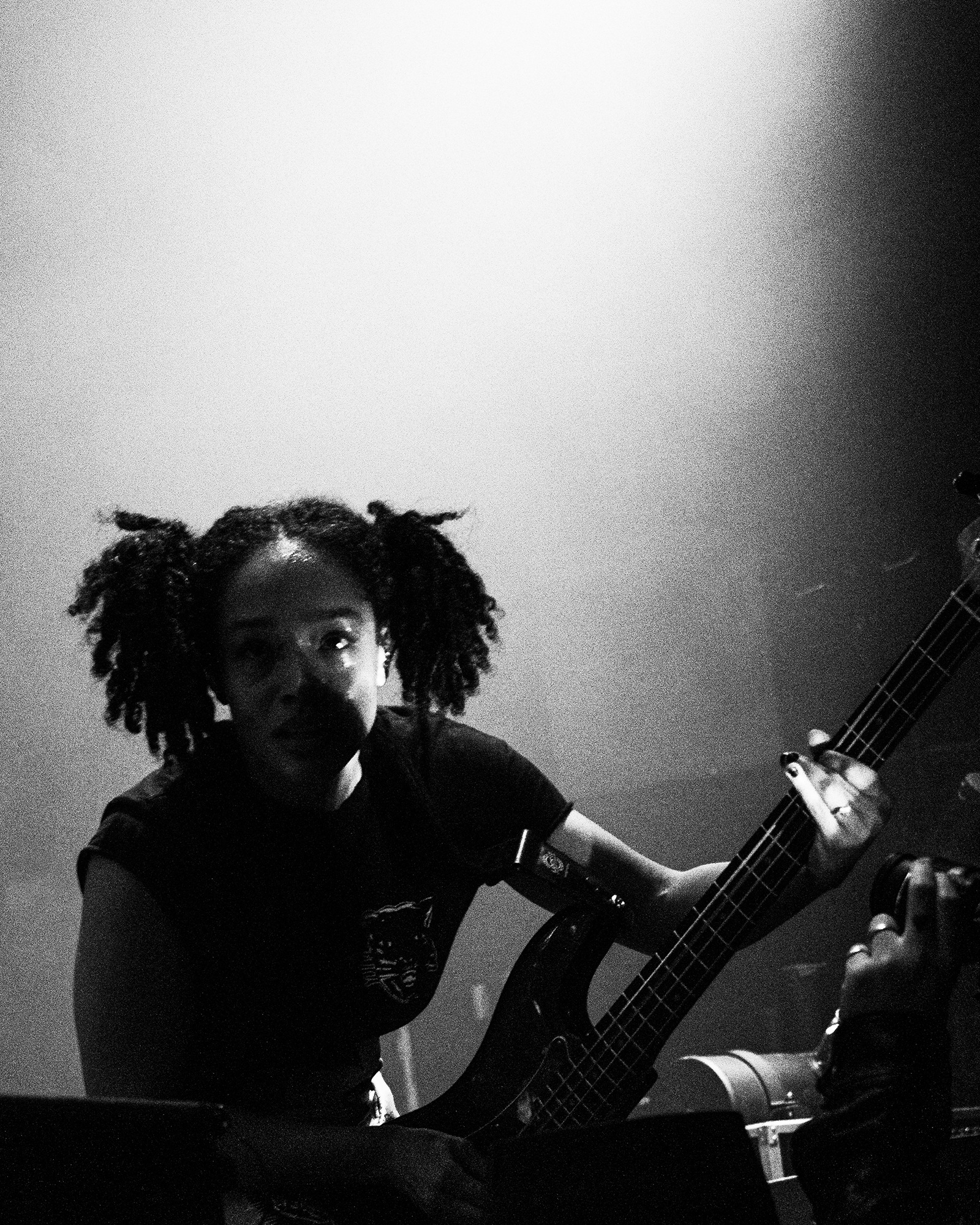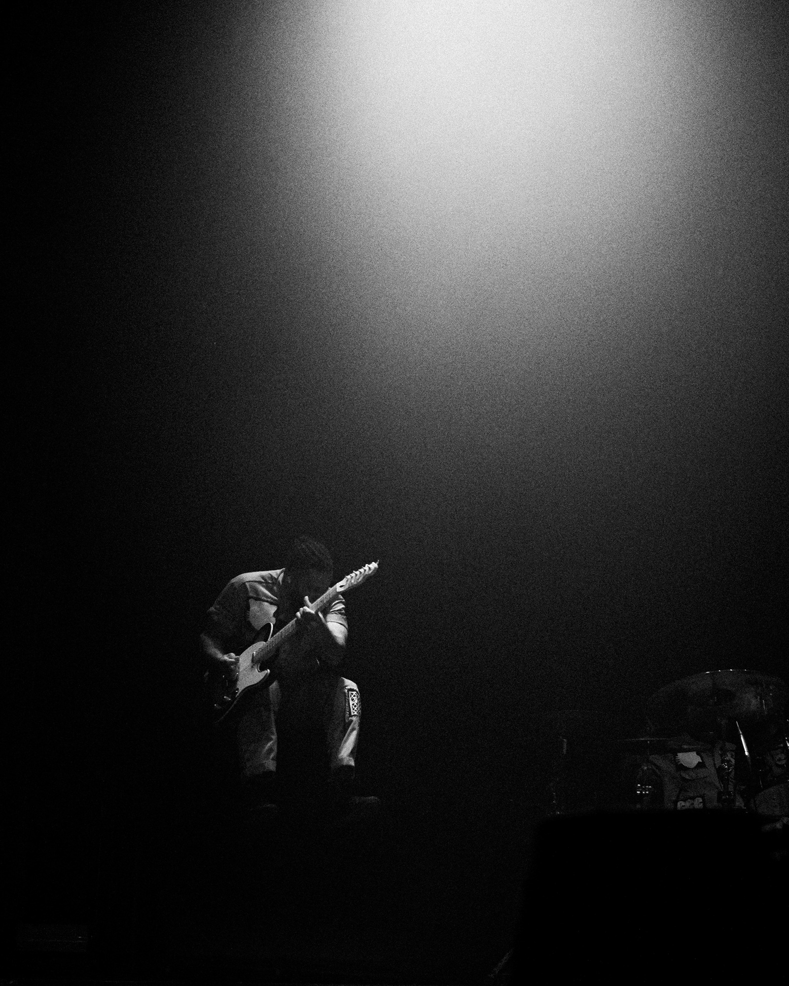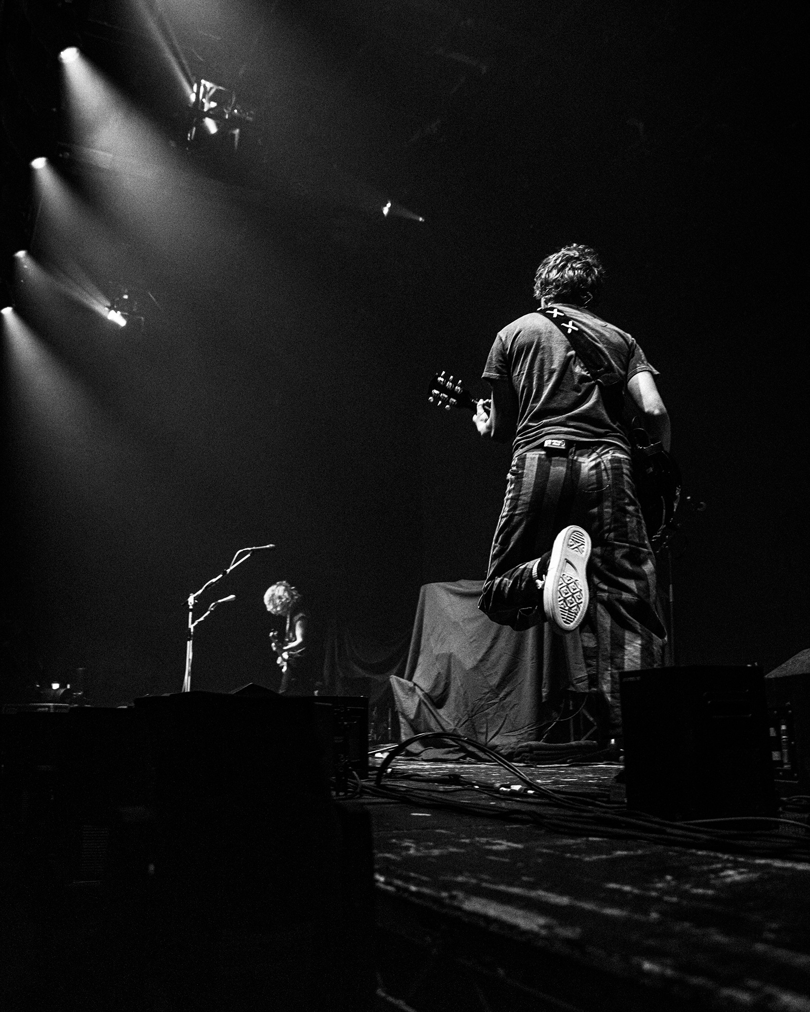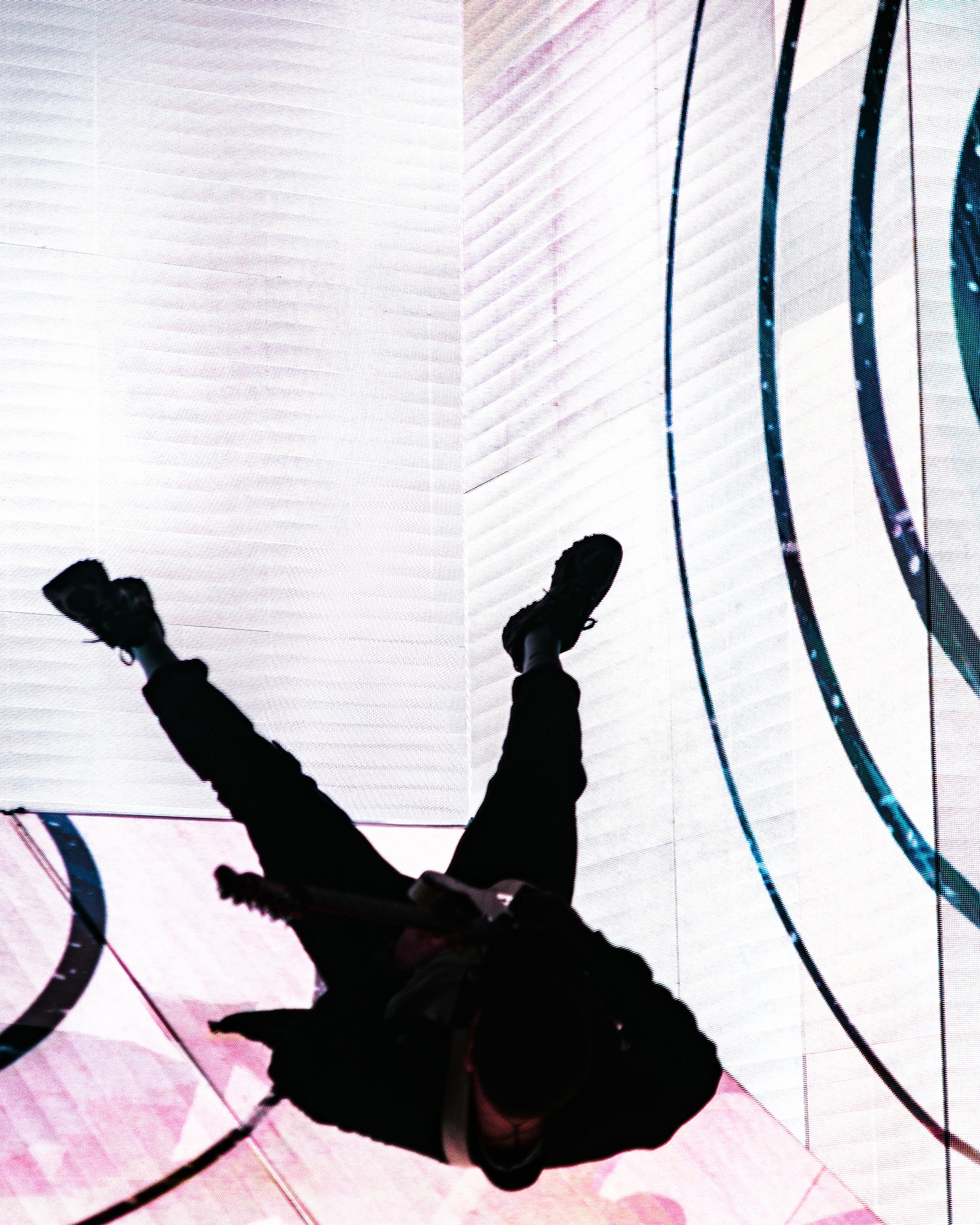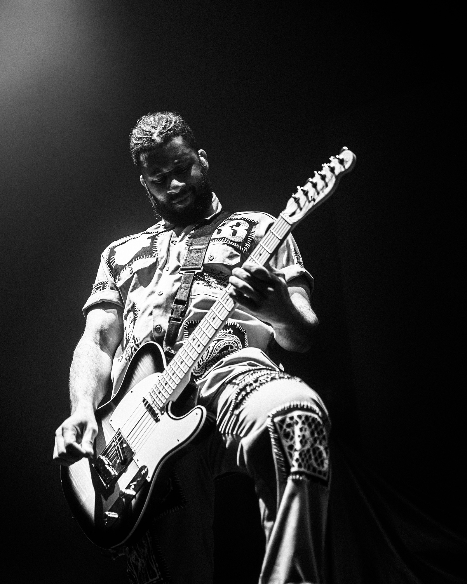 This is displayed no better than guitarist Rory Clewlow sliding down the ramp screen from the drum riser – they remain joyous and juvenile while also structured. The return of FEVER 333’s Jason Aalon Butler for colab track Losing My Grip escalates the energy in the room even further as he bundles about the stage like a fly bouncing off the edges in unpredictable chaos. Brief release is sought as Reynolds once again mounts the high-rise screen pillar for mellow renditions of T.I.N.A, Juggernauts and Gap In The Fence before the band return to complete the dance ending of the latter.