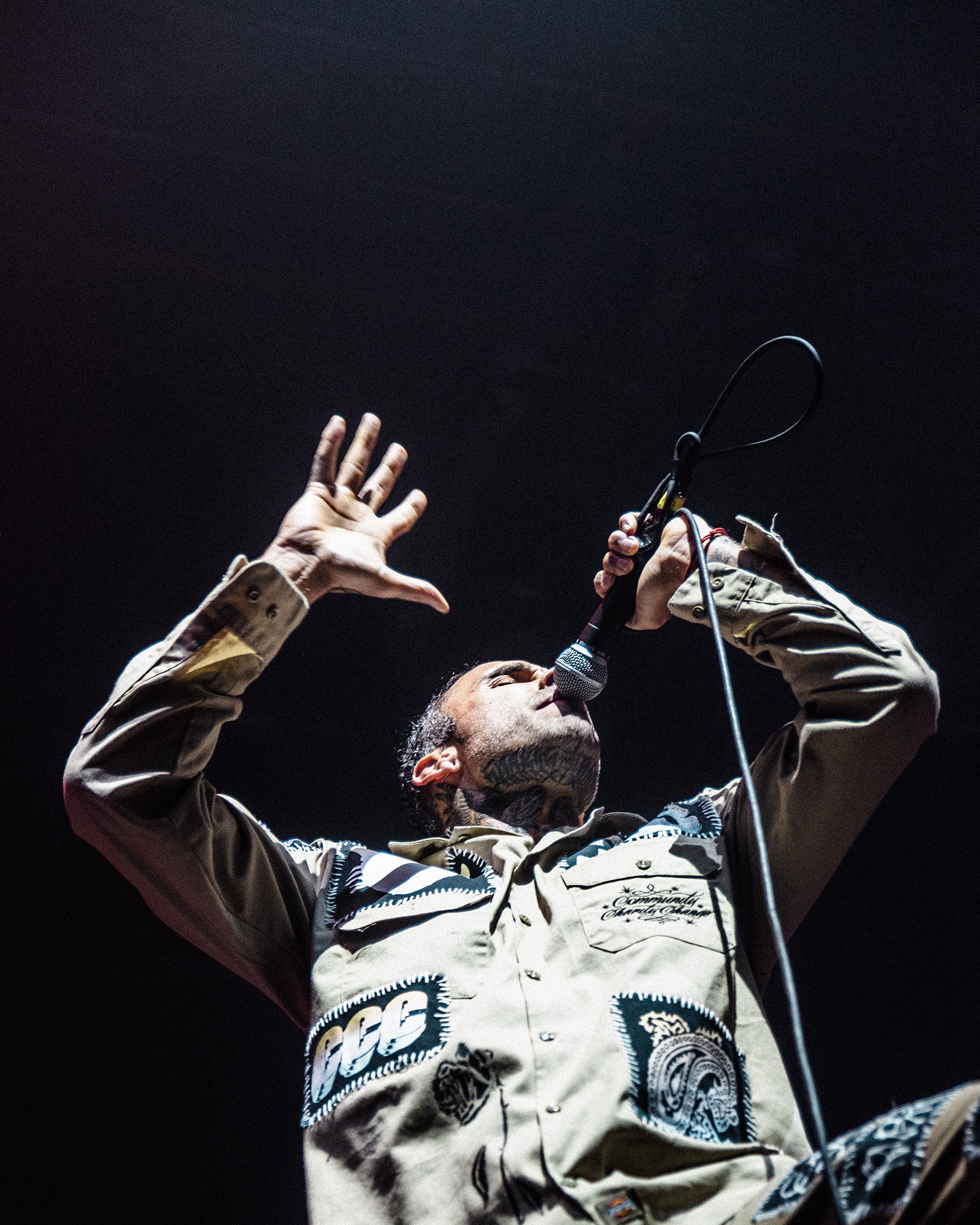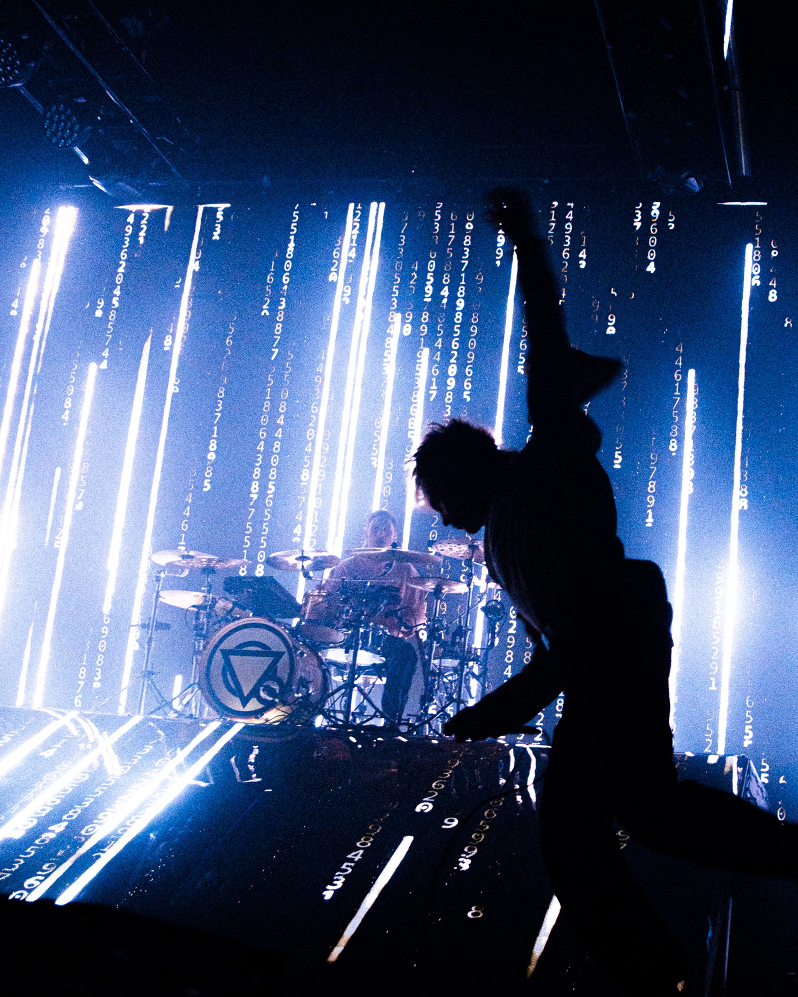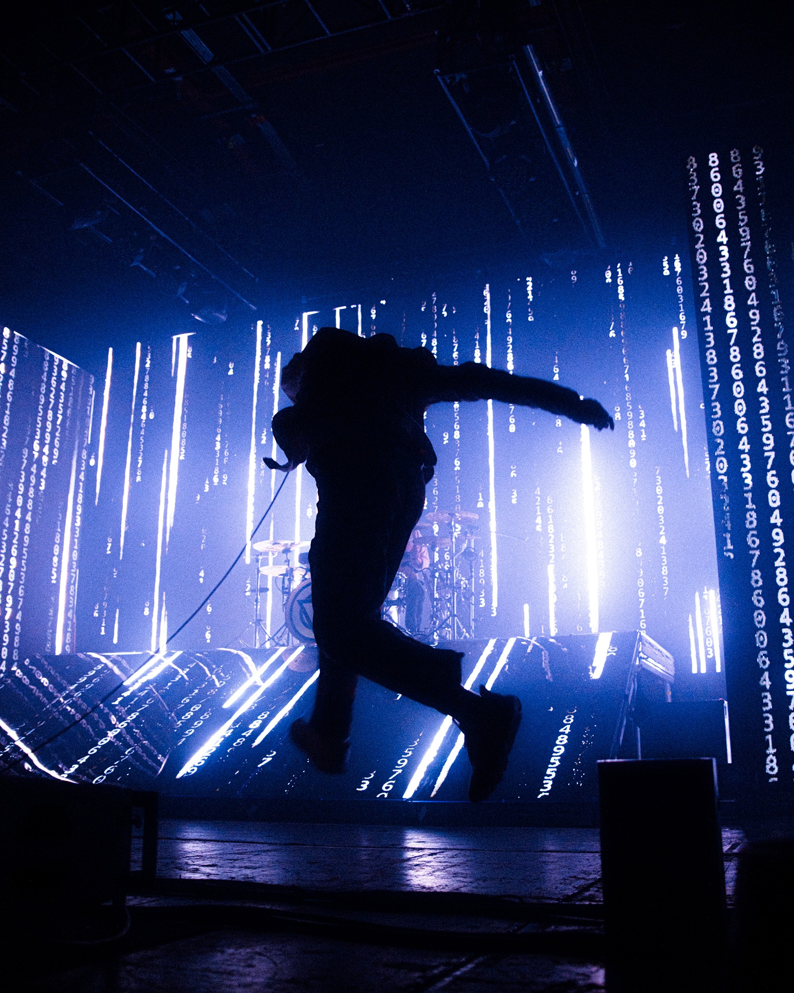 For any other group, following a performance like that of FEVER 333 would be an unenviable task, but when you’re a group who invest in their live show in the manner ENTER SHIKARI do, this is a gauntlet they are more than equipped to face. The ever-dramatic vocalist Rou Reynolds emerges in solitude for a monologue rendition of System… and it is now that we first see the extend of the screens that are the entire stage, with an animation accompanying the poignant tale. As it flows into …Meltdown, typical SHIKARI chaos ensues, the room no longer filled with bodies but a fluid membrane ebbing and flowing around mosh pits.