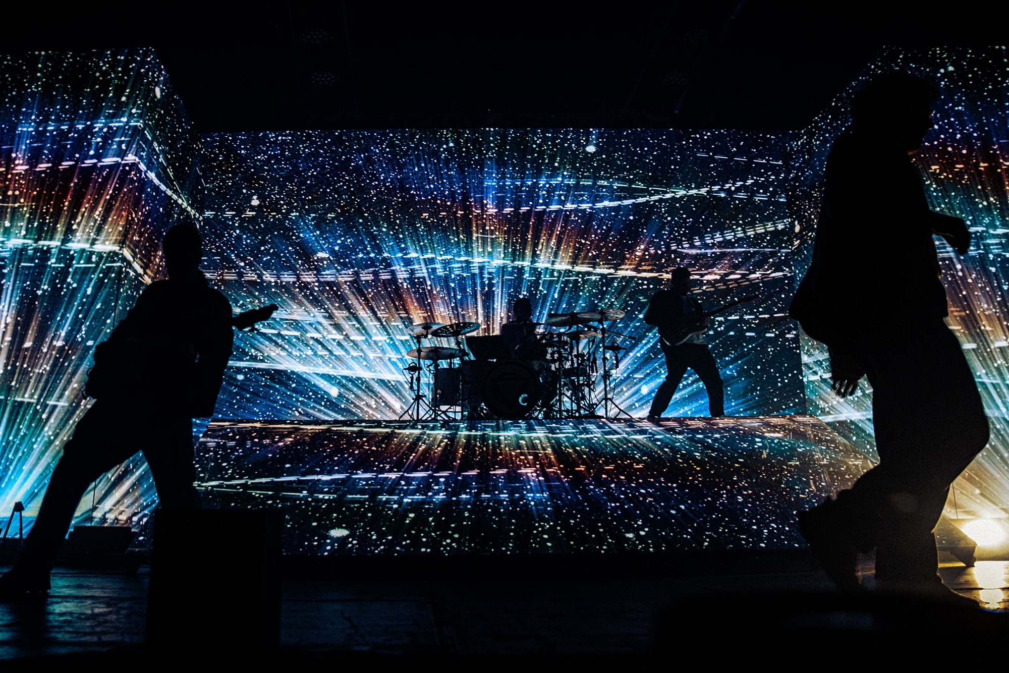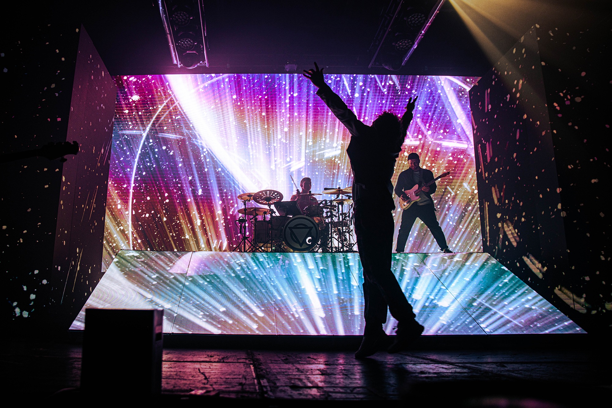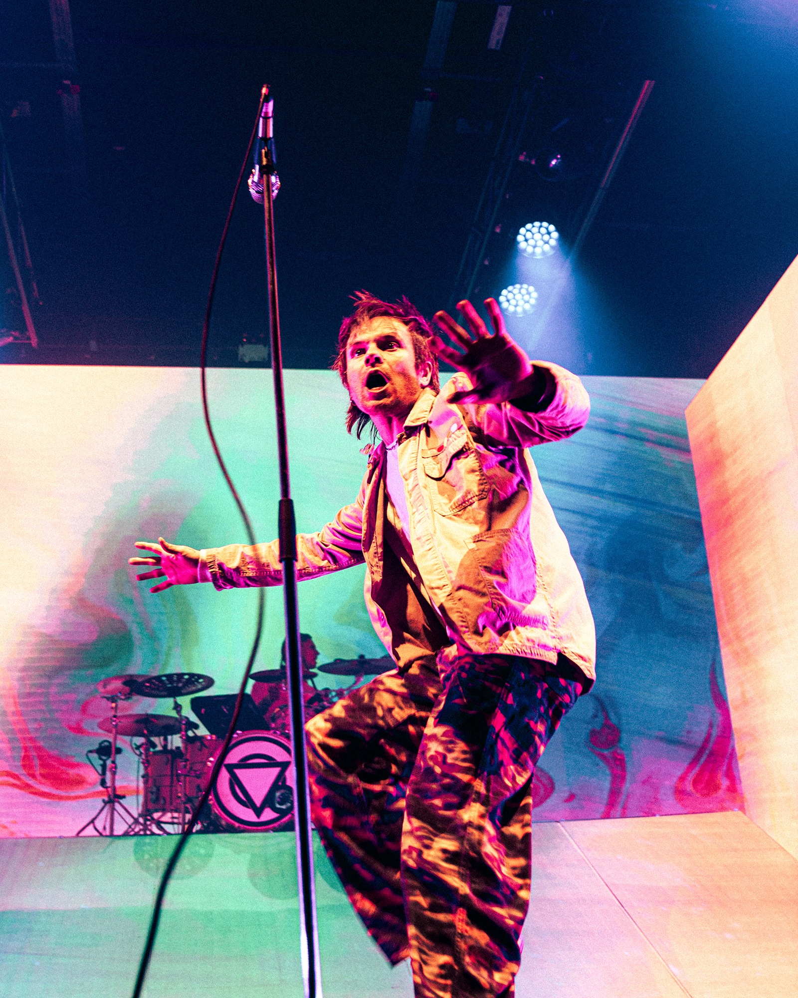 Few groups approach live music like the St Albans four piece, with constant switches and remixes of their own tracks to keep you on your toes. Following fan favourite Anaesthetist, Reynolds queries “Shall we test this sound system out?” before dropping into a filthy dubstep remix where we see the lasers for the first time in tandem with the choreographed lights and screens, a sensory onslaught that encases your whole body. The drama they have packaged into this masterclass is encapsulating, encasing the stage in beams of light acting as prison bars for Reynolds to rupture in Jailbreak, falling into a pool of water from the top of the towering screens before It Hurts, or a museum-set tour of all of their albums, we are taken on a journey tonight through every album, every emotion all encompassed by a whole lot of joy.