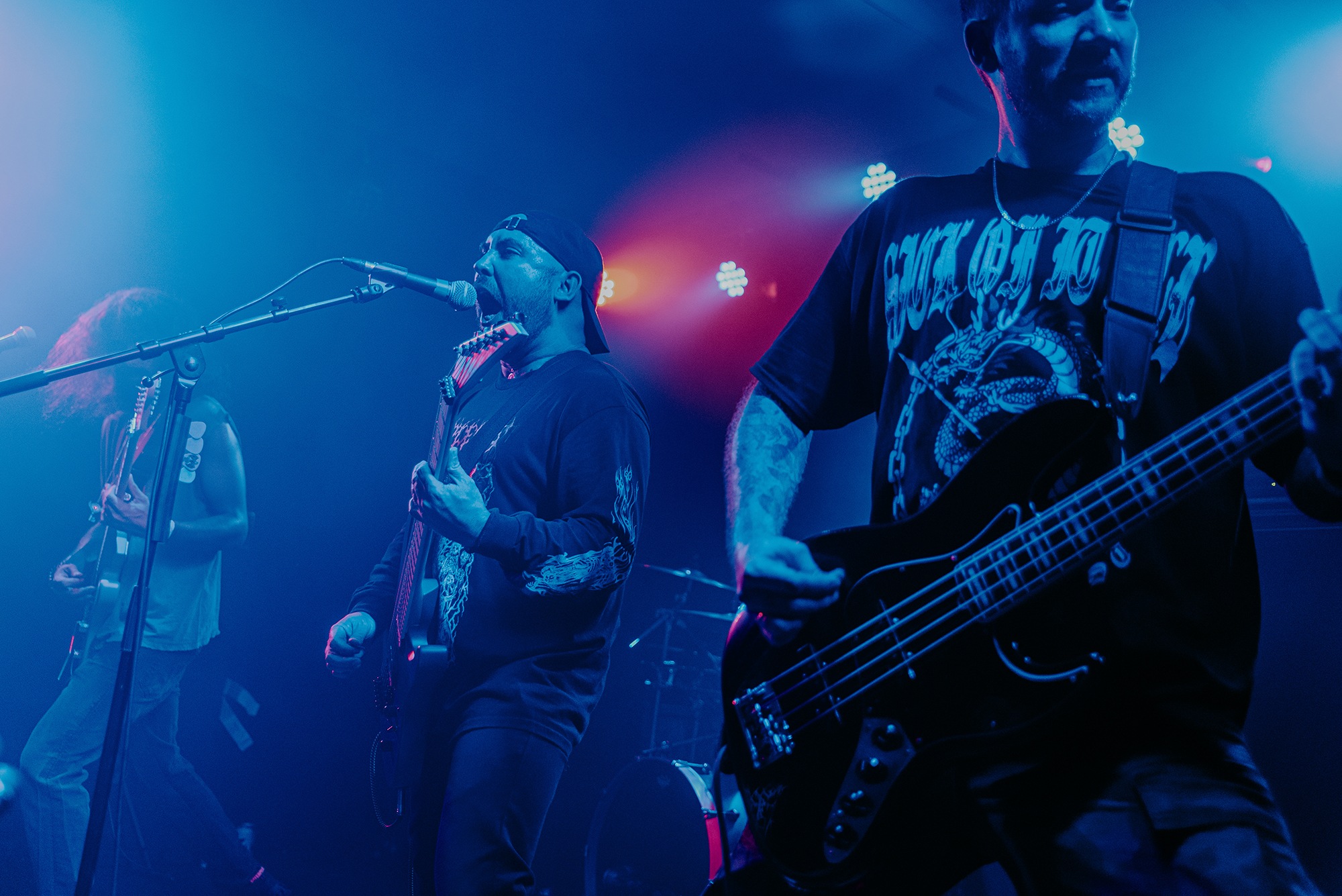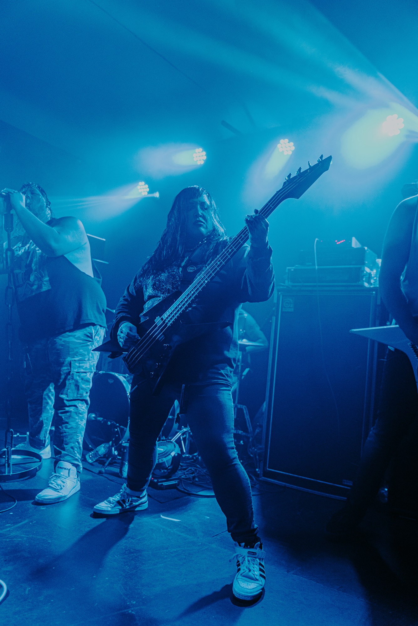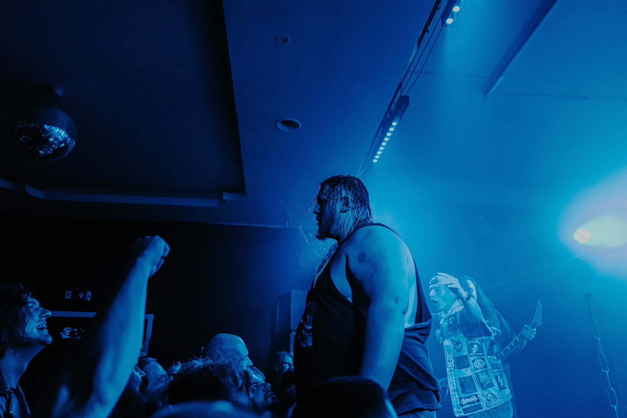 The presence of WALLOWING’s Church Road labelmates CELESTIAL SANCTUARY on this bill feels wholly inevitable. The Cambridge four-piece have supported just about every big death metal band that’s come to town in the last two years, and they’re a well-oiled machine at this point. “Are you ready for some death metal?” asks vocalist Tom Cronin as the band take to the stage – of course – to TENPOLE TUDOR’s Swords Of A Thousand Men. He gets an immediate answer as they kick off with Rid The Gormless, the opener of their 2021 debut full-length received ravenously with circle pitting, two-stepping and even a wall of death.
