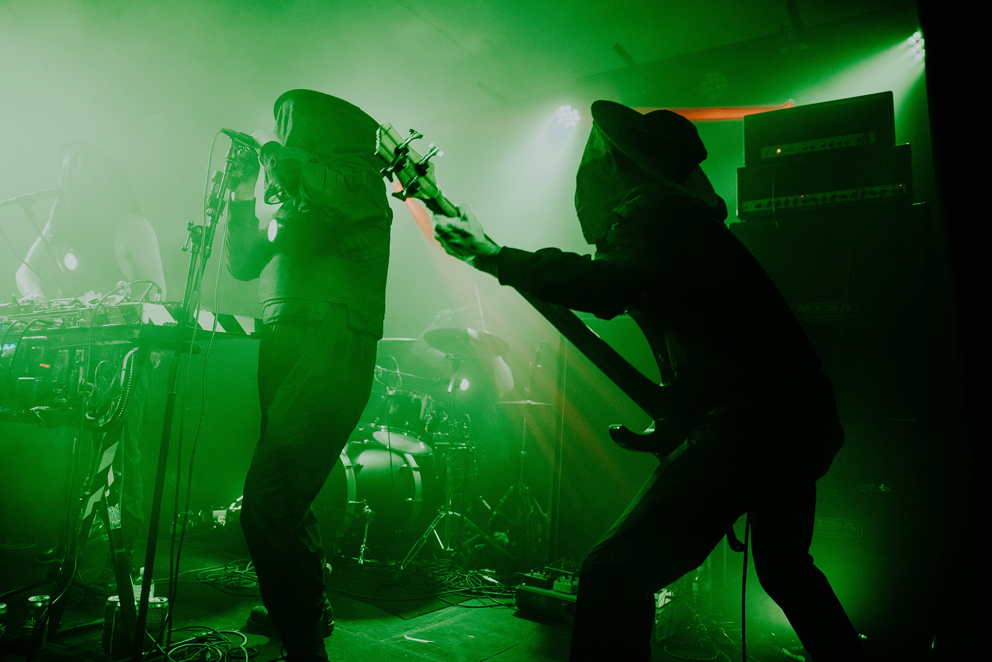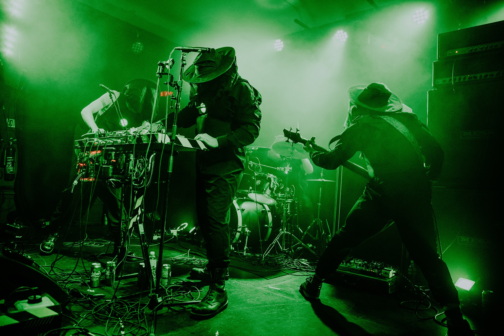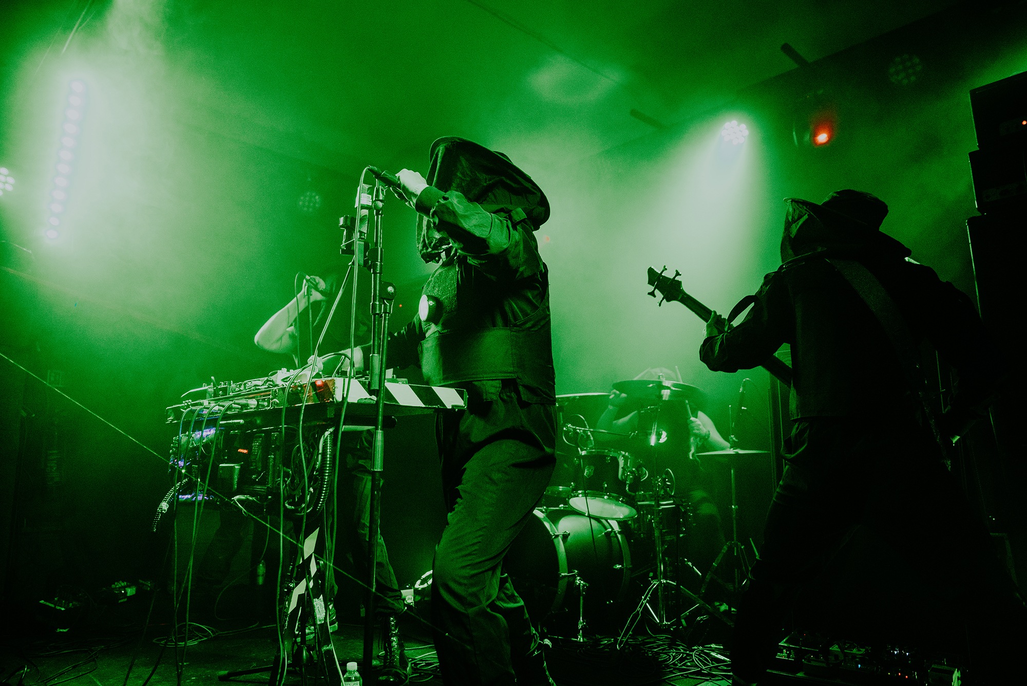 The first of these are Brighton extreme metallers WALLOWING, armed with a new album of their own in the form of the Church Road Records-released Earth Reaper. Bathed in green light and dressed as the nastiest group of beekeepers you’ve ever seen, the five-piece are mesmerically intense, with their dual vocalists Mark Roberts and Zak Duffield pouring scorn – and smoke – upon an already well-filled room. They’re only on for half an hour, but they use 20-plus minutes of that to play the title track from their new album, generally sticking to a slow doomy trudge punctuated by occasional bursts of blackened and punky intensity. It’s immersive and imposing, if not a little meandering at points, but either way you’d be hard-pressed to find a body in the room that doesn’t leave with a significant and lasting impression of the Brightonians.