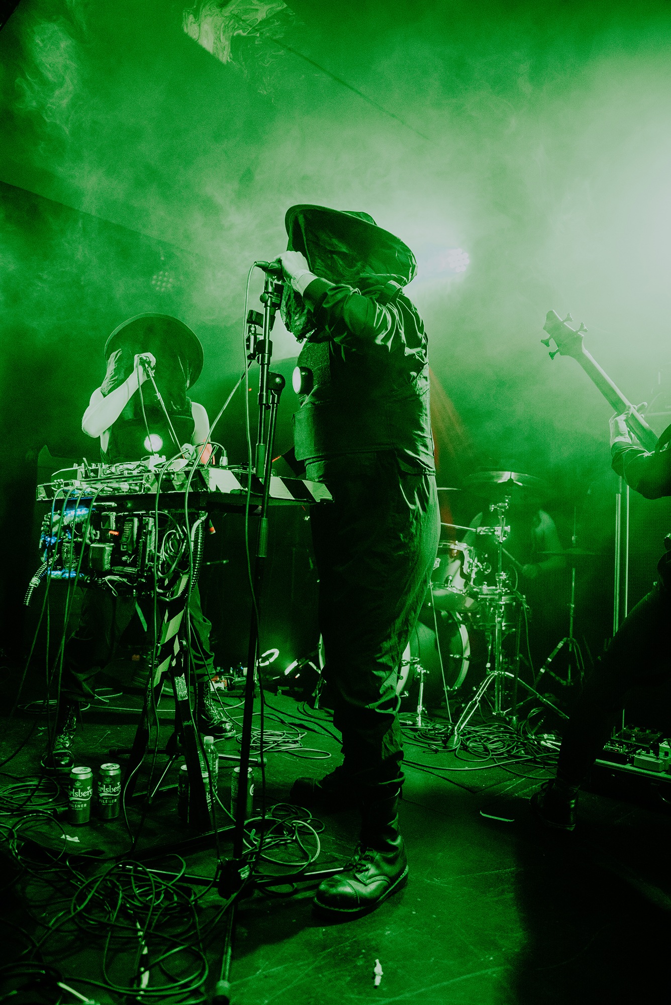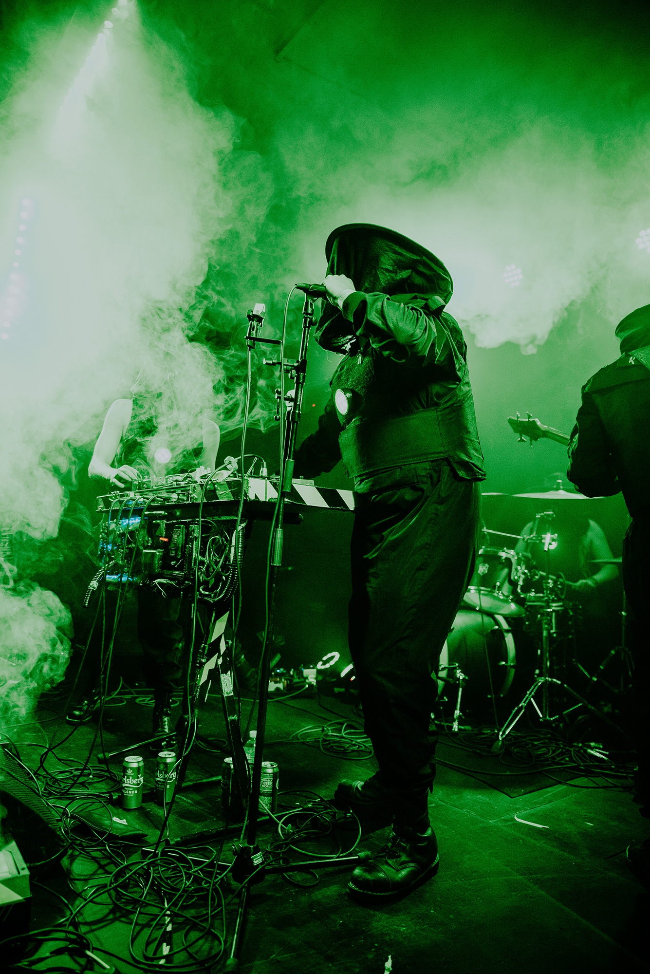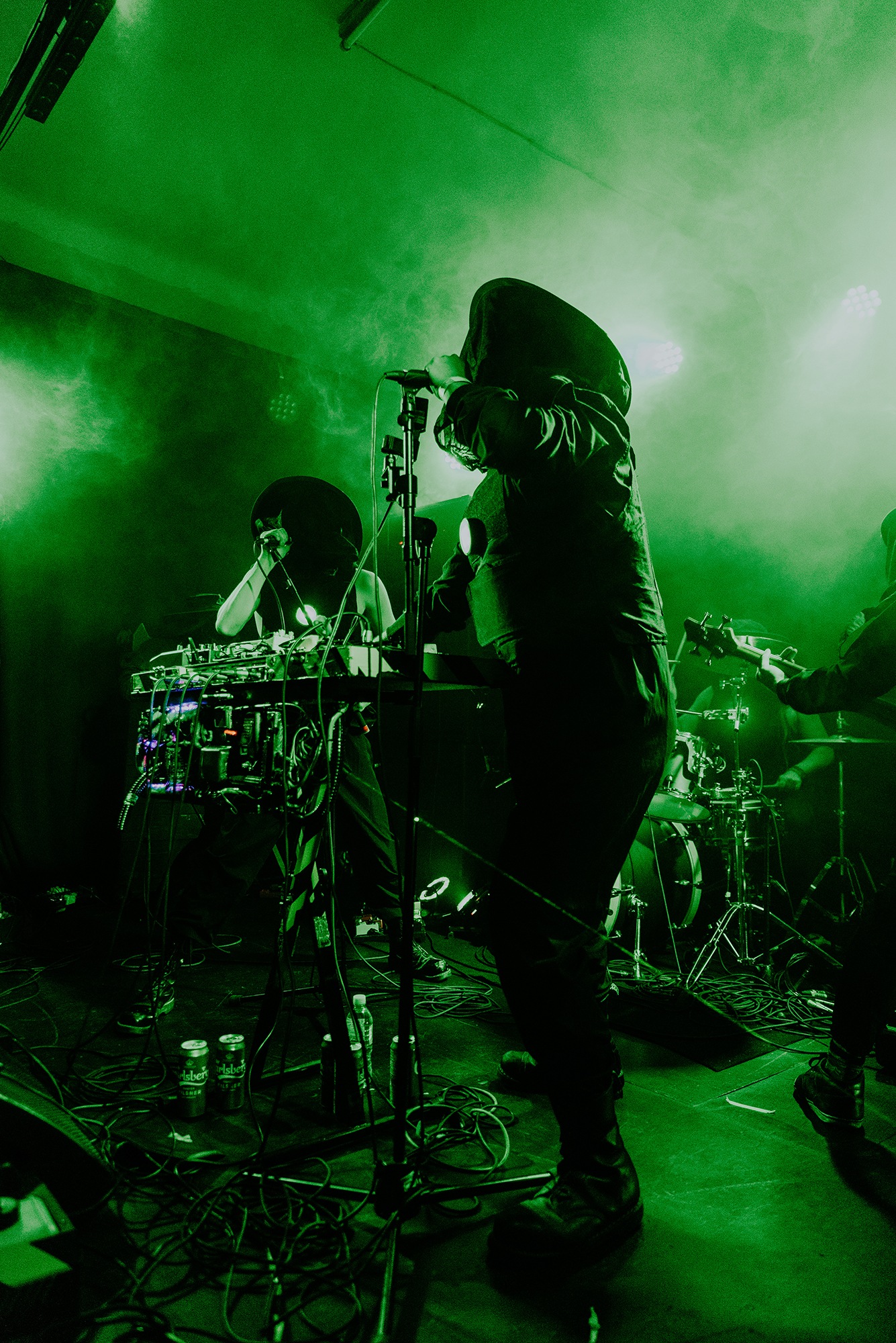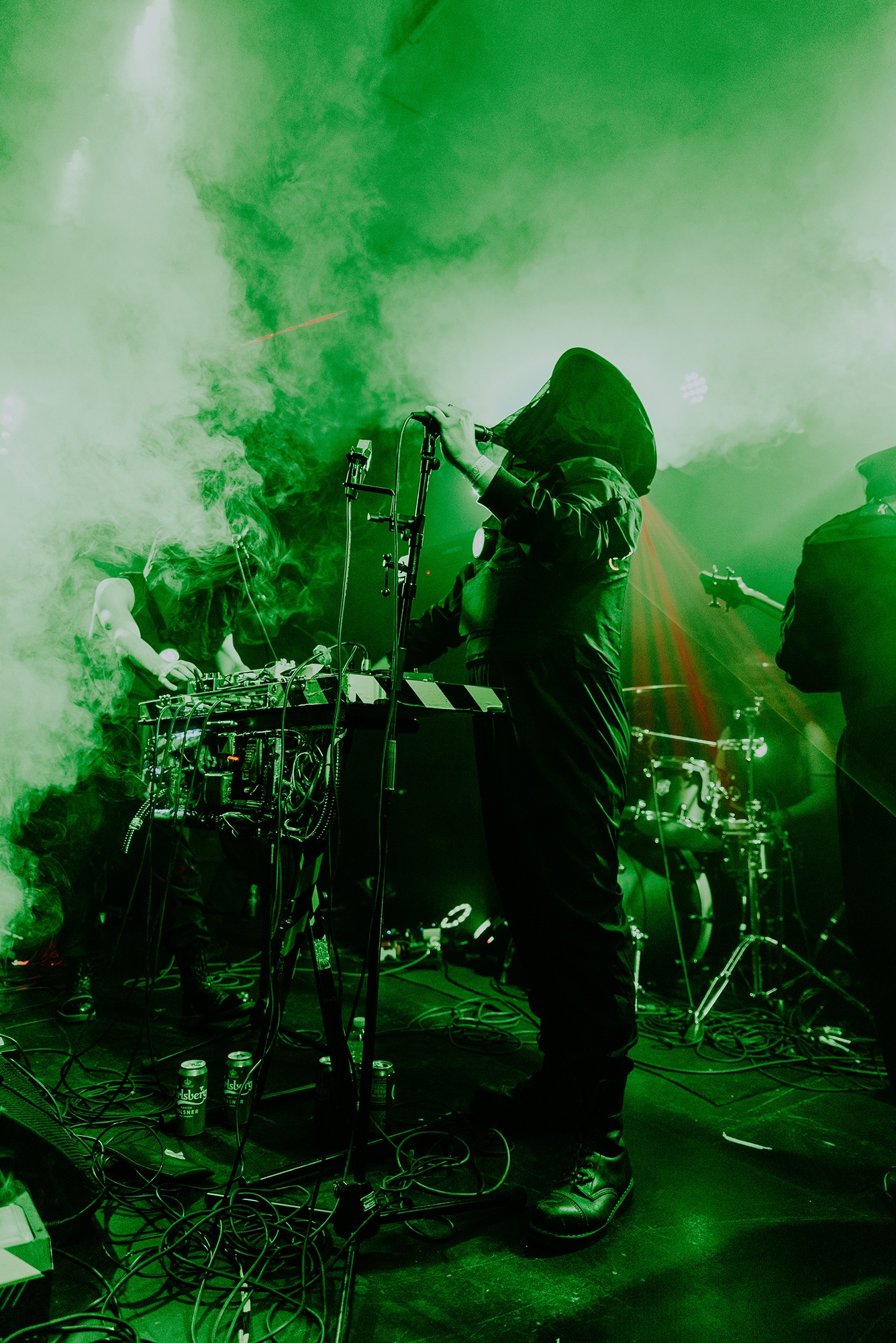 The first of these are Brighton extreme metallers WALLOWING, armed with a new album of their own in the form of the Church Road Records-released Earth Reaper. Bathed in green light and dressed as the nastiest group of beekeepers you’ve ever seen, the five-piece are mesmerically intense, with their dual vocalists Mark Roberts and Zak Duffield pouring scorn – and smoke – upon an already well-filled room. They’re only on for half an hour, but they use 20-plus minutes of that to play the title track from their new album, generally sticking to a slow doomy trudge punctuated by occasional bursts of blackened and punky intensity. It’s immersive and imposing, if not a little meandering at points, but either way you’d be hard-pressed to find a body in the room that doesn’t leave with a significant and lasting impression of the Brightonians.