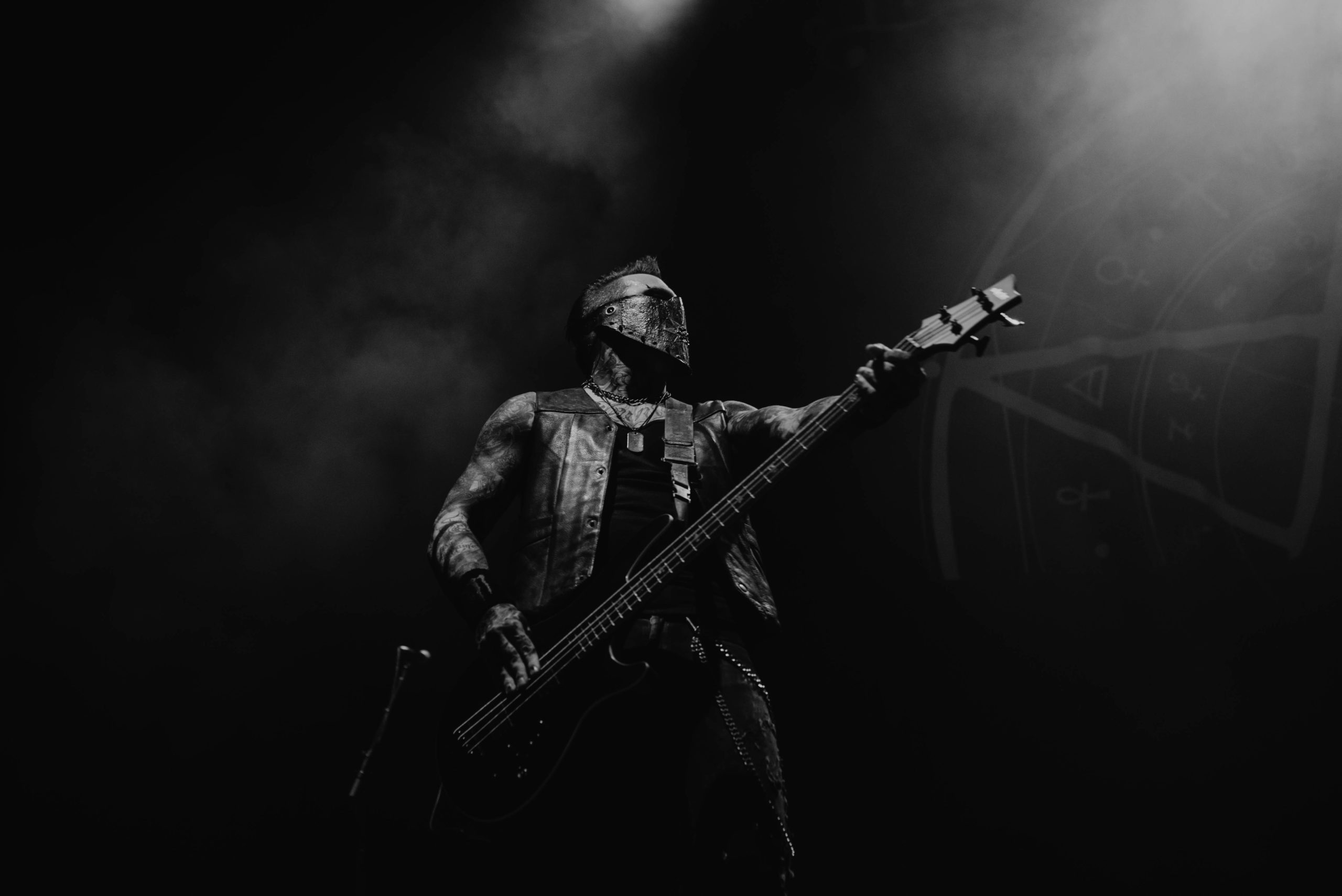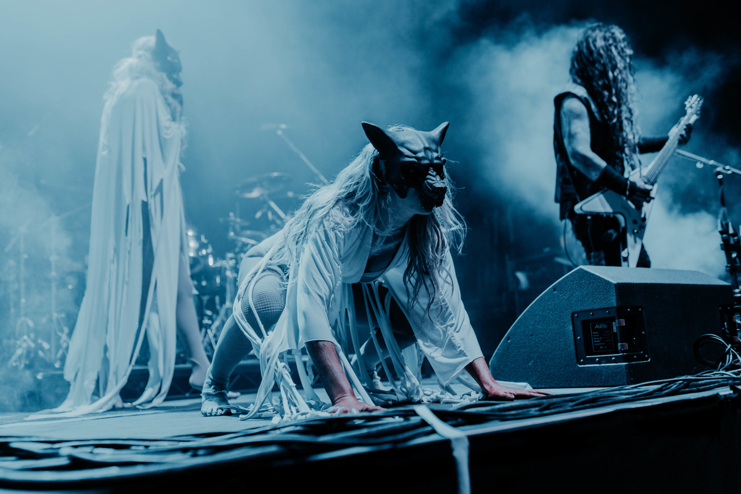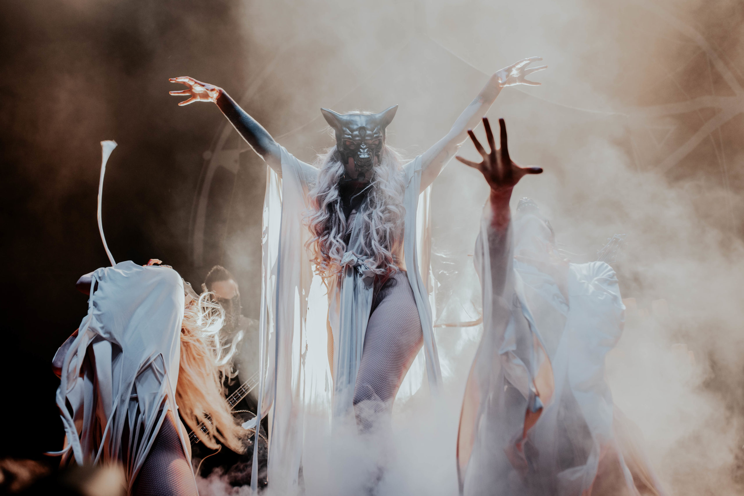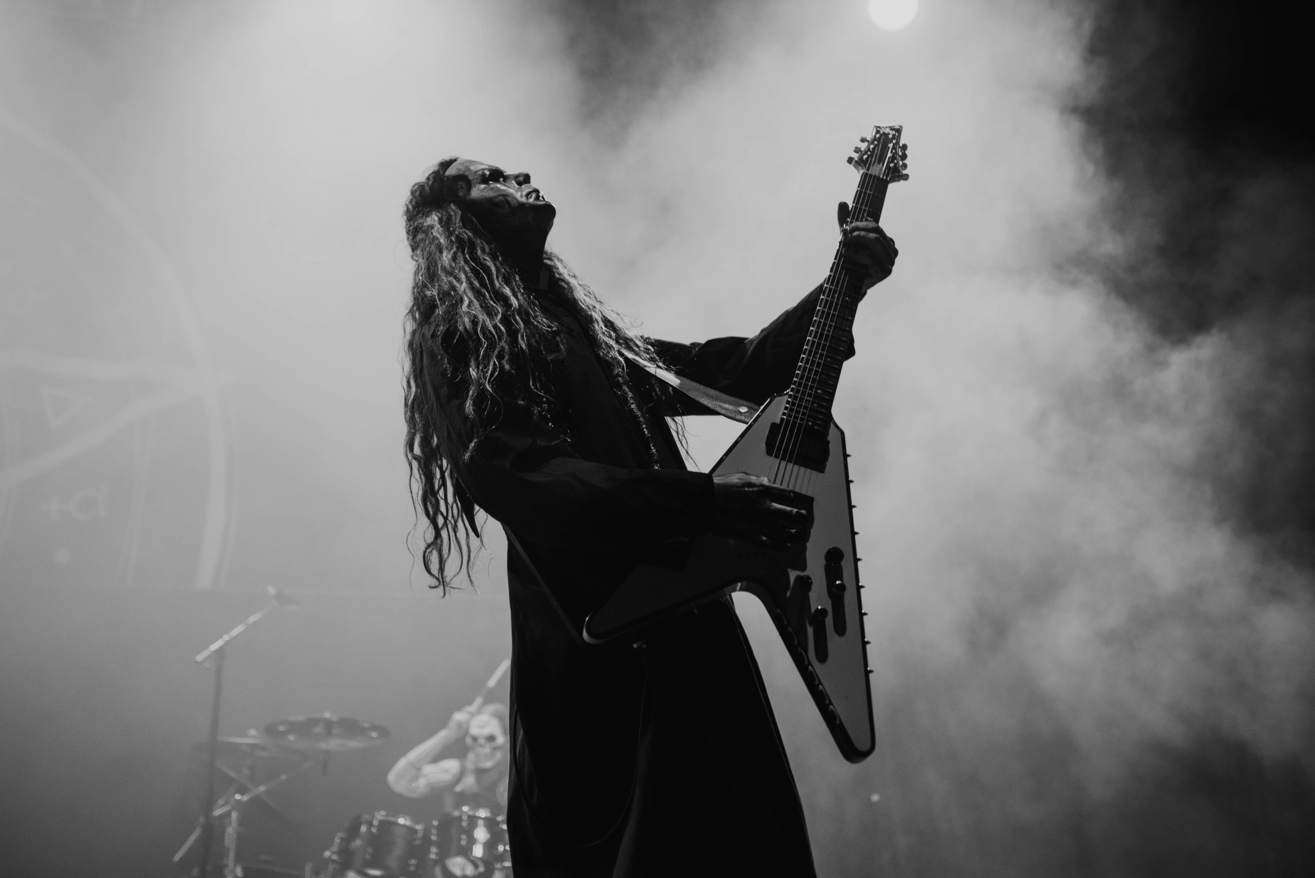 By contrast, IN THIS MOMENT are fast becoming a band who could potentially headline somewhere like this on their own in the next few years. It’s quite a statement for a support band to not only bring more of a stage setup than the headliners but also a blackout curtain to hide the changeover in between sets. Thankfully, the performance matches the ambition. Part rock horror show, part pop stadium extravaganza, the Hollywood quintet are menacing, morbid and deliver a thunderous hour of rock-come-metal that threatens to derail the band on after them. Of course, front and centre is Maria Brink, the perfect fusion of Marilyn Manson and Lady Gaga and immediately captivating. Flanked by two backing dancers and spending a significant amount of time atop a podium, her decision to wear a Britney Spears style radio mic is inspired, as it aids the choreography she performs during the likes of Adrenalize and a thumping rendition of Big Bad Wolf. And her voice is impeccable, soaring through the Motorpoint and adding real gusto to the pounding drums and crushing riffs. Also among the setlist tonight is Natural Born Sinner – mercifully replacing a drum solo – the as-yet unreleased track Legacy written about Maria’s grandfather and a surprisingly good cover of THE STEVE MILLER BAND’s Fly Like an Eagle, which far outstrips NEW YEARS DAY’s mawkish attempt at PANTERA’s Fucking Hostile from earlier in the night. As the hour draws to a close, Maria resumes her position atop the plinth and conducts a now fired-up crowd through Whore as black and white balloons bounce around the venue. Without question, the metal scene has been put on notice tonight.