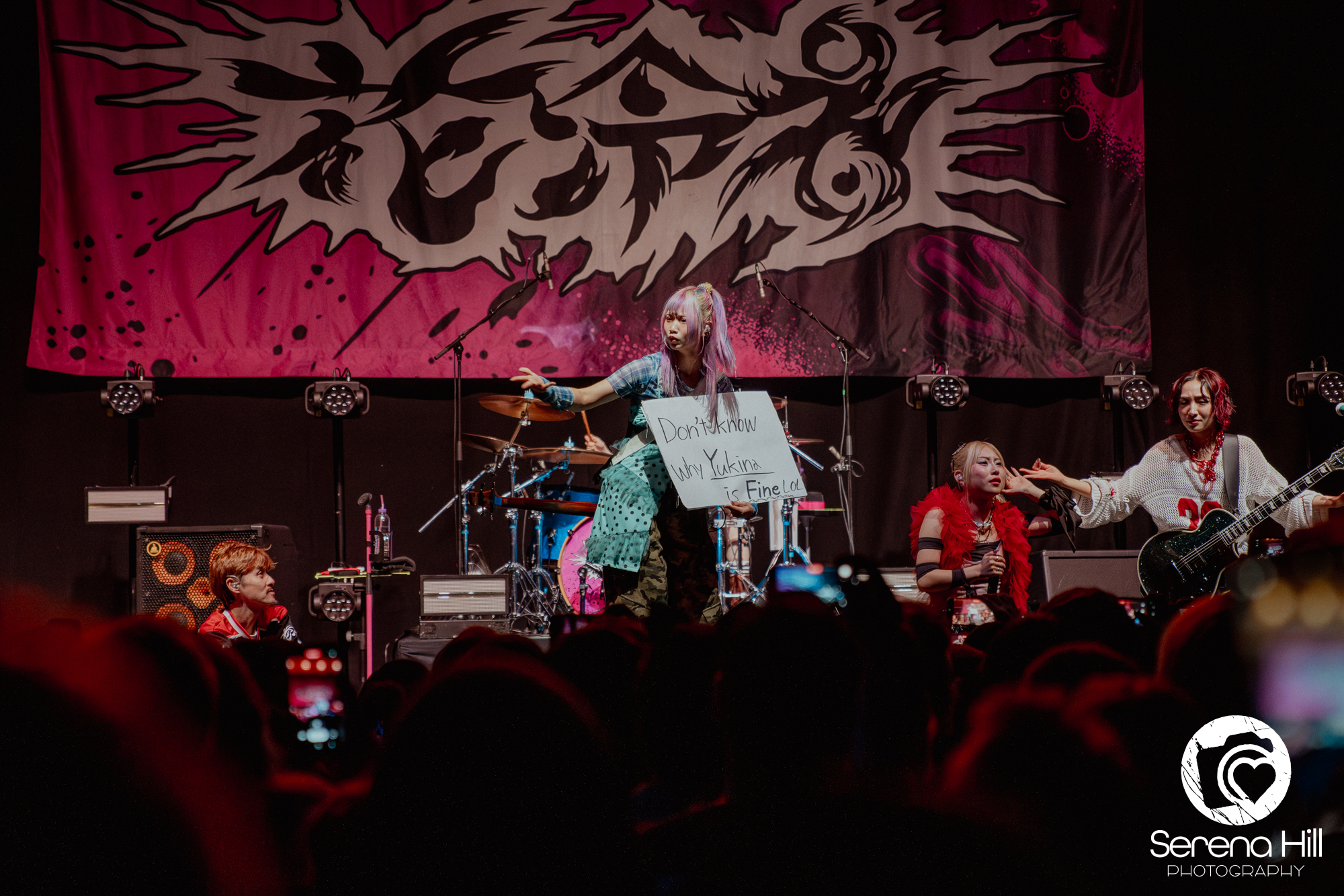 Yukina’s vocals are jaw-dropping – equal parts charm and chaos. One moment she’s beaming like an idol, the next she’s letting out a demonic scream that makes the floor shake. Matsuri’s guitar work is razor-sharp, slicing through the bubblegum melodies with precision. The rhythm section is relentless, keeping the chaos perfectly tight as the crowd loses their collective minds.