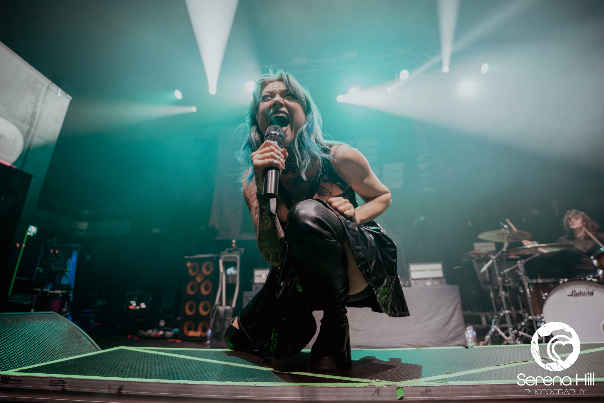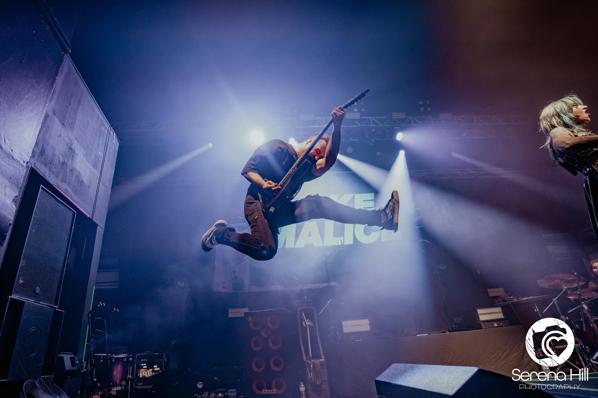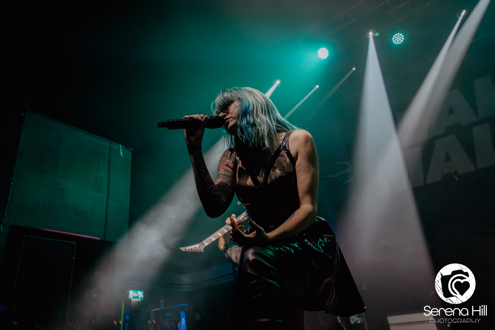 Having carved their place in the UK scene with relentless touring and a sound that blends metalcore chaos with futuristic gloss, LAKE MALICE step up like headliners in waiting. Being the only support band is a heavy weight, but they wear it like armour. Alice Guala, all charisma and conviction, storms onto the stage like she owns it. One second, she’s belting a pristine hook that could sit on a pop record; the next, she’s unleashing a death growl that rattles your ribcage. Her voice is a weapon, and she knows exactly how to use it. Blake Cronwall, meanwhile, is pure kinetic energy – spinning, leaping, and darting across the stage with a grin that never fades. He doesn’t just play the guitar; he attacks it, feeding off the chaos of the pit.