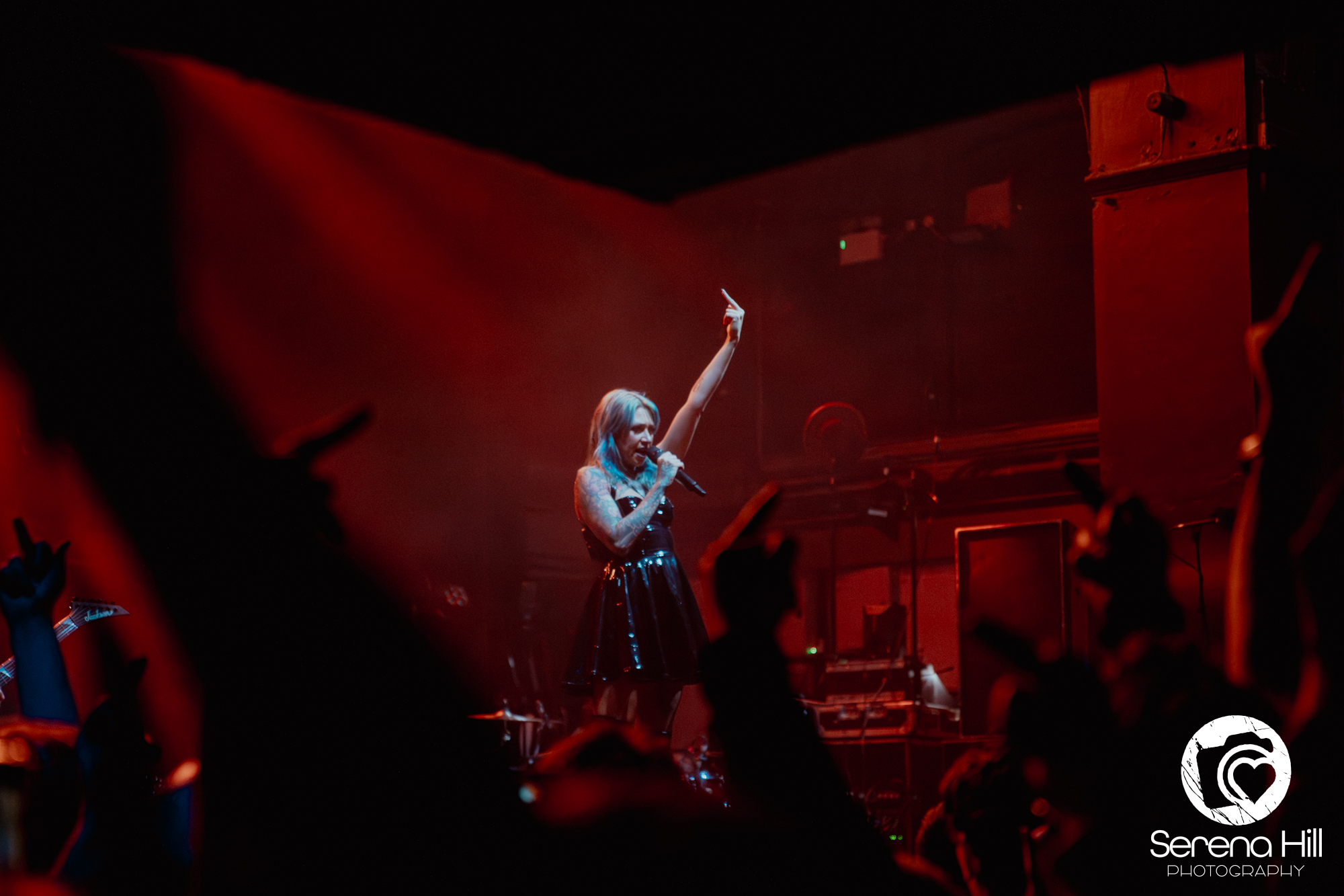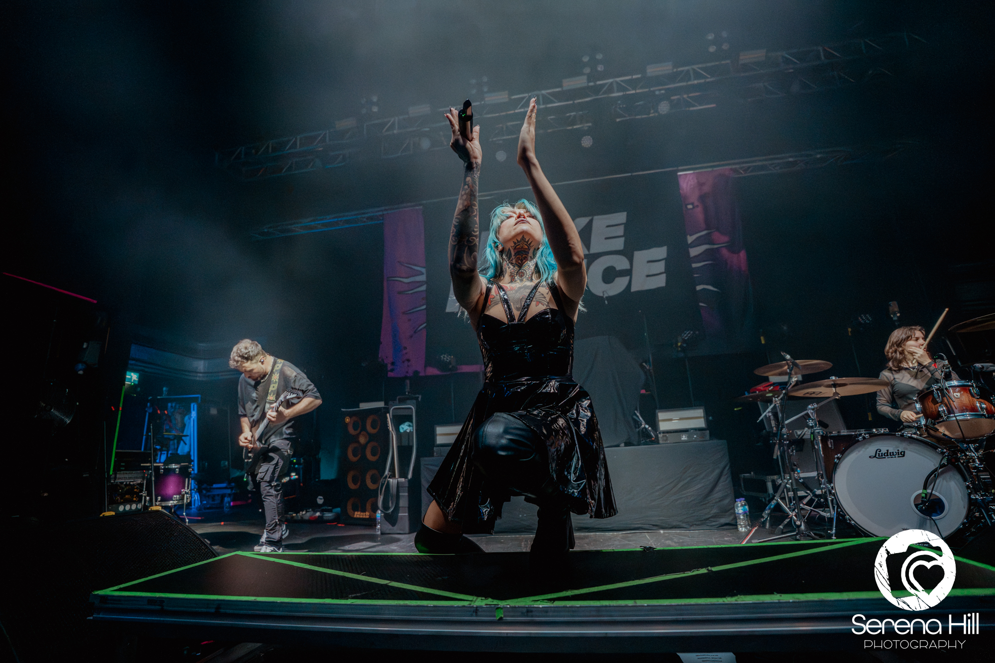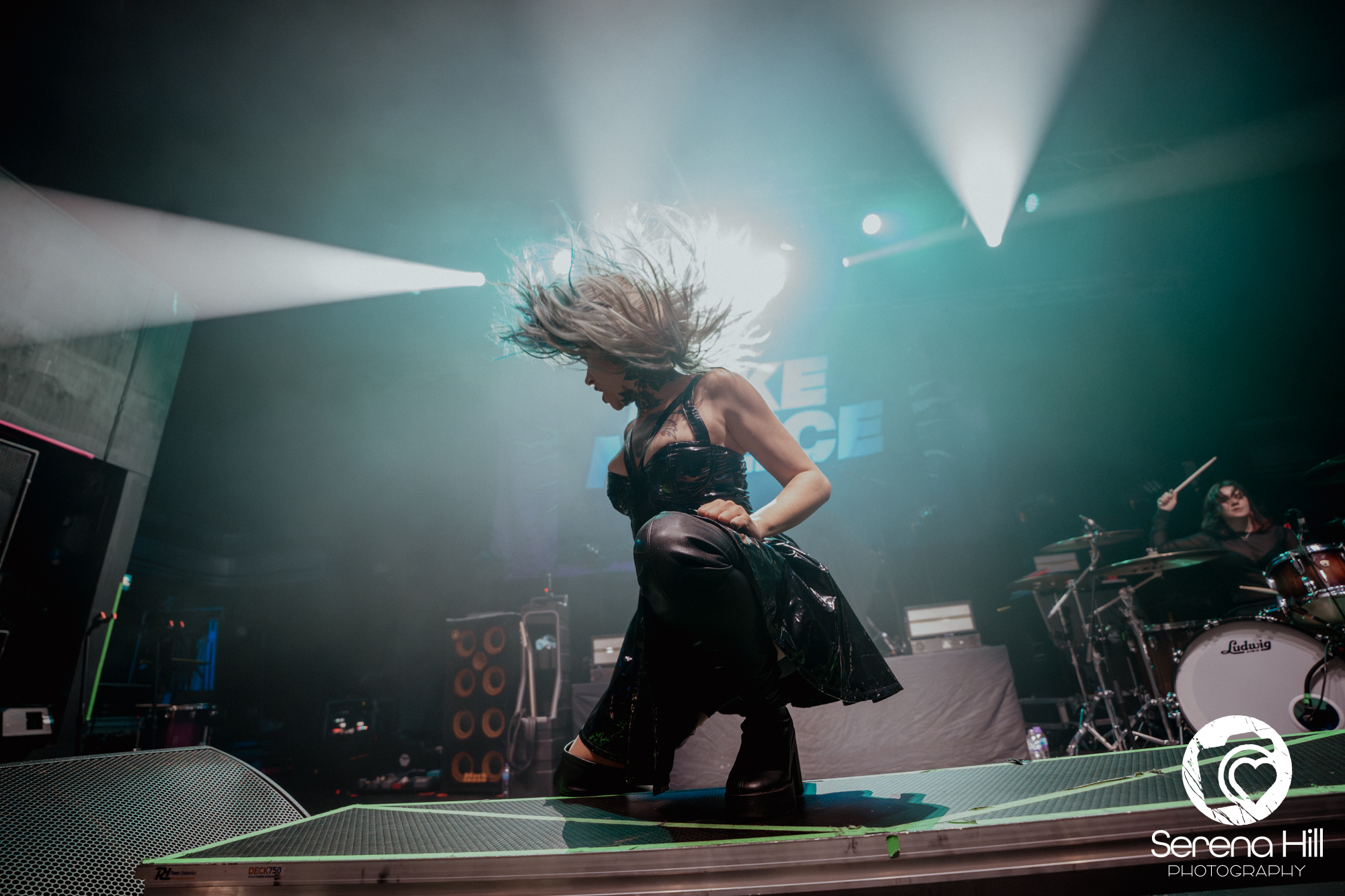 Having carved their place in the UK scene with relentless touring and a sound that blends metalcore chaos with futuristic gloss, LAKE MALICE step up like headliners in waiting. Being the only support band is a heavy weight, but they wear it like armour. Alice Guala, all charisma and conviction, storms onto the stage like she owns it. One second, she’s belting a pristine hook that could sit on a pop record; the next, she’s unleashing a death growl that rattles your ribcage. Her voice is a weapon, and she knows exactly how to use it. Blake Cronwall, meanwhile, is pure kinetic energy – spinning, leaping, and darting across the stage with a grin that never fades. He doesn’t just play the guitar; he attacks it, feeding off the chaos of the pit.