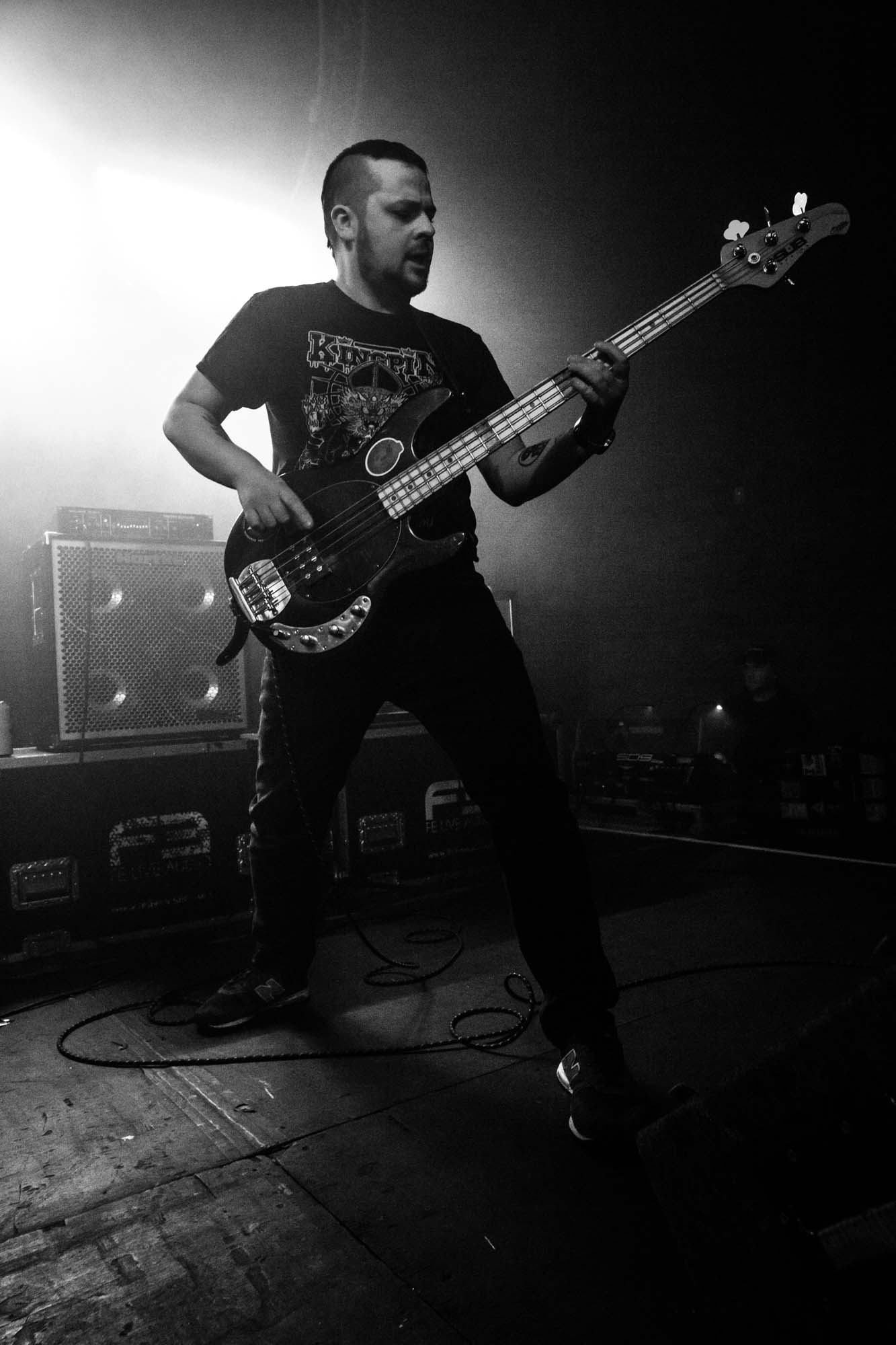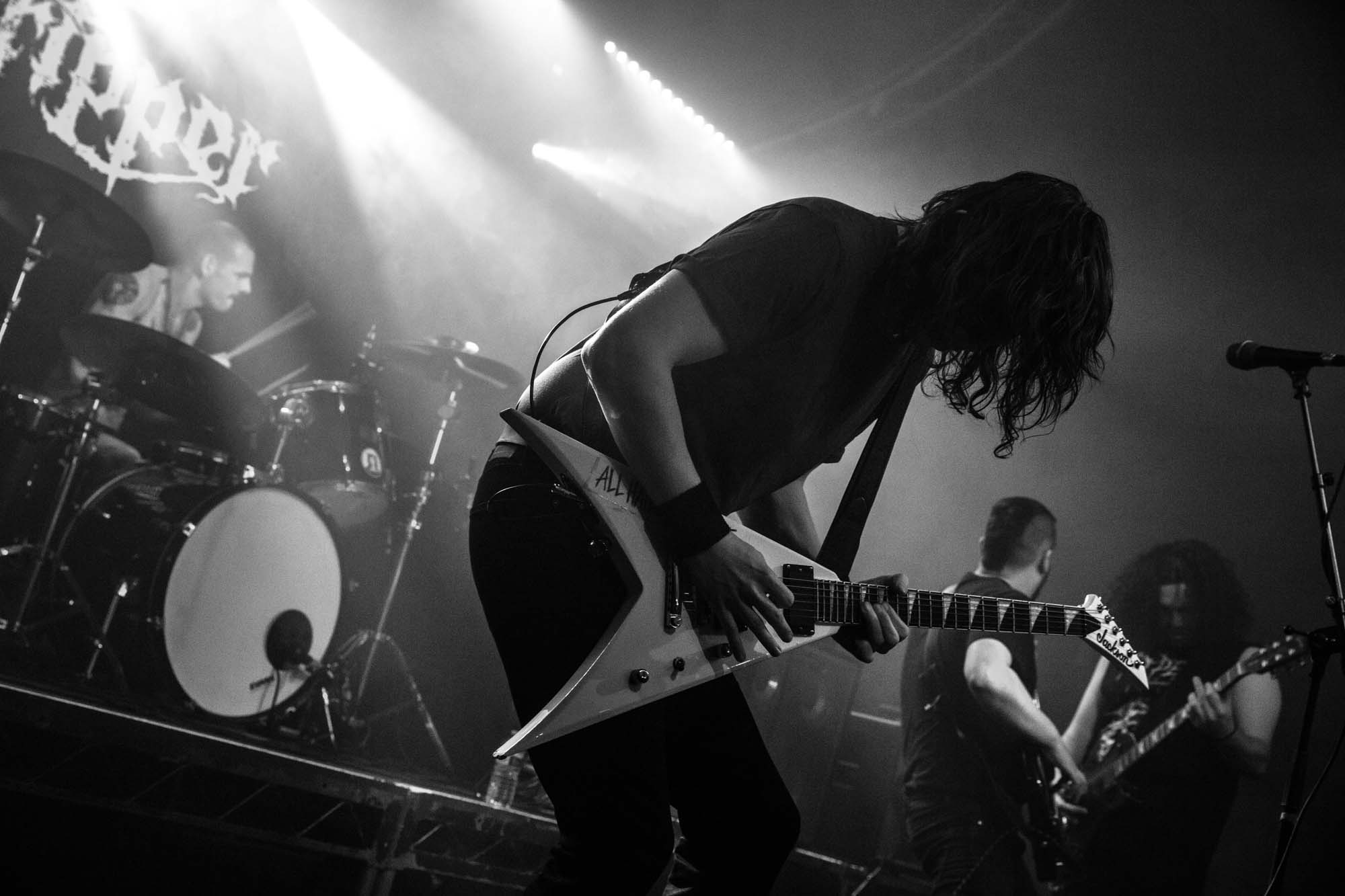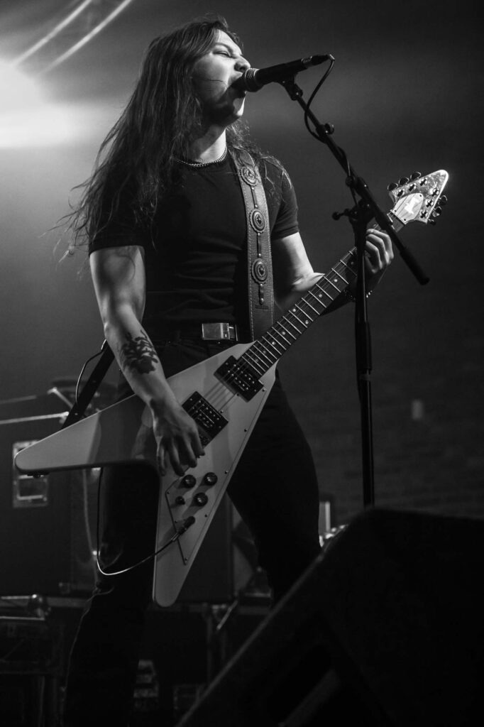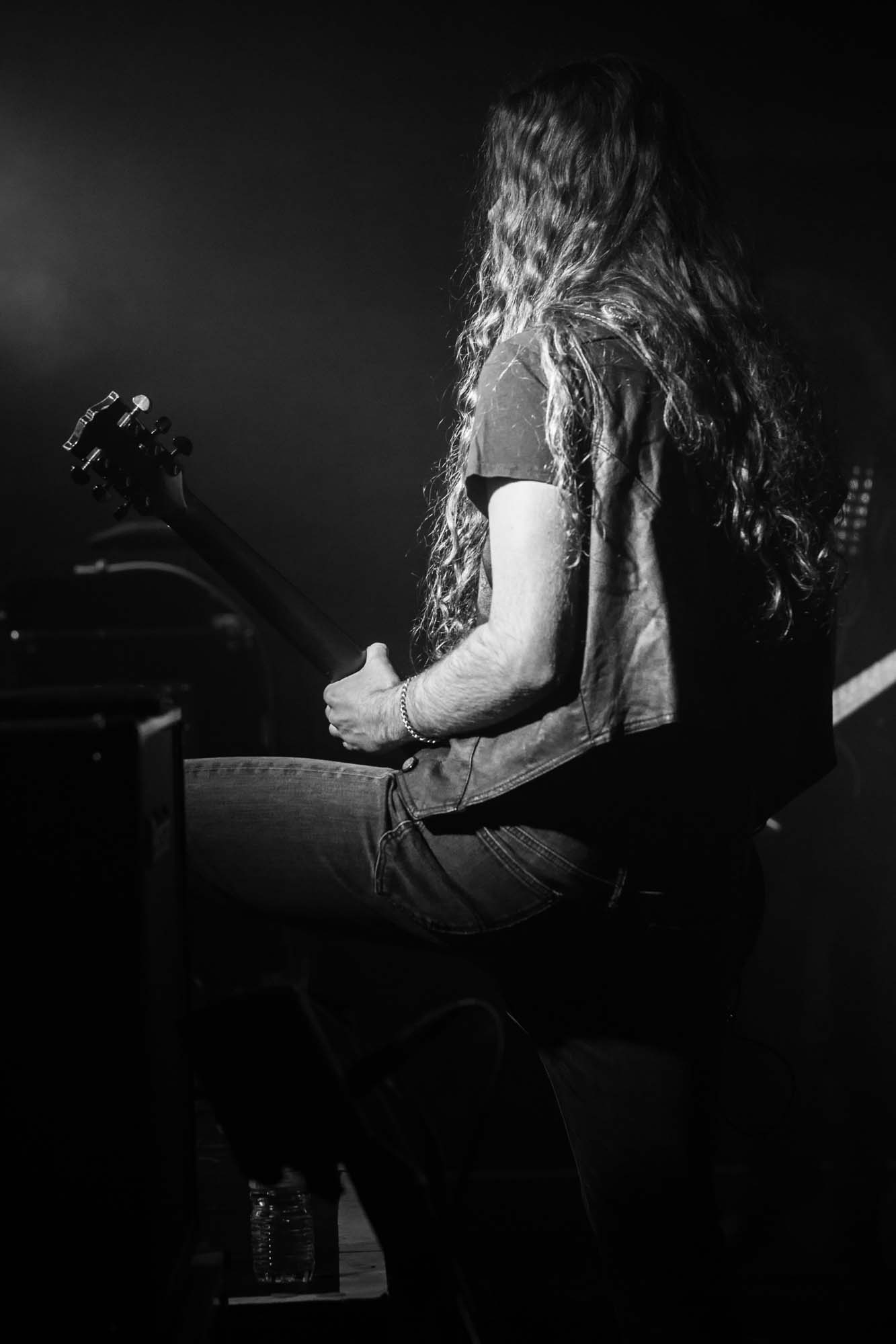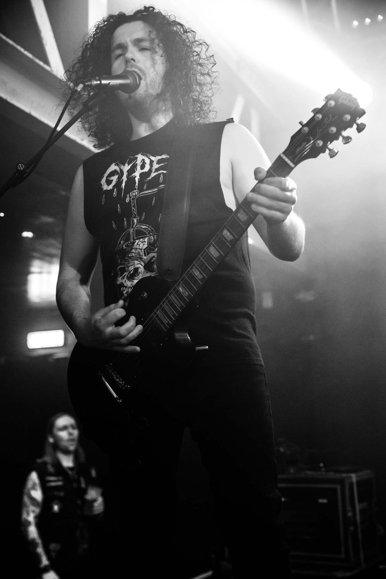 Two other new songs – Hunderprest and Mortercheyn – are served, with the urgency, melodic atmosphere and savagery of the former striking particularly hard. The fresh numbers expand McBain‘s pool of influences, yanking from melodic death, goth and more heavy metal infusions. Older speed metal tracks, Within Everlasting Hellfire and The Affair of the Poisons, detonate on the crowd with their machine gun tremolo riffing. The Nuckalavee is a prominent highlight of the night, demanding one of the more frenetic responses from the attendees. McBain has the audience in the palm of his hand. Making use of all three microphone stands gives him more movement than other guitarist-vocalists. In between songs, he’s chatty and conversational, easily squeezing a few laughs from the punters. Usual live bassist Andy Milburn has been replaced by Edinburgh thrashers DISPOSABLE bassist Billy Robertson, who does a fine job.