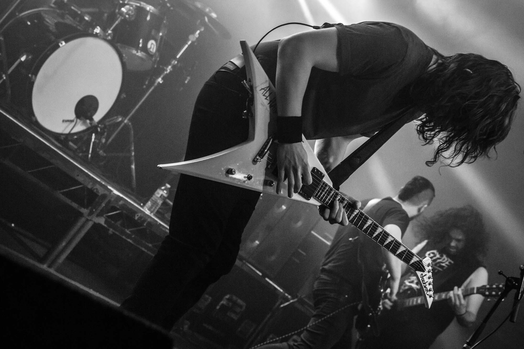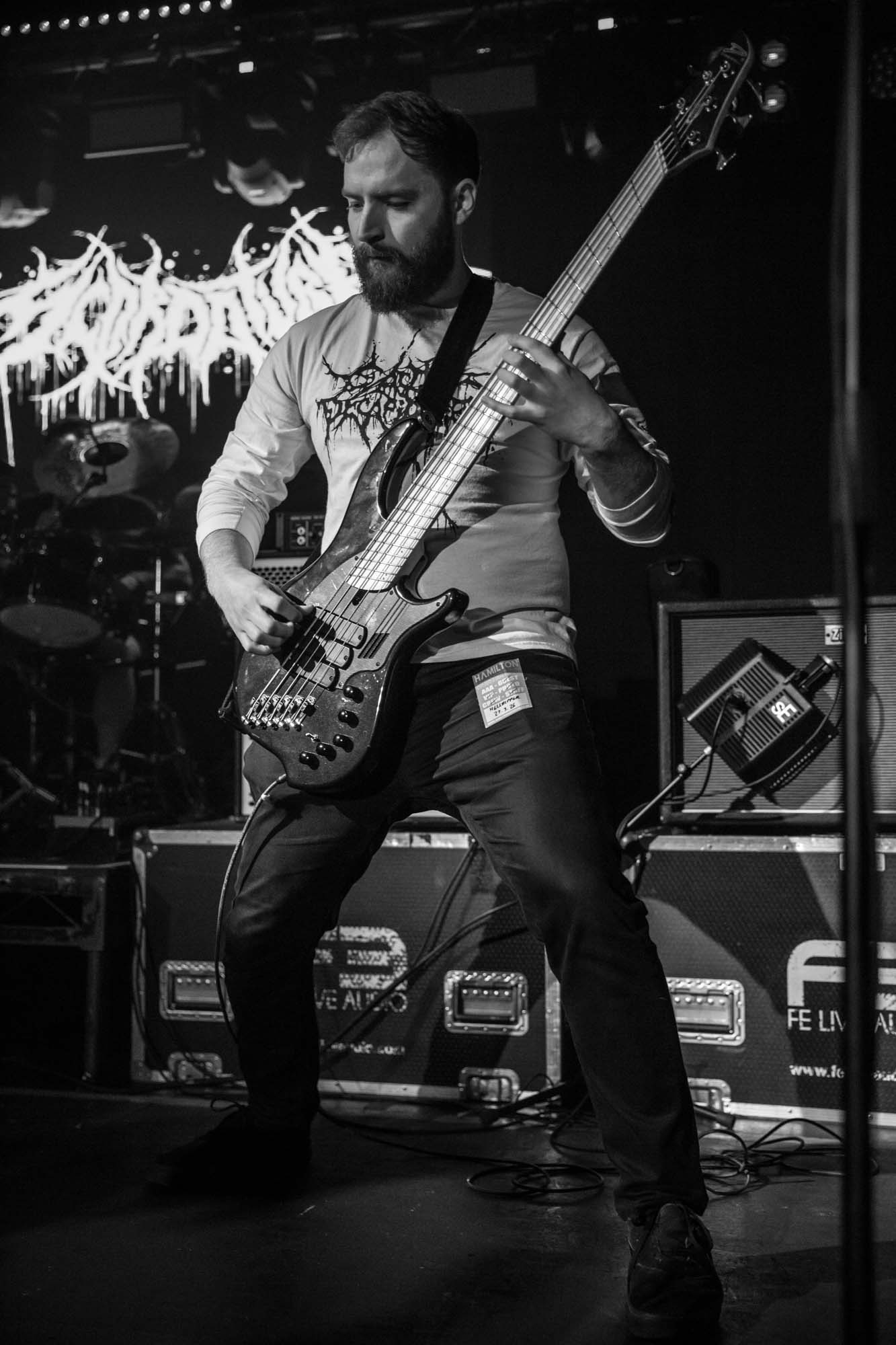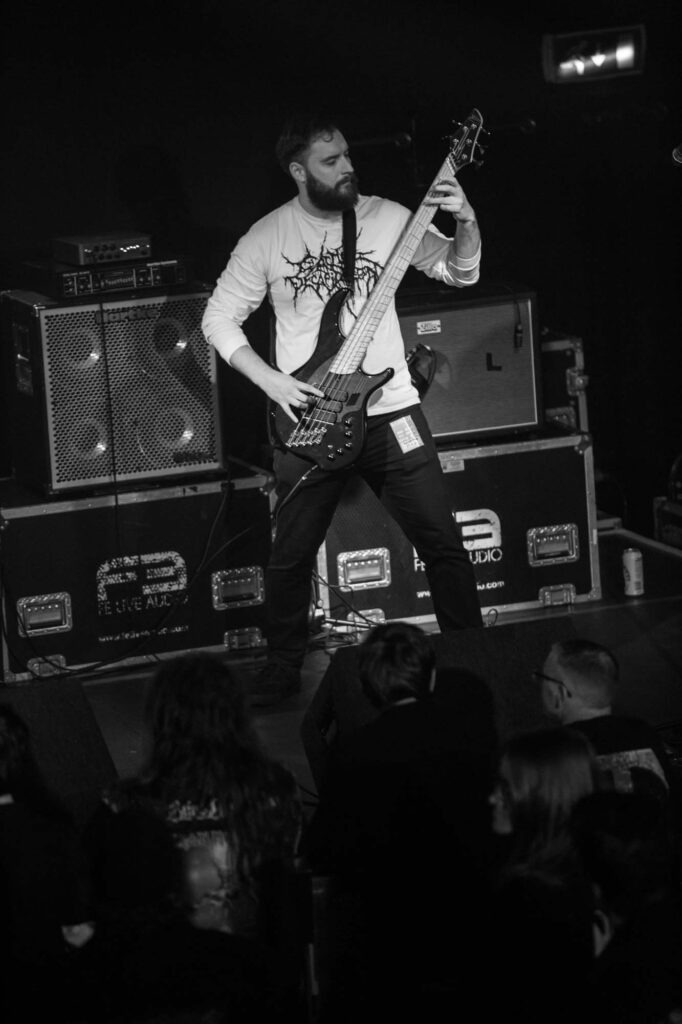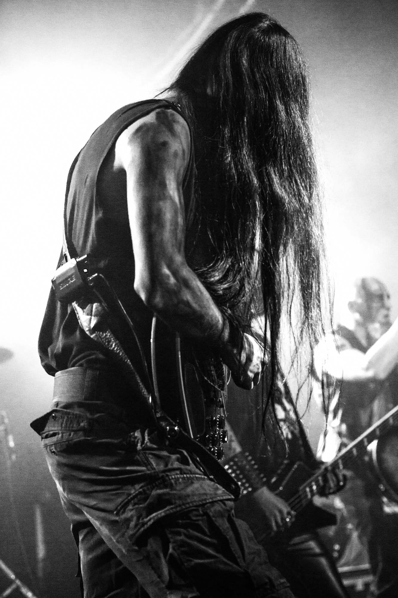 Two other new songs – Hunderprest and Mortercheyn – are served, with the urgency, melodic atmosphere and savagery of the former striking particularly hard. The fresh numbers expand McBain‘s pool of influences, yanking from melodic death, goth and more heavy metal infusions. Older speed metal tracks, Within Everlasting Hellfire and The Affair of the Poisons, detonate on the crowd with their machine gun tremolo riffing. The Nuckalavee is a prominent highlight of the night, demanding one of the more frenetic responses from the attendees. McBain has the audience in the palm of his hand. Making use of all three microphone stands gives him more movement than other guitarist-vocalists. In between songs, he’s chatty and conversational, easily squeezing a few laughs from the punters. Usual live bassist Andy Milburn has been replaced by Edinburgh thrashers DISPOSABLE bassist Billy Robertson, who does a fine job.