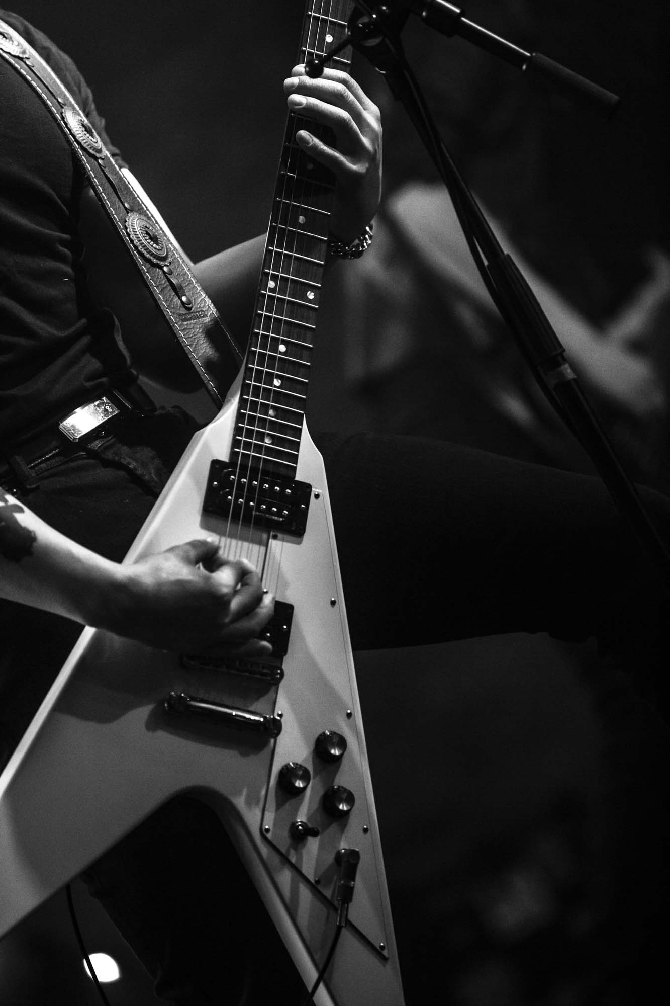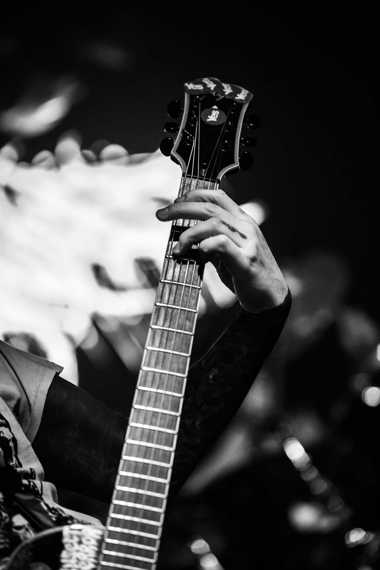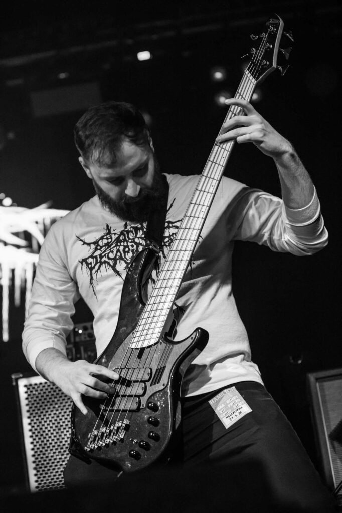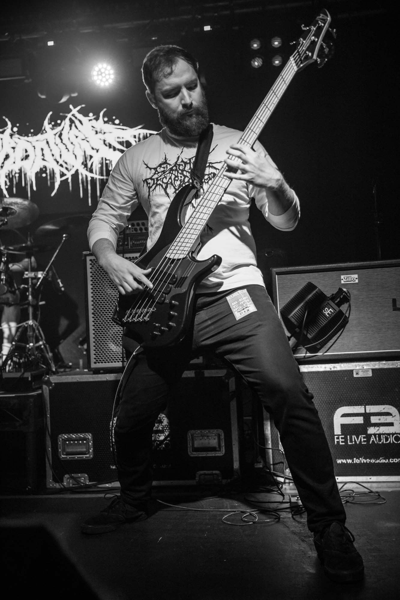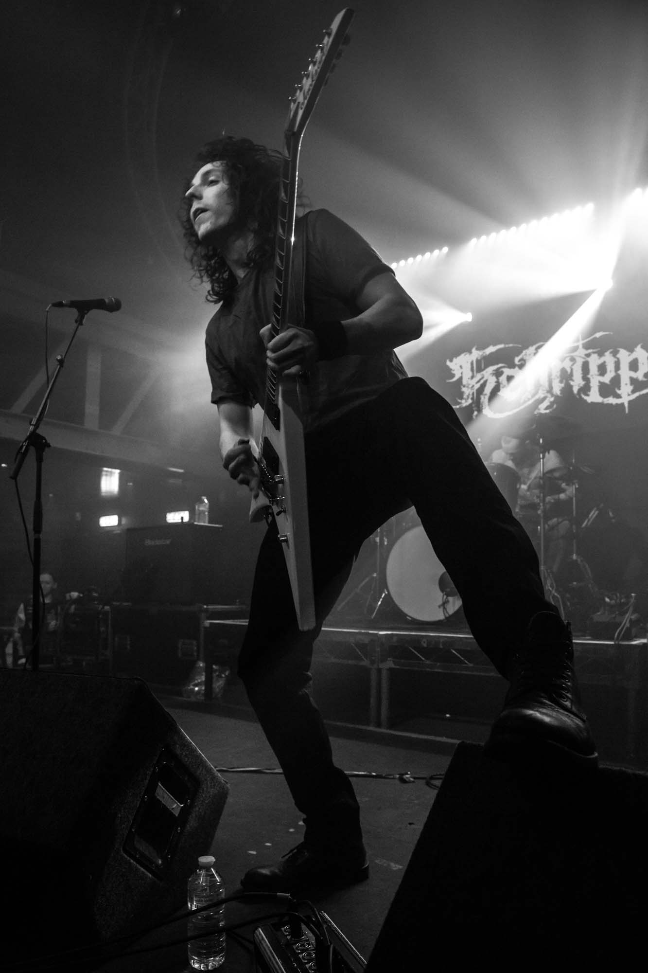 Two other new songs – Hunderprest and Mortercheyn – are served, with the urgency, melodic atmosphere and savagery of the former striking particularly hard. The fresh numbers expand McBain‘s pool of influences, yanking from melodic death, goth and more heavy metal infusions. Older speed metal tracks, Within Everlasting Hellfire and The Affair of the Poisons, detonate on the crowd with their machine gun tremolo riffing. The Nuckalavee is a prominent highlight of the night, demanding one of the more frenetic responses from the attendees. McBain has the audience in the palm of his hand. Making use of all three microphone stands gives him more movement than other guitarist-vocalists. In between songs, he’s chatty and conversational, easily squeezing a few laughs from the punters. Usual live bassist Andy Milburn has been replaced by Edinburgh thrashers DISPOSABLE bassist Billy Robertson, who does a fine job.