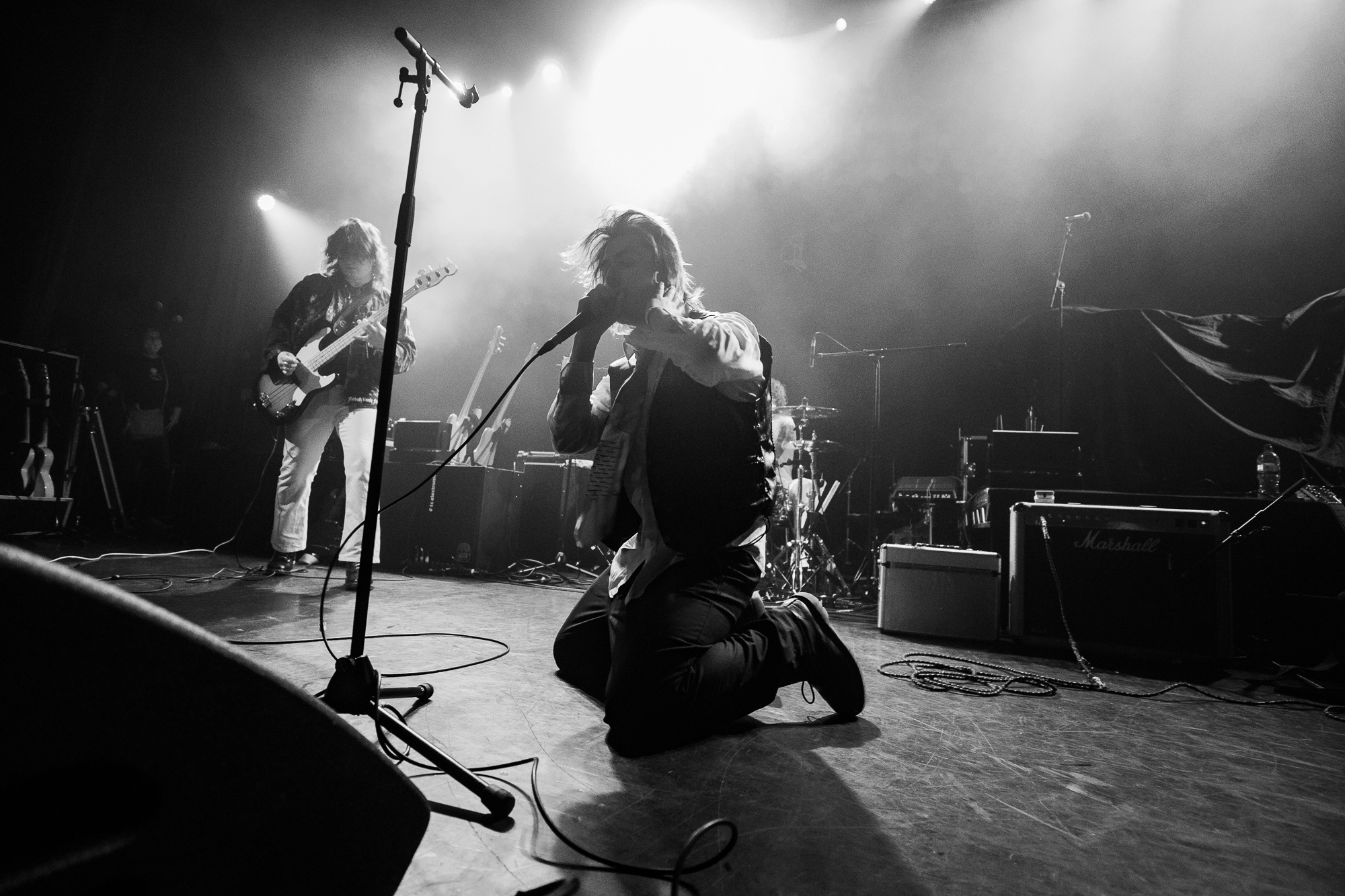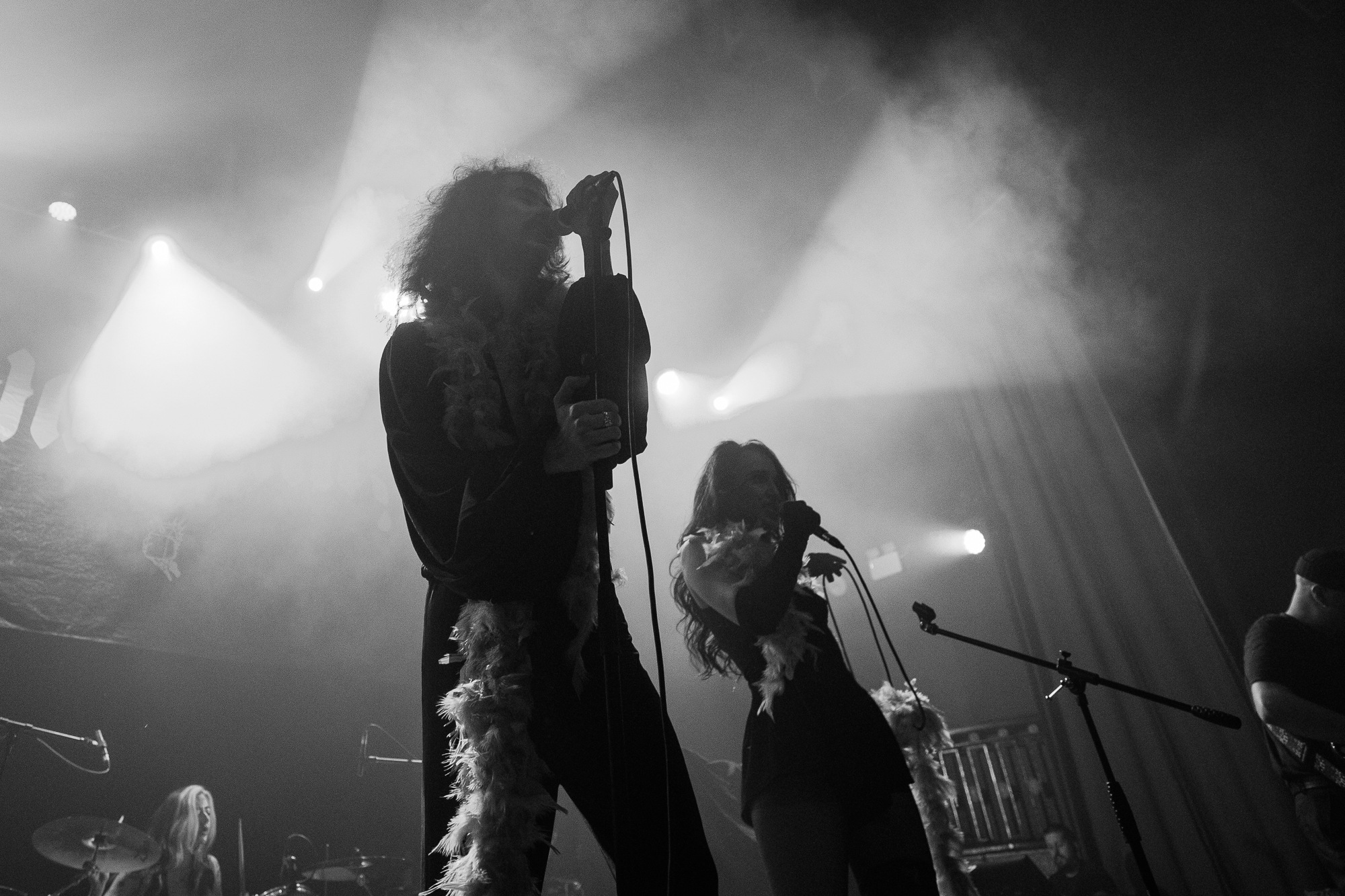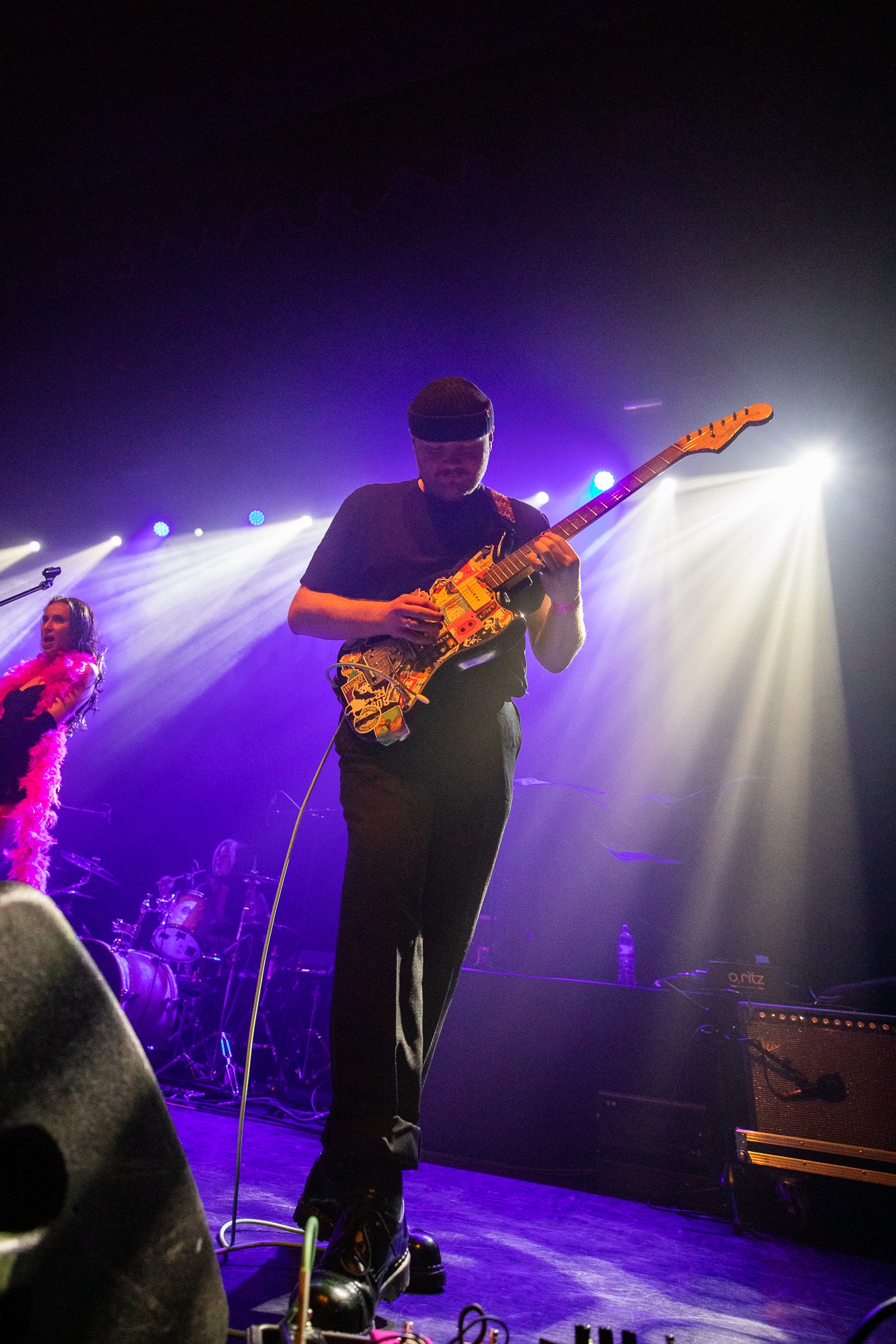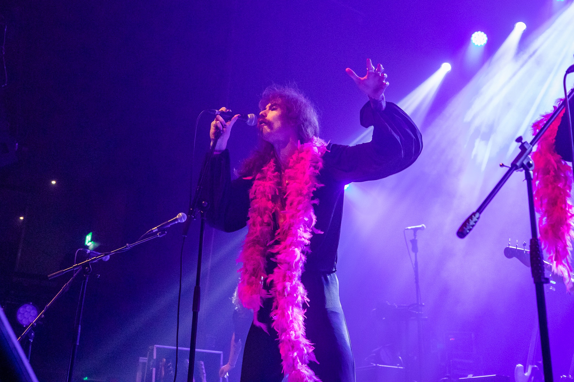 Next up are a group who span the entire stage not only in energy but in numbers. Leicester based six-piece JOOLS bring bountiful aesthetics and raw political punk, with rapid raving lyrics interspersed with driving rhythms and powerful clamouring choruses. Vocalists Mitch Gordon and Kate Price emerge donning pink feather boas, the former with glorious mane and moustache that would be appropriate in Spinal Tap. Their message is explicit throughout and is one of equality and rage at that not being enforced. “Society should feel very lucky that women like me want equality and not revenge” is the message of Price to justified acclaim. Gordon struts the stage with frivolous passion, stamping in time and dropping to his knees impassioned by the issues they confront. As JOOLS’ time comes to an end, faint cheers of an encore are heard, some feat for a group who are slightly ajar from the headline band.