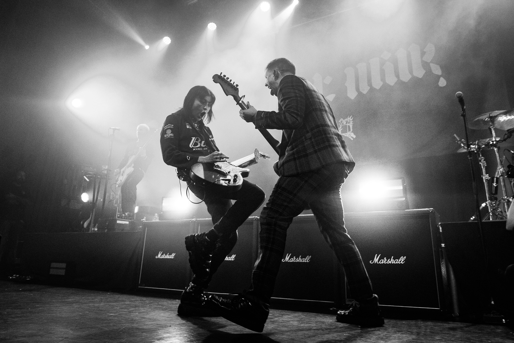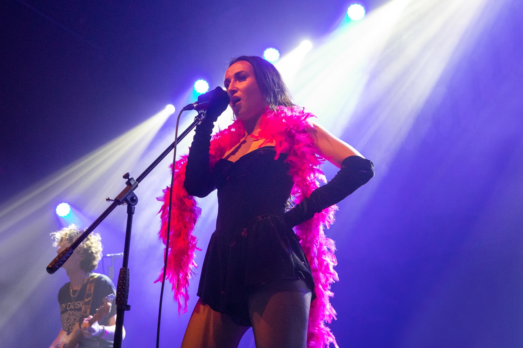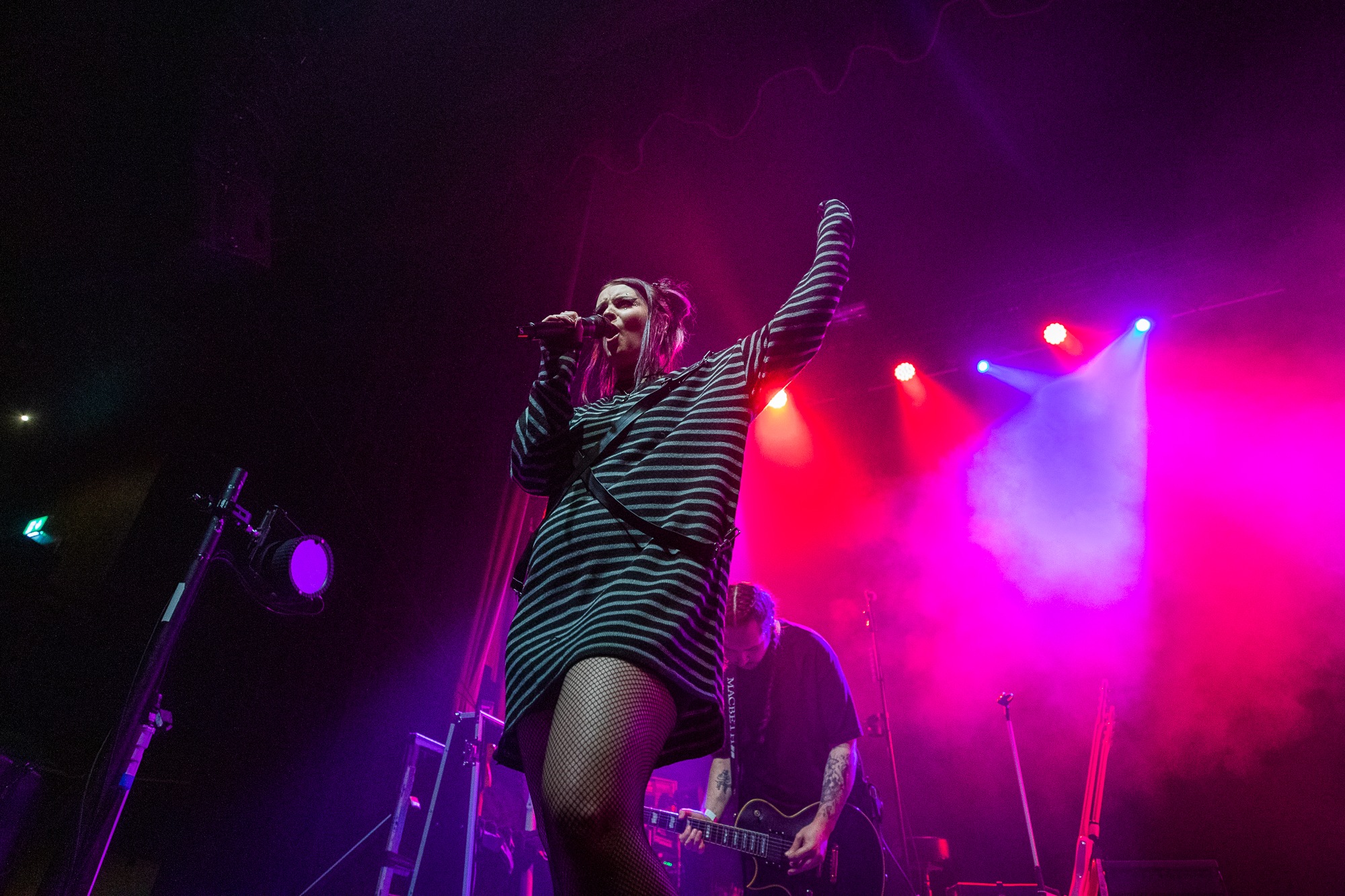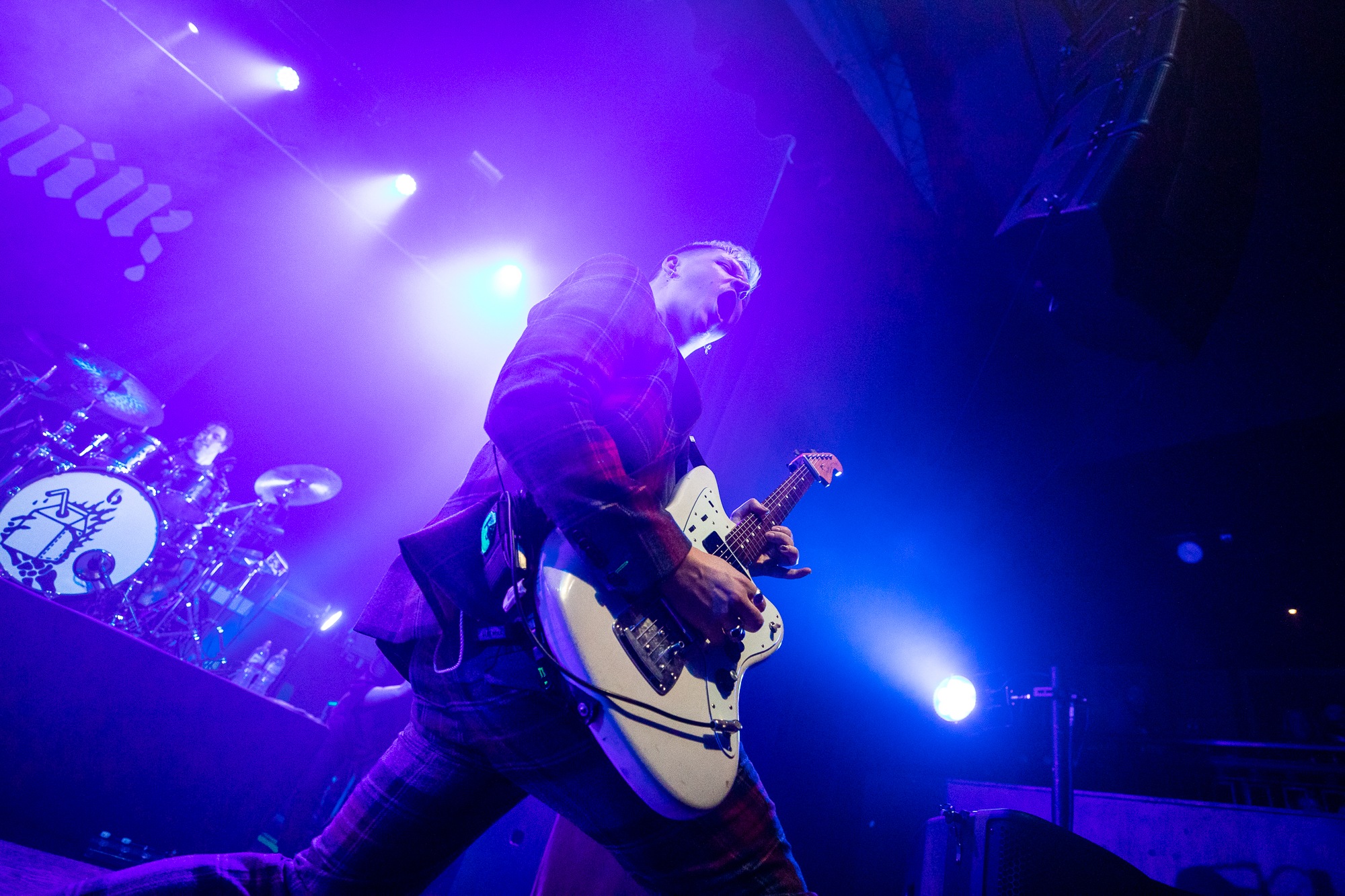 With such a strong evening thus far, pressure is certainly on for HOT MILK to step up to the plate and raise the stakes further yet. Right on time the lights drop to a flickering blue, with a voiceover instructing the room to “open up the pit” in anticipation of their arrival, to which the crowd readily indulges. Emerging to a vast cheer, the power pop group get every hand in the room in the air with opener Bad Influence, delivering their mix of hard-hitting riffs, ear-worming melodies, and relatable lyrics. The opener climaxes with Hannah Mee launching her guitar across stage into the grateful arms of a crewmember. The dynamic between Mee and co-vocalist James Shaw is infectious to watch, providing a studio quality performance, all while traversing the entire face of the stage.