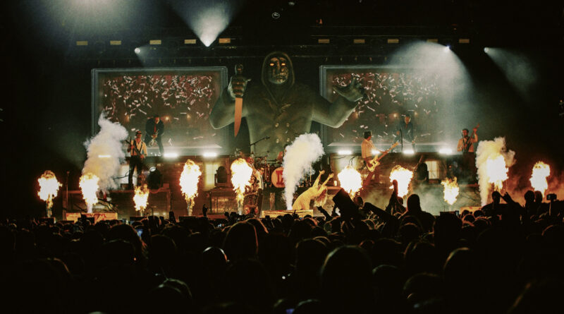 From gut-busting breakdowns to slasher-filled moments of suspense, both on screen and in the pit, ICE NINE KILLS UK and European leg of the A Work Of Art tour promises nothing short of a spectacle. Boasting the debut of their infamous Silver Scream Con in London – the band’s own frightful horror convention – they bring with them their first headline stadium run outside of America. Here, the real nightmare before Christmas can be seen in the near 20,000 horror metal fans descending in their droves to Manchester’s Co-op Live. With anticipation of blood, guts and garishly grandiose gore, can they deliver?