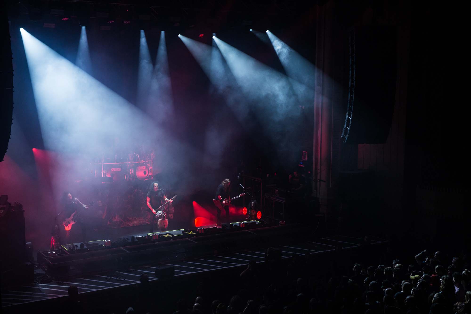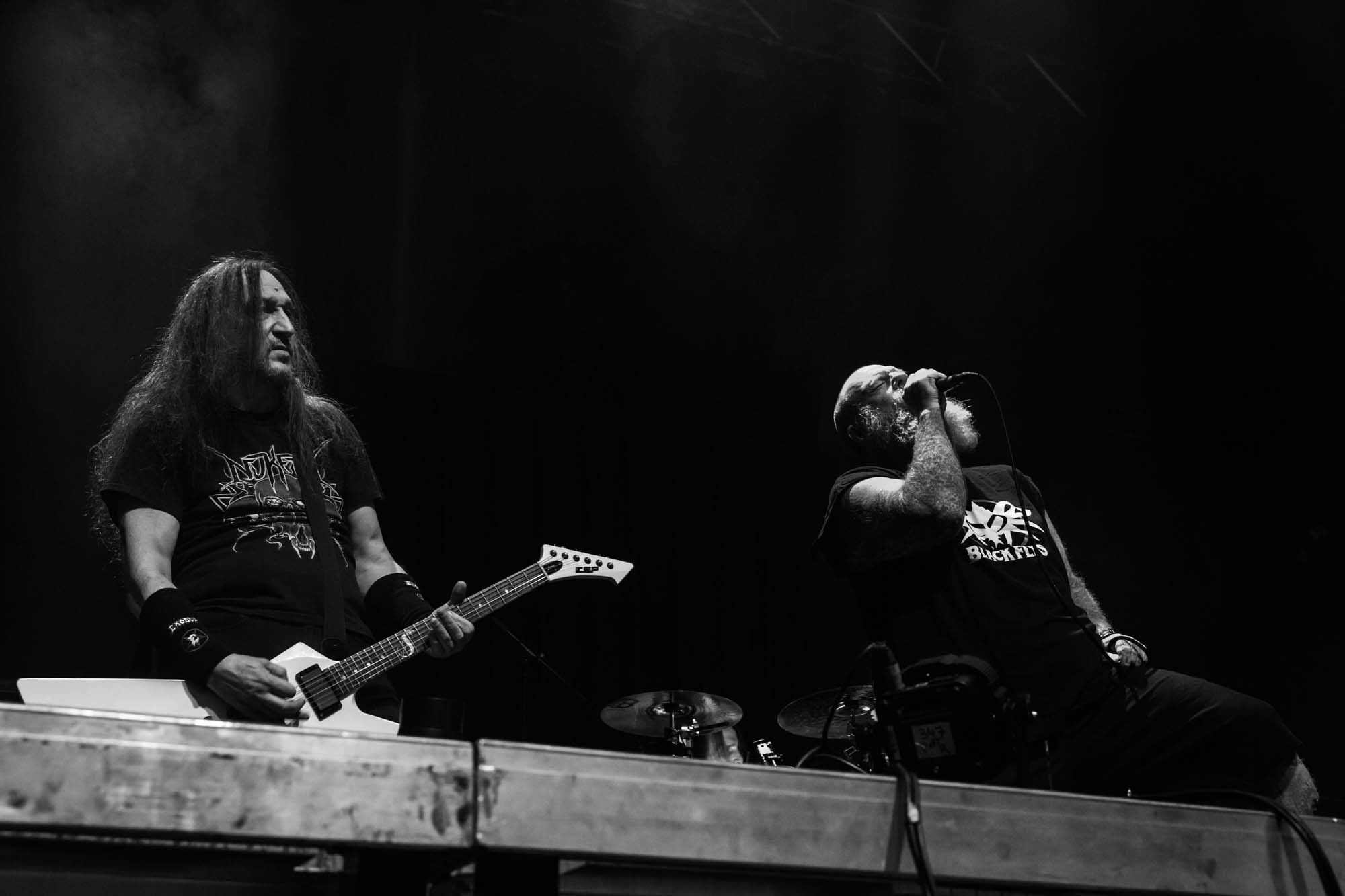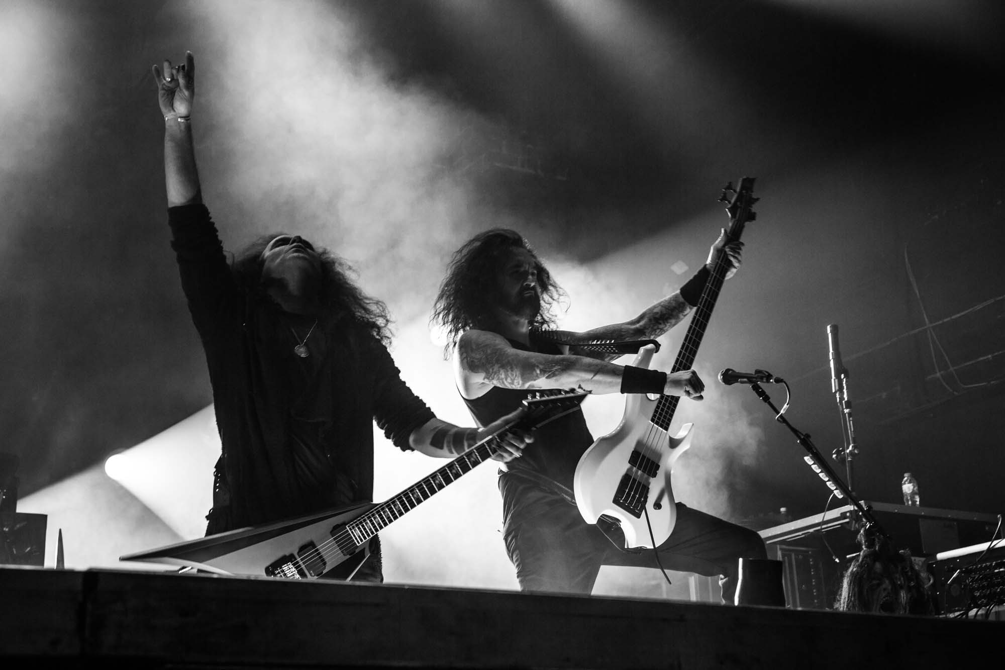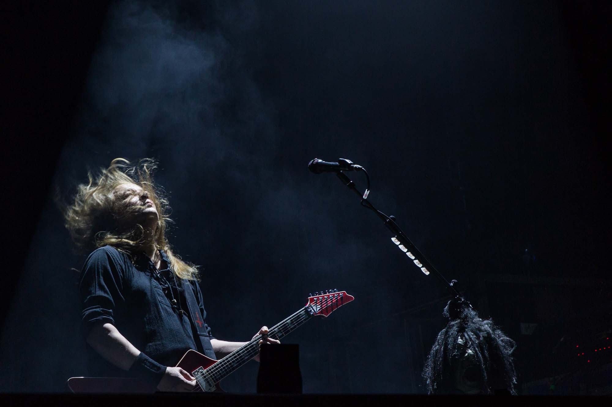 With a shorter set than they should have, the Americans have to be picky about their setlist. Wisely, the plodding title track is the only other song from Goliath. The usual suspects, like Deathlist, A Lesson in Violence and Toxic Waltz (teased before with a snippet of SLAYER‘s Raining Blood from Gary Holt, the now live guitarist for that unholy alliance), get showered in glory. Hyper-caffeinated tempos, electrifying solos and drumming that hits deeper than an oil rig smack all four walls of the room are reasons EXODUS rose to the forefront of thrash metal four decades ago. They’re also impacted by major sound drawbacks – the guitars sound hollow but this improves after a few songs. In defiance of their age, they’re dynamic, constantly moving and headbanging. There are some intriguing stage moments, such as Dukes strumming on Holt‘s guitar while the guitarist’s left hand hammers out a solo, and someone wearing a weird ape mask with long curly red hair taking over Lee Altus‘ rhythm guitar for a bit. The galloping Strike of the Beast closes the performance and leaves its mark on the venue. This is an utterly devastating showing that the following two acts will struggle to match.