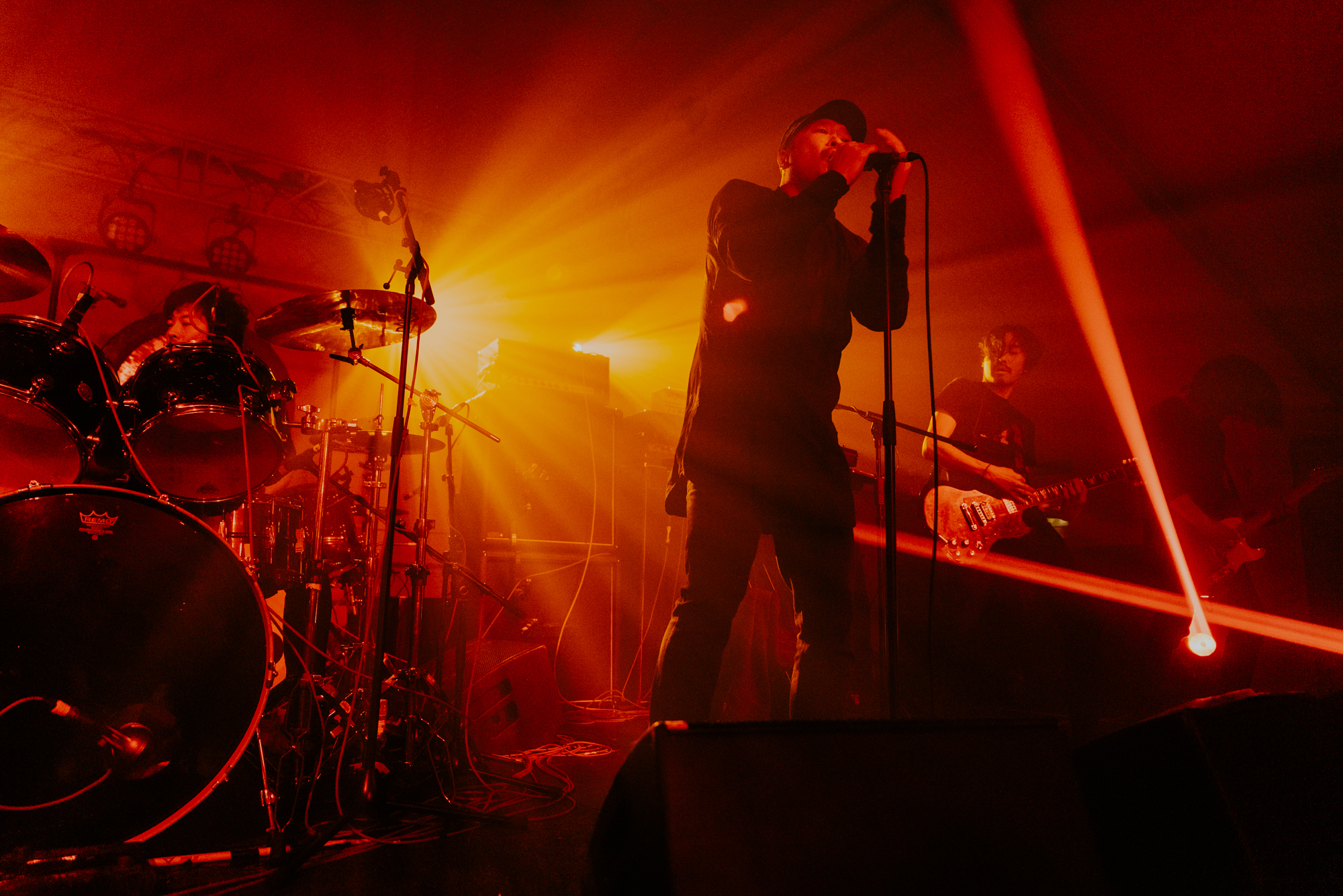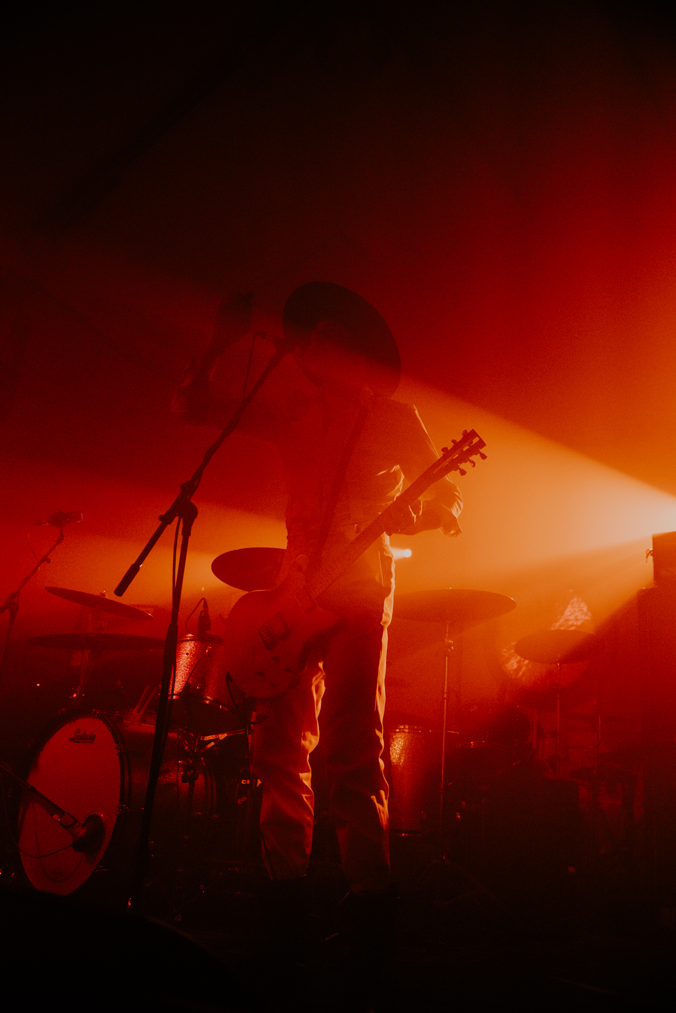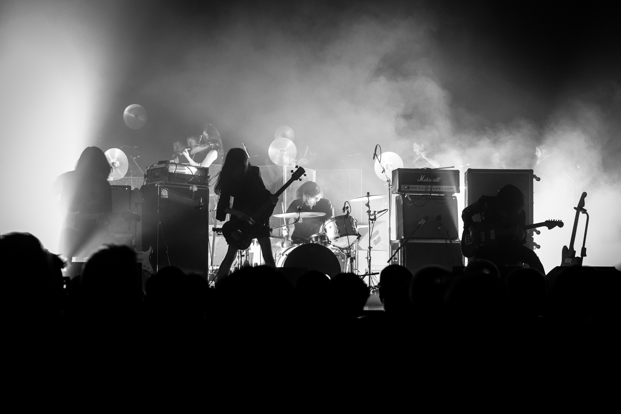 The stage was at last set for MONO to make their appearance alongside The Platinum Anniversary Orchestra. The stage of the Barbican hall is bathed in the soft light of filament bulbs, and filled with dormant instruments and vacant seats. Upstage the silhouette of a small orchestra, waiting in stillness for the band to take to the stage. Downstage centre is Dahm Majuri Cipolla‘s drumkit and a glockenspiel, flanked on either side by sets of amplifiers: to the left, Tamaki‘s bass stack, Taka‘s extensive pedalboard, and a concert piano, and on the right, Yoda‘s pedalboard. It is plain to see that something incredible is about to unfold. As the house lights dim, the audience wait in a hushed silence.