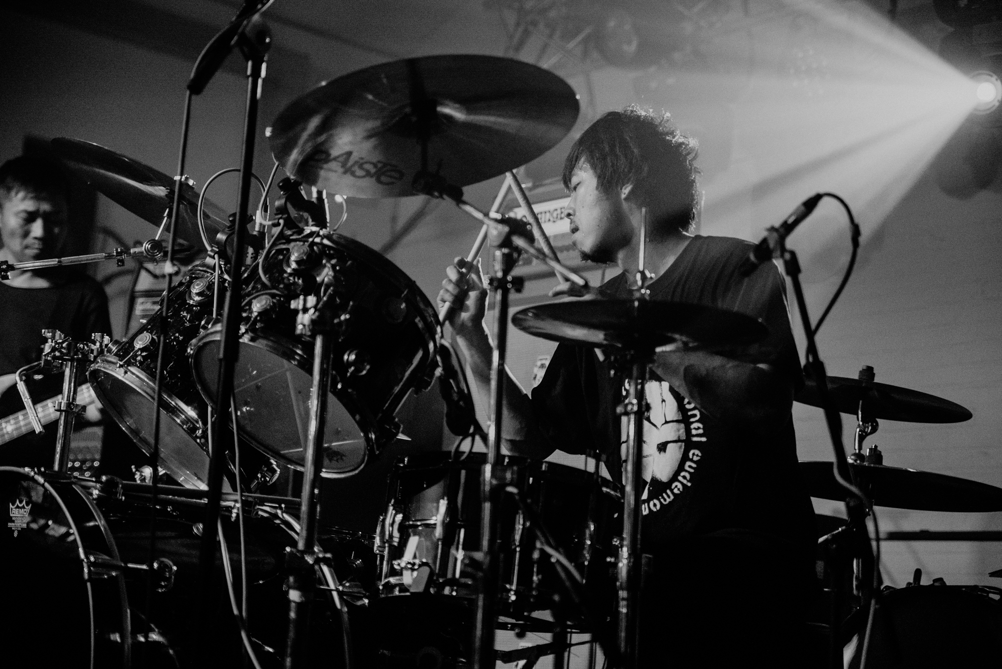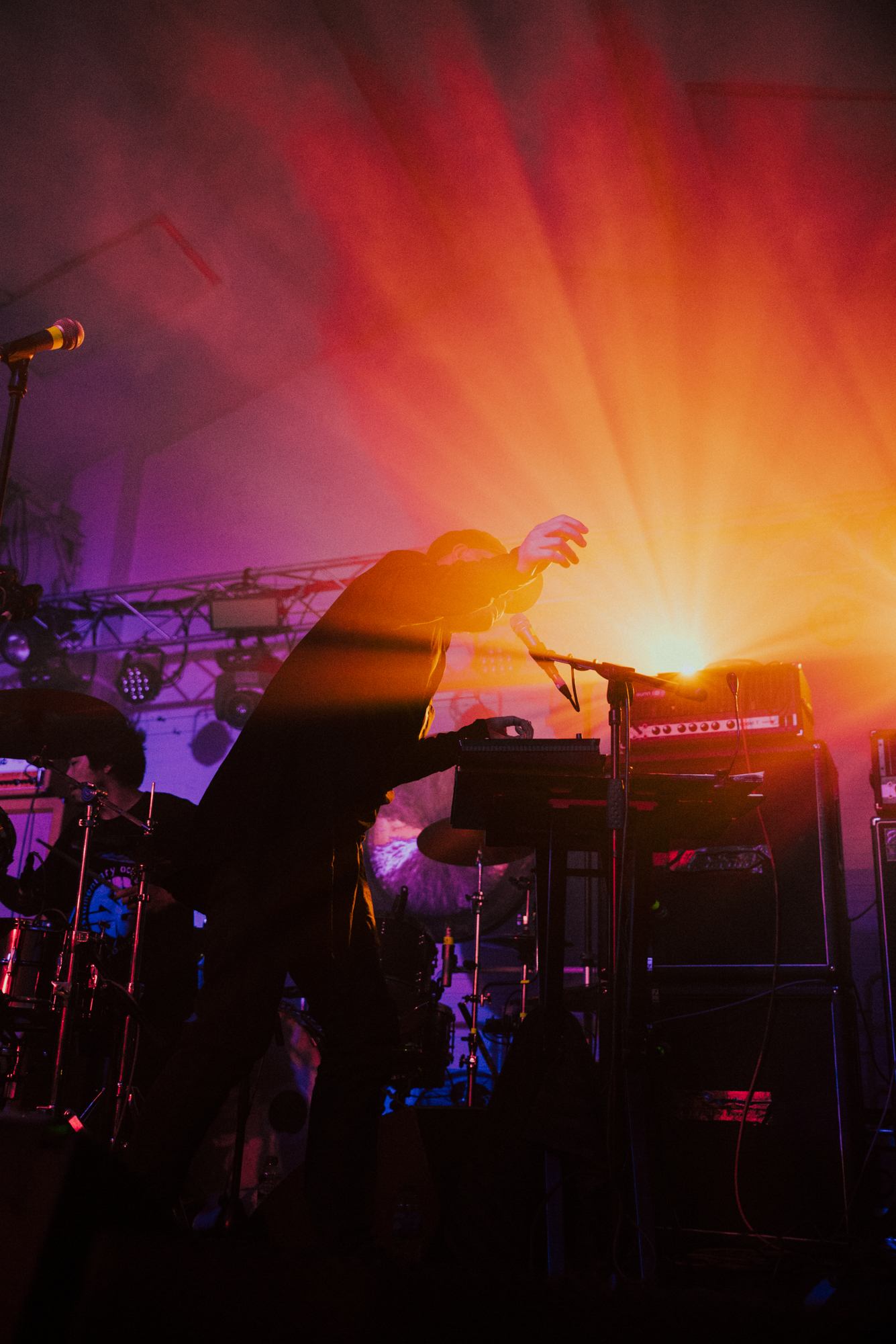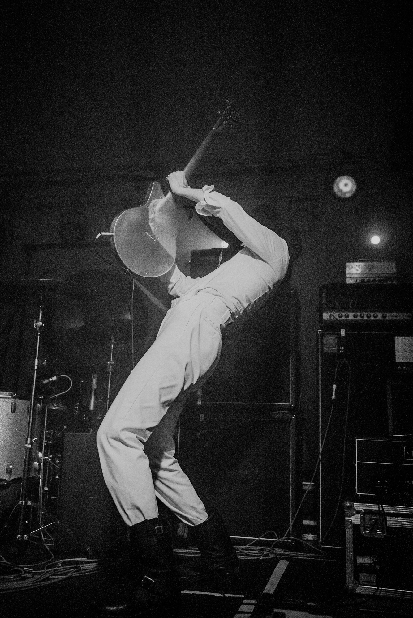 The stage was at last set for MONO to make their appearance alongside The Platinum Anniversary Orchestra. The stage of the Barbican hall is bathed in the soft light of filament bulbs, and filled with dormant instruments and vacant seats. Upstage the silhouette of a small orchestra, waiting in stillness for the band to take to the stage. Downstage centre is Dahm Majuri Cipolla‘s drumkit and a glockenspiel, flanked on either side by sets of amplifiers: to the left, Tamaki‘s bass stack, Taka‘s extensive pedalboard, and a concert piano, and on the right, Yoda‘s pedalboard. It is plain to see that something incredible is about to unfold. As the house lights dim, the audience wait in a hushed silence.
