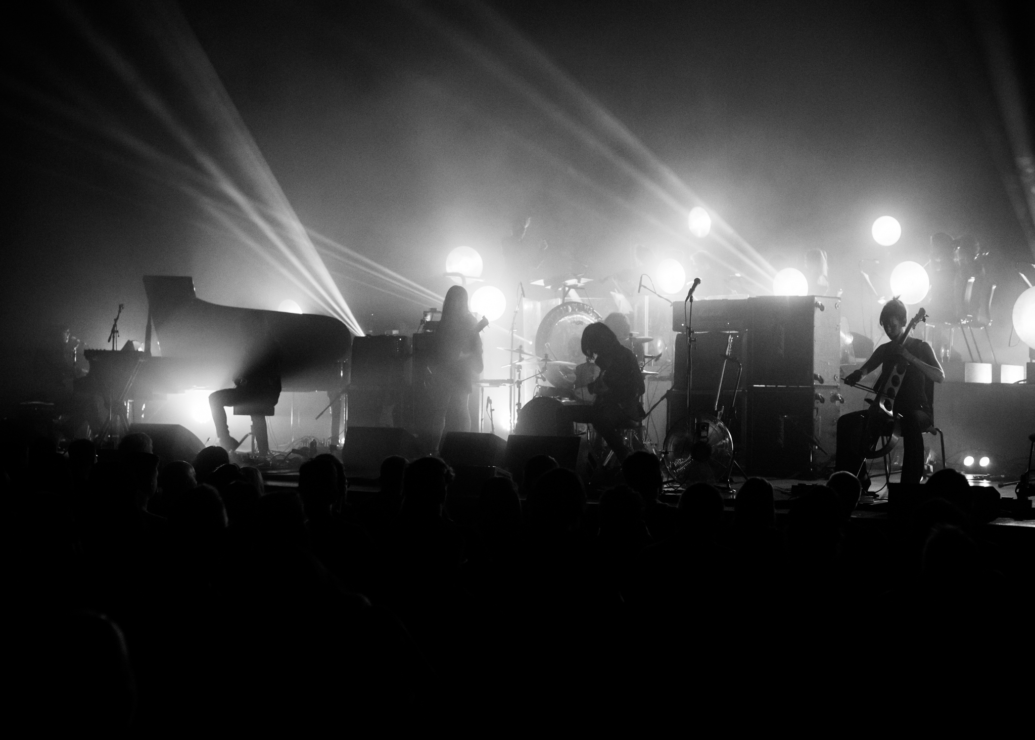 As MONO quietly take up their positions downstage, the orchestra strike up in opening piece God Bless, accompanied by the gentle whistle of idle amplifiers. The rock quartet join in the lilting introduction of After You Comes The Flood and as the piece falls into it’s dramatic rhythm, the stage comes alive with movement and light. Both ensembles are made nearly invisible by the intense brightness emanating from the stage, which seizes everyone in the room with the sheer theatricality of it all. As the track reaches it’s noisy crescendo, the quality of the sound mixing is fully apparent; powerful, without being overwhelmingly loud, each of the twelve or so musicians on stage – acoustic or amplified – can be heard with absolute clarity. For a band who identify more with contemporary classical music than with post-rock, a label they are assigned and have consistently rejected, tonight they are setting out to prove that the concert hall is more their home than the nightclub.