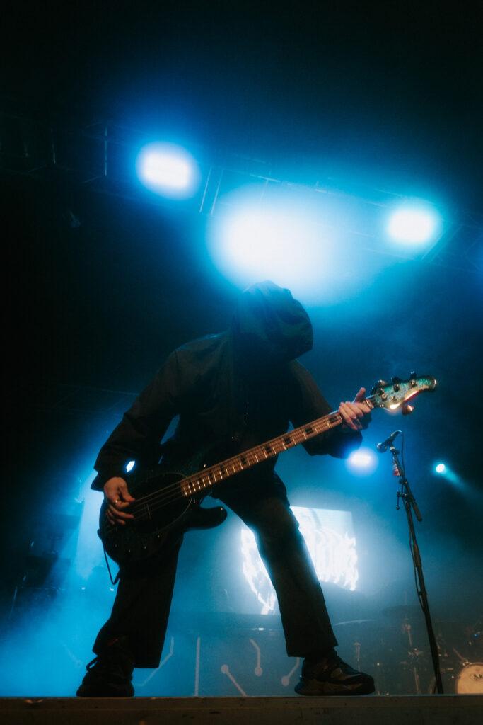 Compared to previous tours, Chris is dressed surprisingly casual – looking as if he just walked in from his 9-to-5 to casually play a metal show. This contrasts sharply with the rest of the band, who are decked out in full stage gear, makeup, and masks.