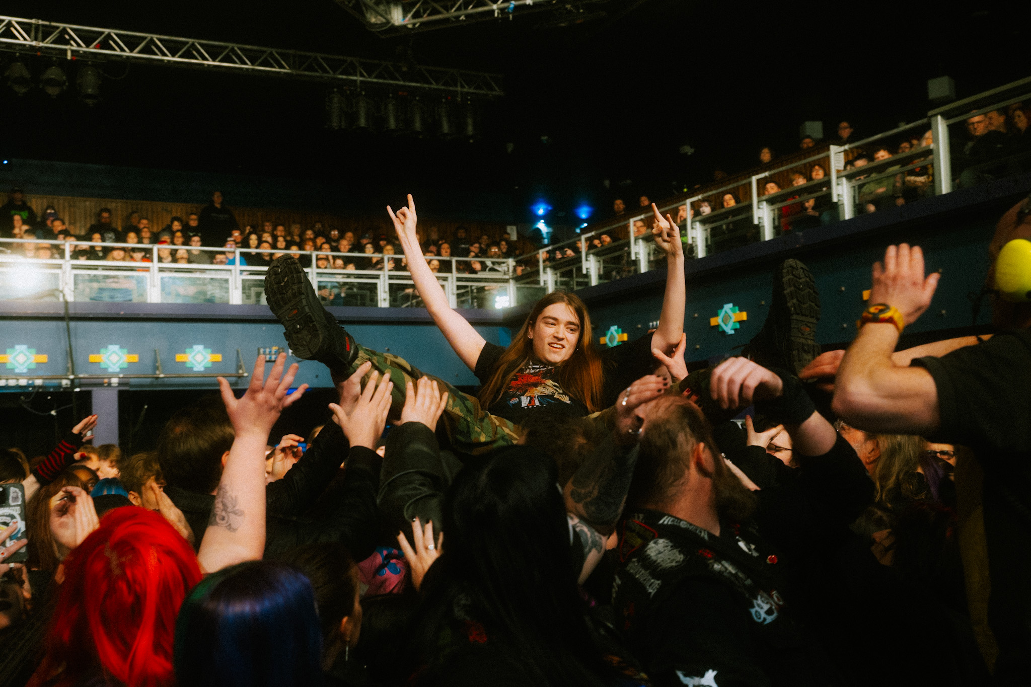 The request comes a little too soon, though – the crowd is still shaking off the cold. But after just one song, the energy shifts. The pit opens up, and things go hard. By the second song, Demon King, crowd surfers emerge, and Kyle commands, “Make sure to surf this venue from left to right.” By the third, the stakes are raised: “Split this room in half.”