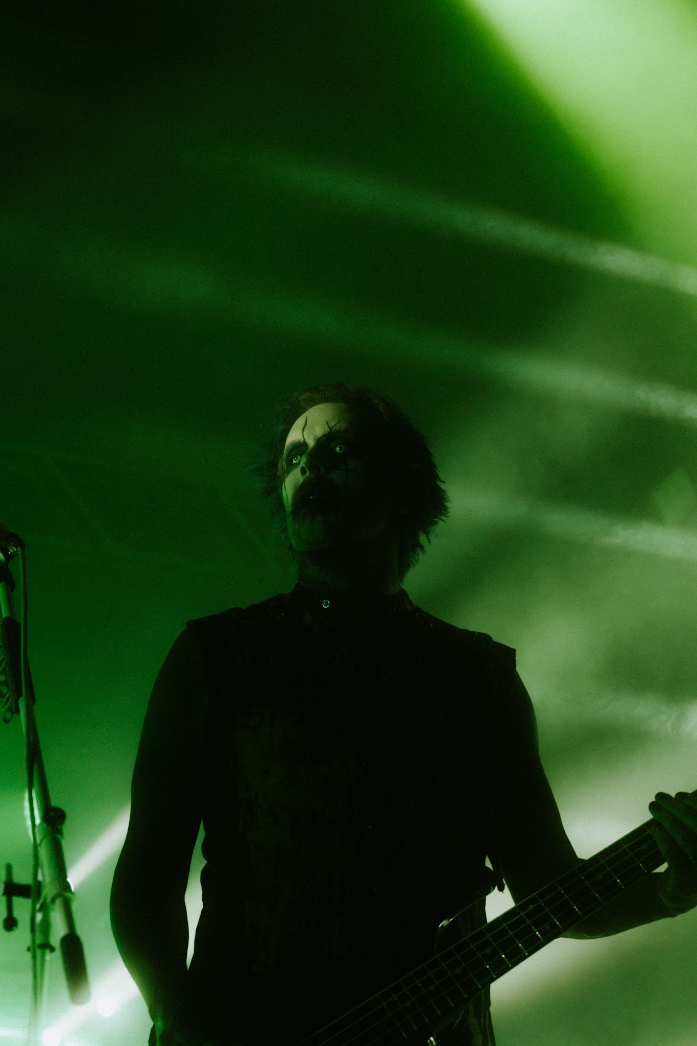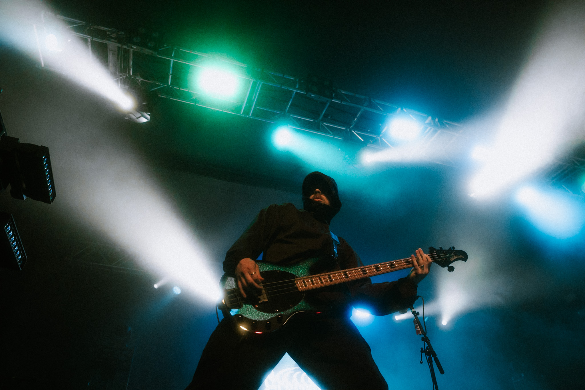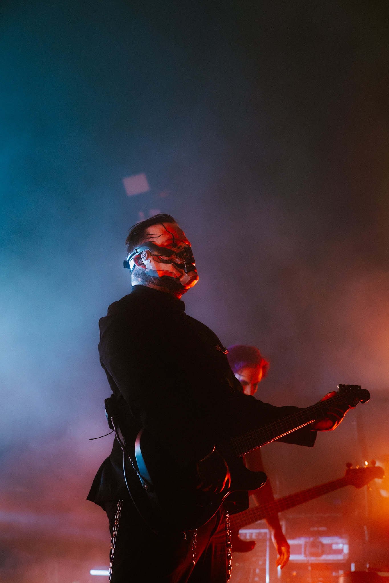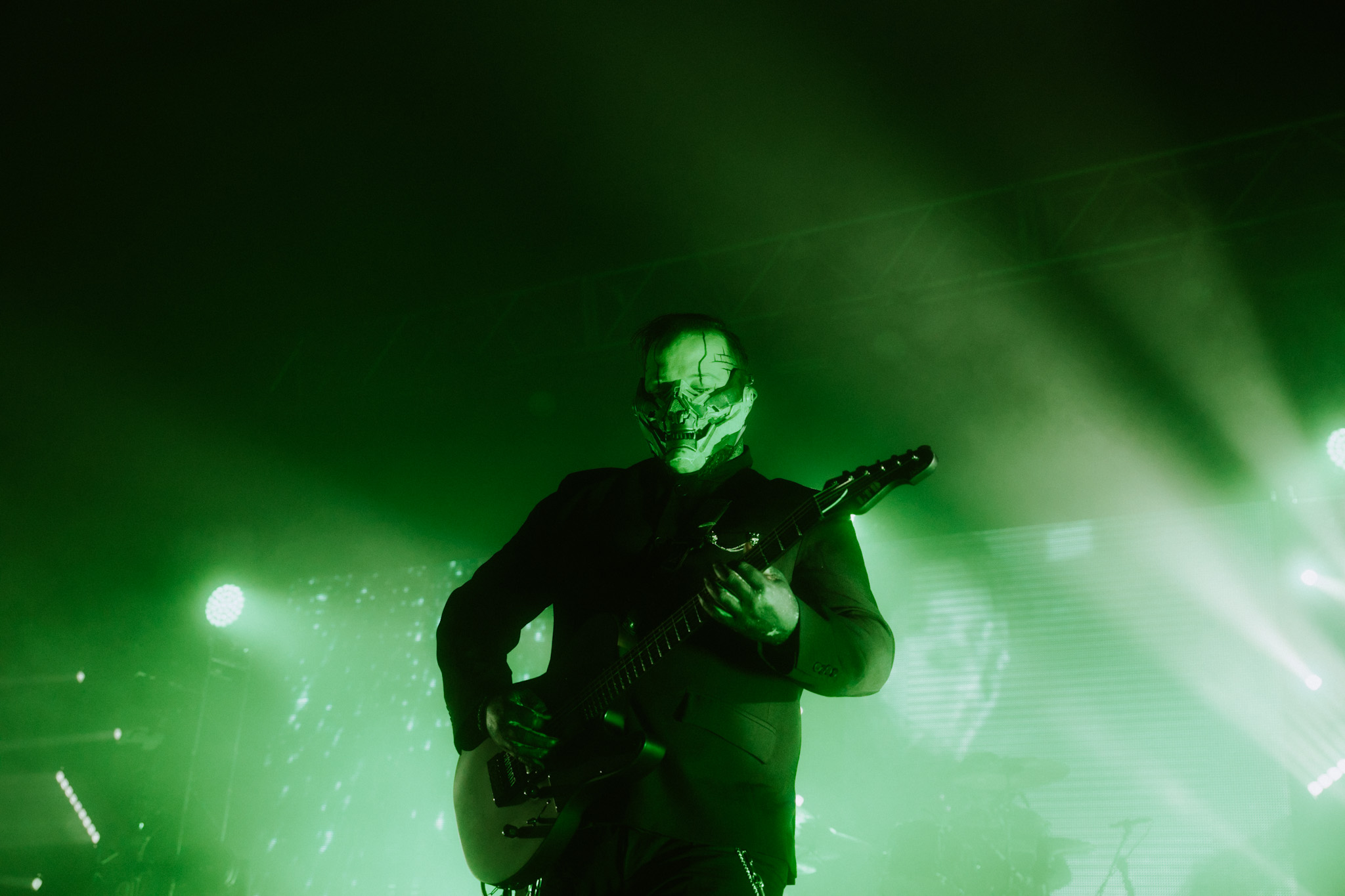 Compared to previous tours, Chris is dressed surprisingly casual – looking as if he just walked in from his 9-to-5 to casually play a metal show. This contrasts sharply with the rest of the band, who are decked out in full stage gear, makeup, and masks.
