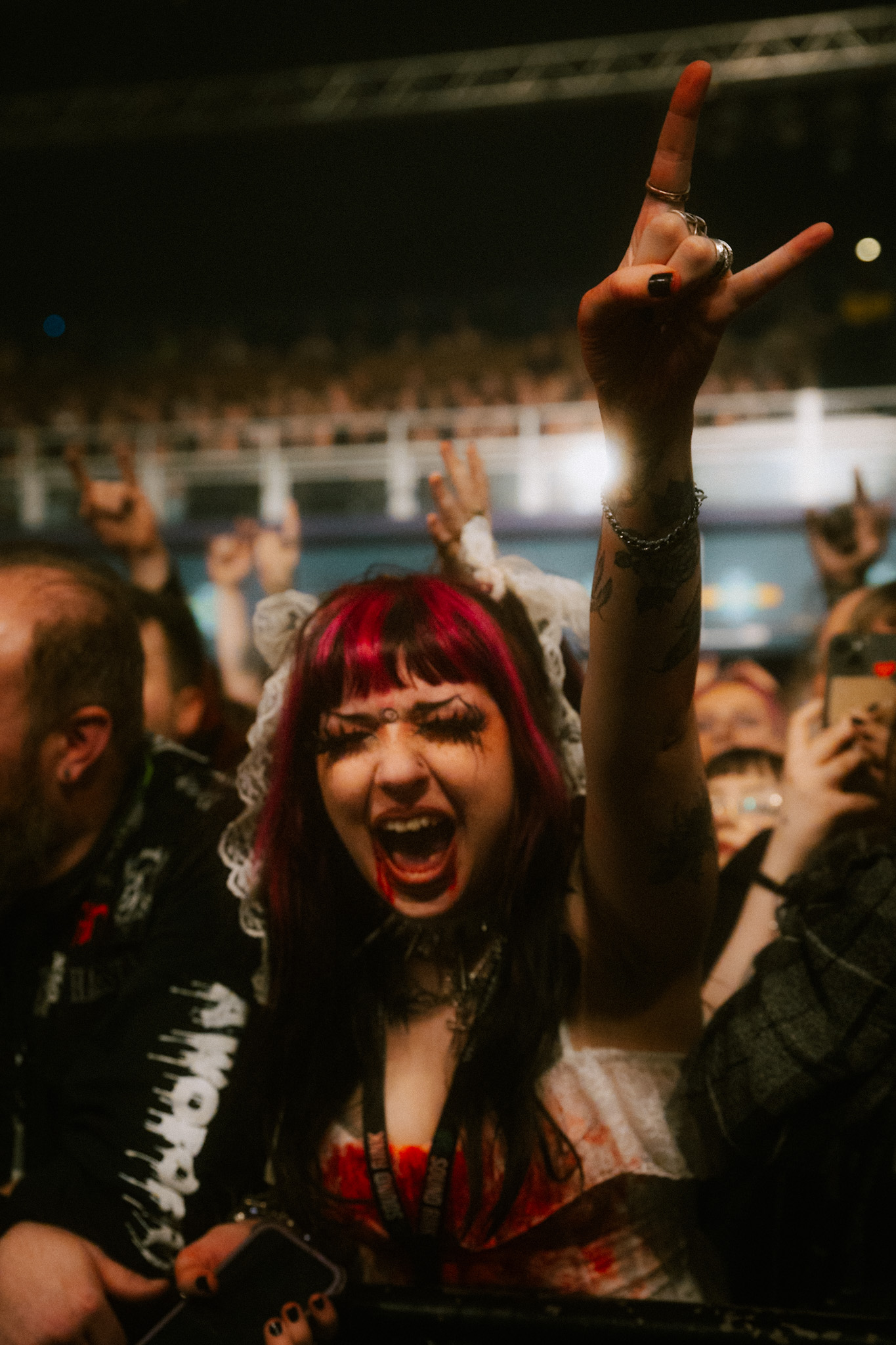 With bigger venues come bigger productions, and MOTIONLESS IN WHITE stepped up their game. More lights, screens displaying visuals and lyrics for crowd sing-along, and best of all, dancers. Throughout the set, performers appear in various costumes, adding extra storytelling elements. Whether they’re dressed as werewolves, spraying the crowd with water guns, or using angle grinders for sparks, these moments elevate the show to the next level.