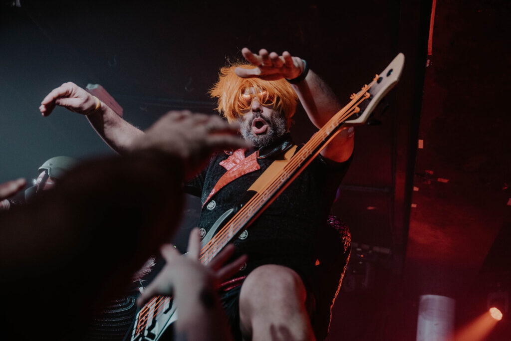 The stage leaps out of the Mongolian Steppes and into a rainbow junkyard of tutus, fluorescent wigs with matching guitar strings, and fluffy belts that are pretending to be guitars. The quintet have come to bedazzle the Underworld with as much bonkersness as they can before vocalist Potowotominimak’s mother comes to tell them off for making too many mum jokes. The crowd’s first invitation to singalong is to the Viking battle chants in Stormwarrior Of The Storm, a song which sees a costume change for vocalist Mister Baffo – because how could they sing a song about storms without him putting a yellow raincoat on over his tight, purple fish-scaled top.
