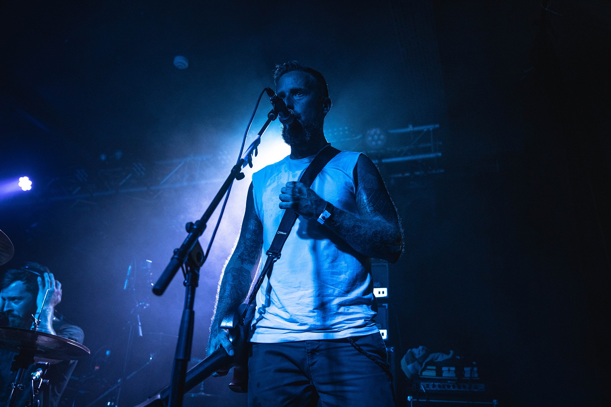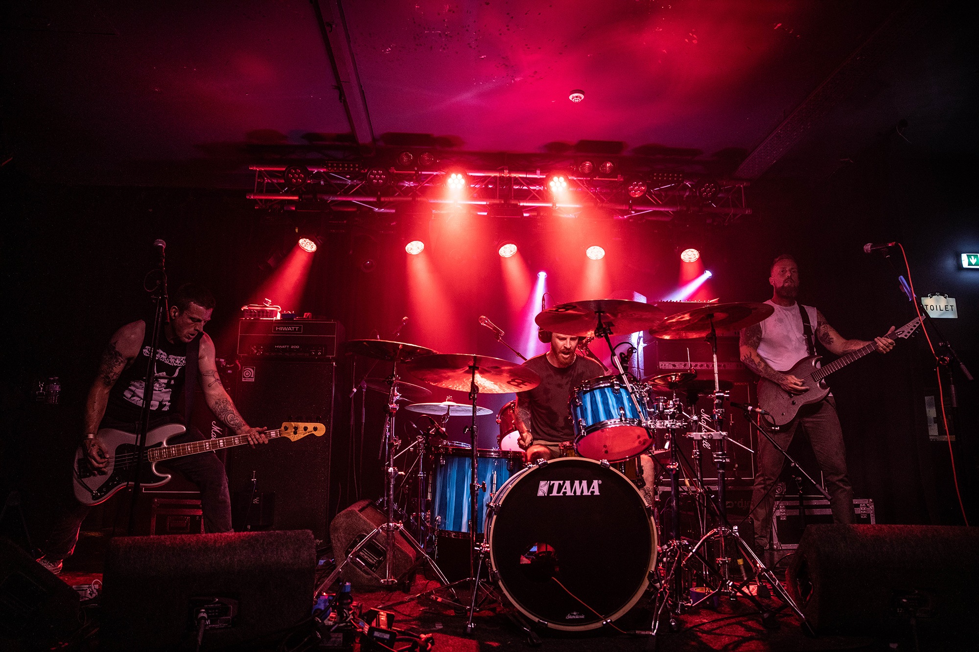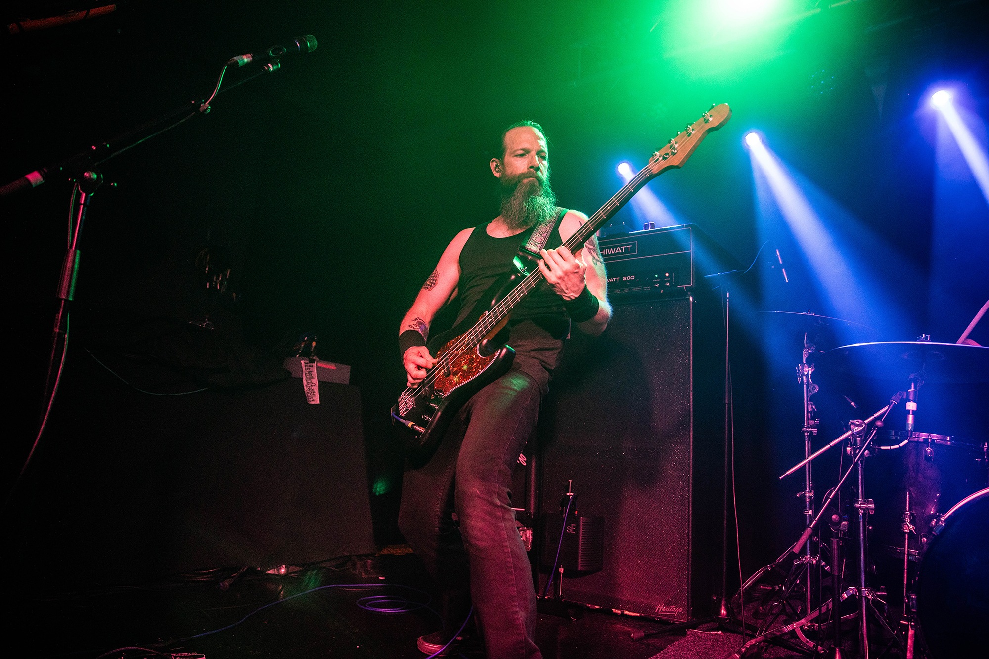 It means opener SILVERBURN find themselves promoted to sole support, and they’re determined to get the crowd moving despite the oppressive summer heatwave. More accurately, they have to try and move what little crowd there is; despite the bar downstairs venue doing a steady trade with many long haired, denim clad people, they’re very slowly filtering upstairs. The trio play a heady blend of hardcore aggression, sludge and post-metal, one part CULT OF LUNA to one part END and some flourishes of thrash alongside it. Mainman James Isaac summons cavernous bellows as they throw in chugging breakdowns amidst the churning carnage with occasional forays into more psychedelic territory. The room fills out nicely during their set, but ultimately they’re a serviceable opener with solid riffs that veer a little too often into basic chugs.Â