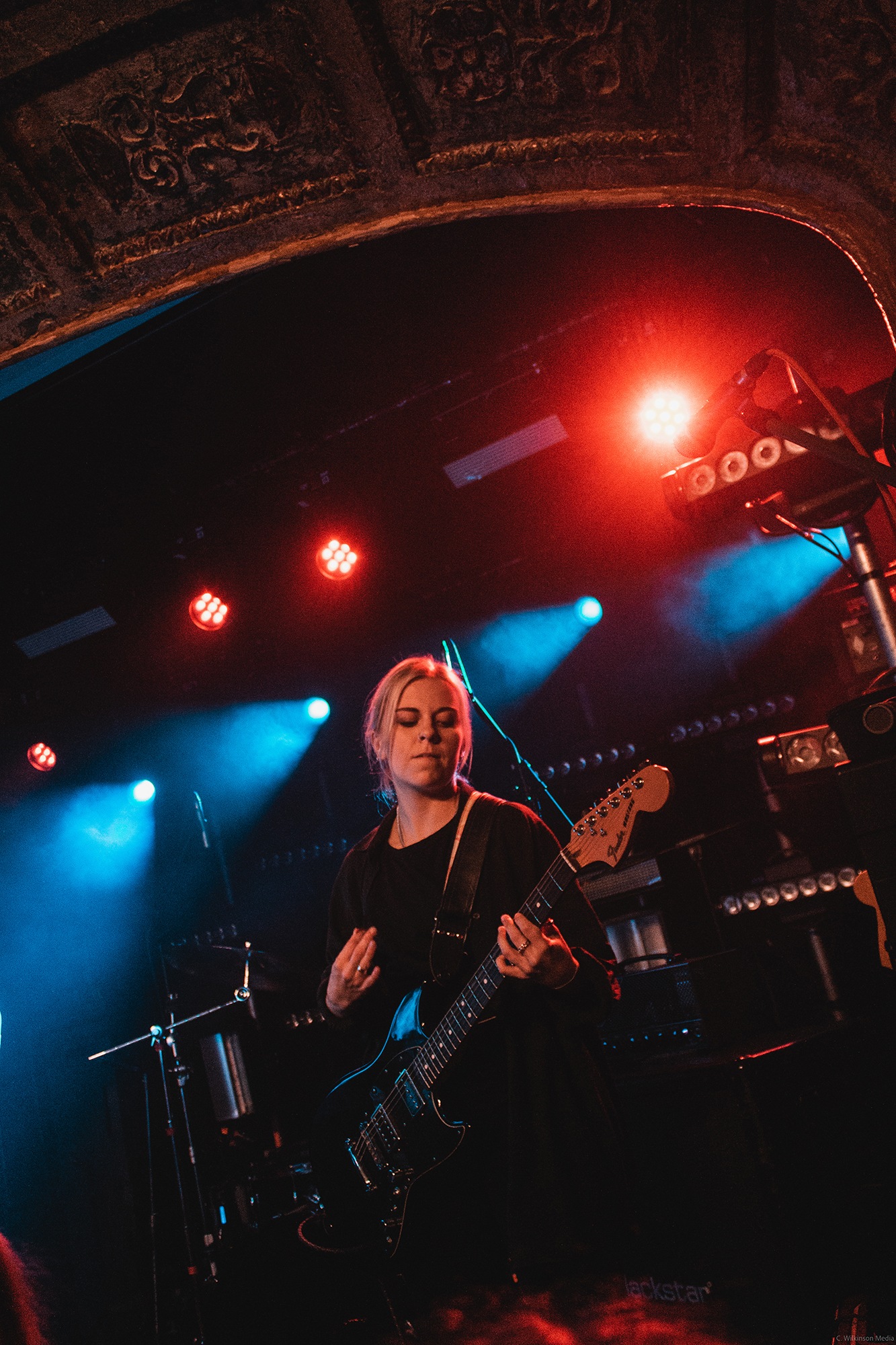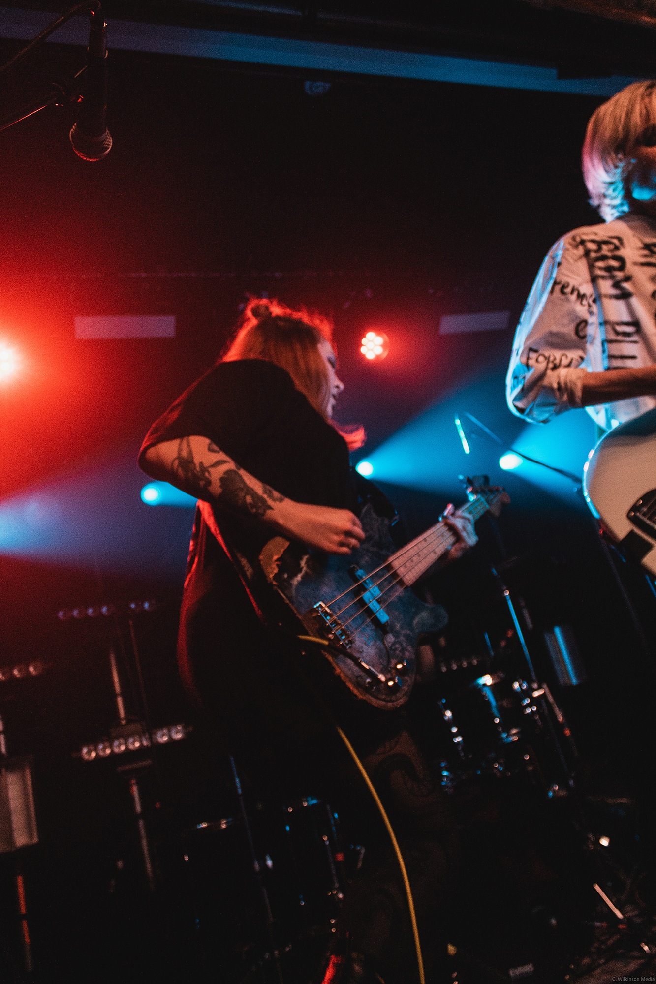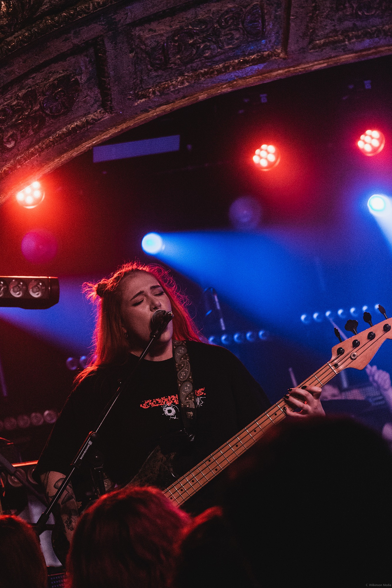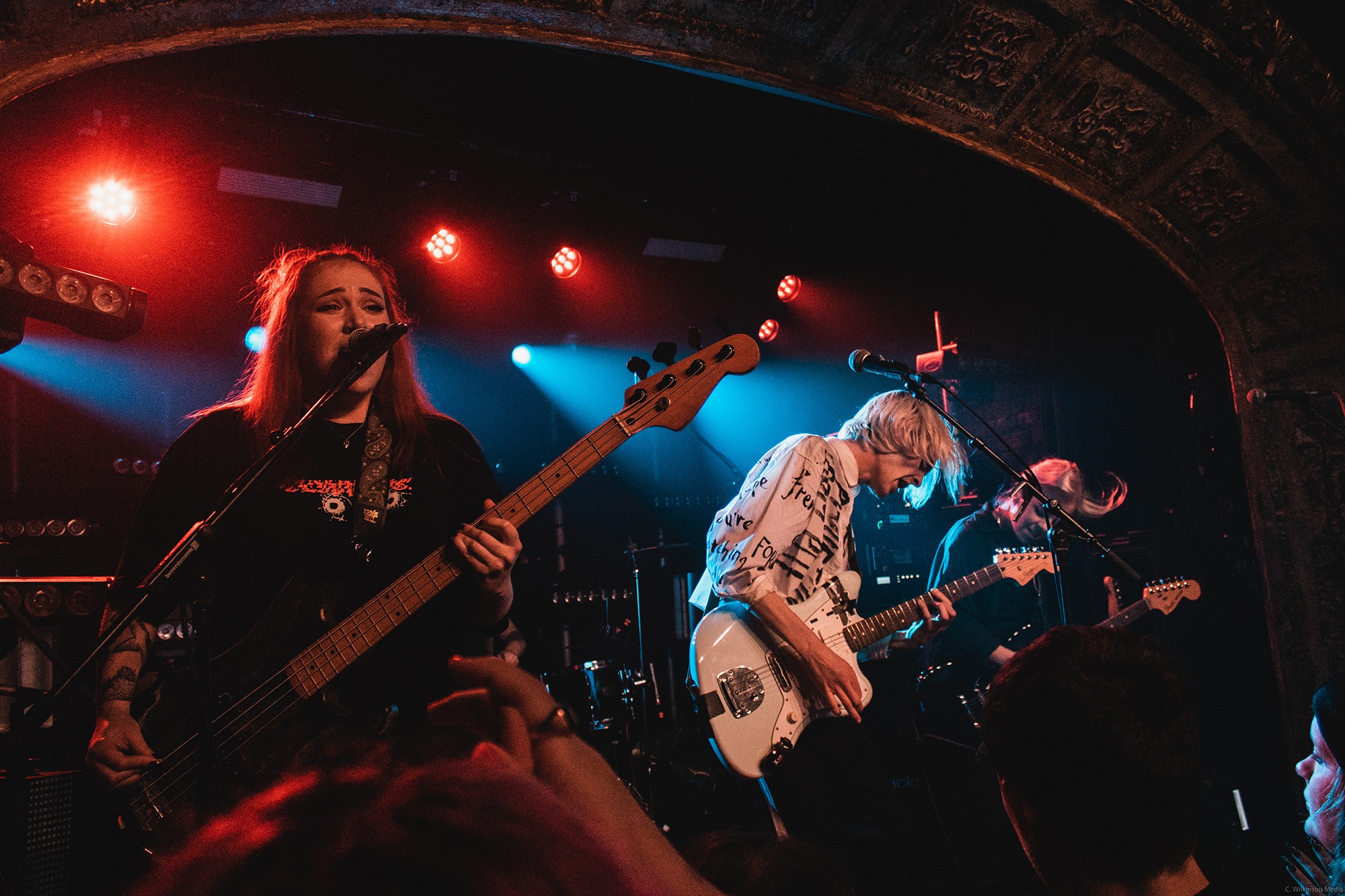 One thing that’s immediately striking is just how small the room is; holding just over 300 people, it’s a wonderfully intimate space for such a remarkable evening. Opening the second night, where NORMANDIE are playing 2018’s White Flag, are London’s own DELAIRE THE LIAR. Already causing a stir in their own right, and deservedly so, the quartet take to the stage with new stage getup including jackets scrawled with spiky writing that befits the angrier parts of their sound. The dual vocal of Ffin Colley and Em Lodge complement each other both during those aggressive as well as softer moments. With just a thirty minute set, they pack in plenty of that duality, especially on material from their excellent 2021 EP Eat Your Own. The crowd seem to enjoy it too, loud applause after every song and more than a few singing along. If they keep on like this, they’ll have outgrown venues like OMEARA before long.