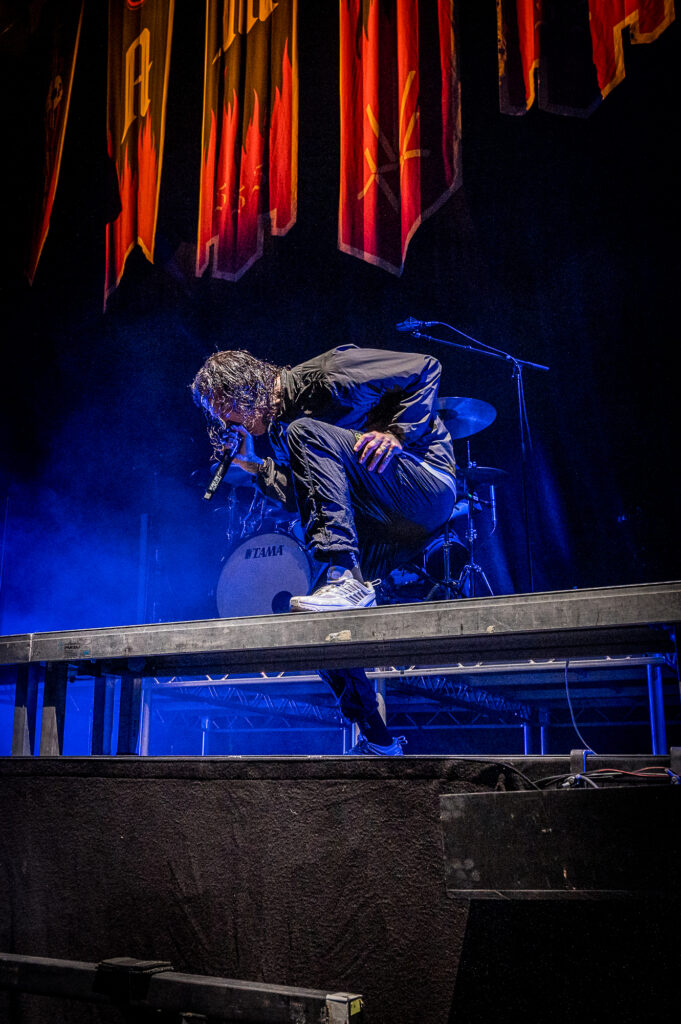 It took a long time for PARKWAY DRIVE to get to the stage, and that includes the first two songs of this setlist. Energy was high for opener Carrion, euphoric and bouncing, as Prey takes full advantage of the crowd’s elated status. The band churn out heavy riffs on a small central stage, as frontman Winston McCall flails around the stage in full white pyjama couture, KATE BUSH Wuthering Heights style.Â