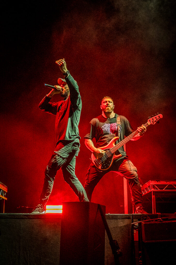 Aside from the final curtain call, this is the most stripped-back the band get. A full dramatic reveal of the stage, dripping with skyline scaffolding and contemporary dancers contort their bodies out of shape into recent-hit Glitch. This is not a show, it’s a full-on production, with the PARKWAY DRIVE fully ascended to maestros of their own hellish creation. The opportunity for pyro overtakes the stage, as it swirls around the band with explosive results. Here, Vice Grip comes unexpectedly early in the set, and the crowd responds with their full undivided attention.Â
