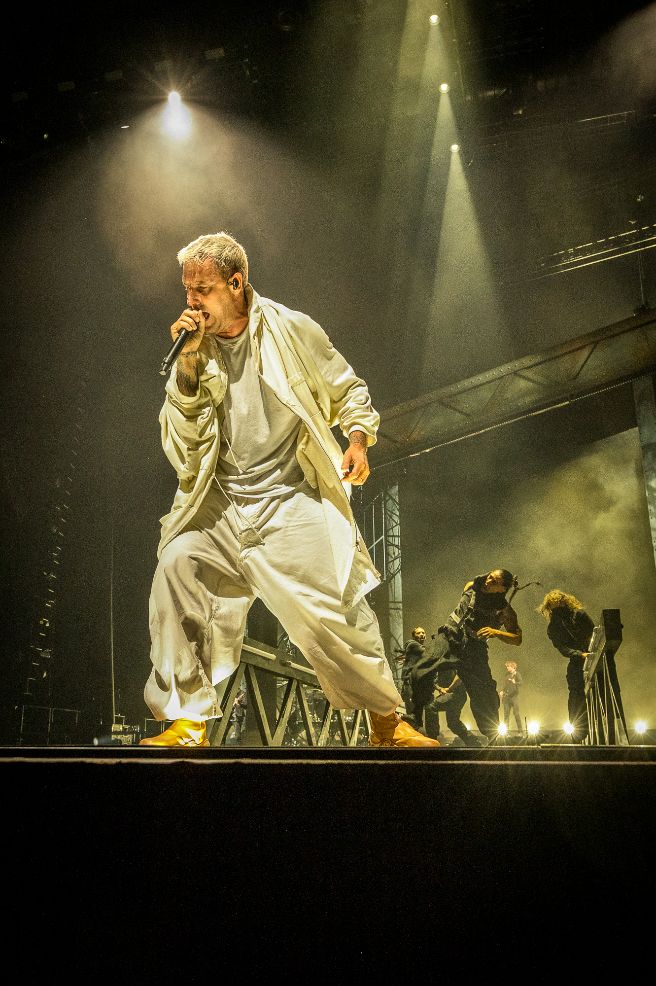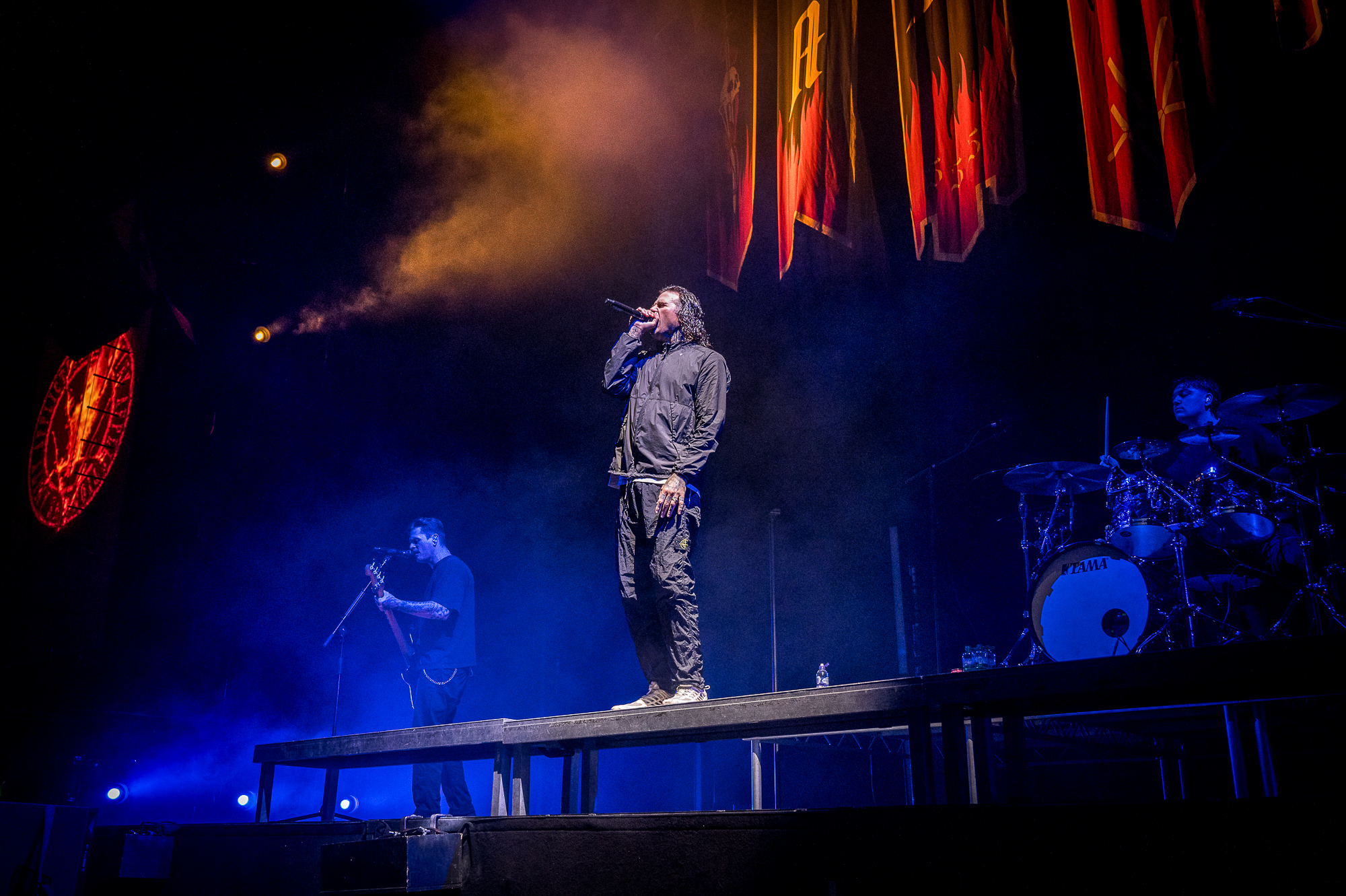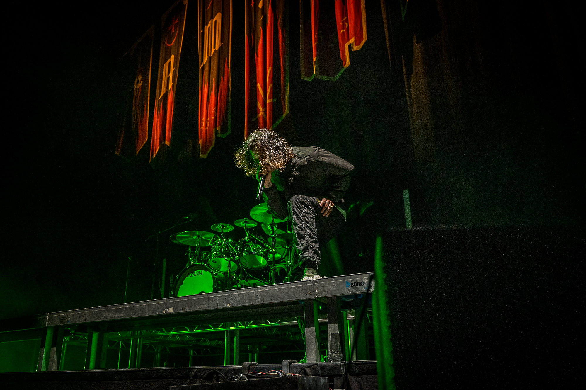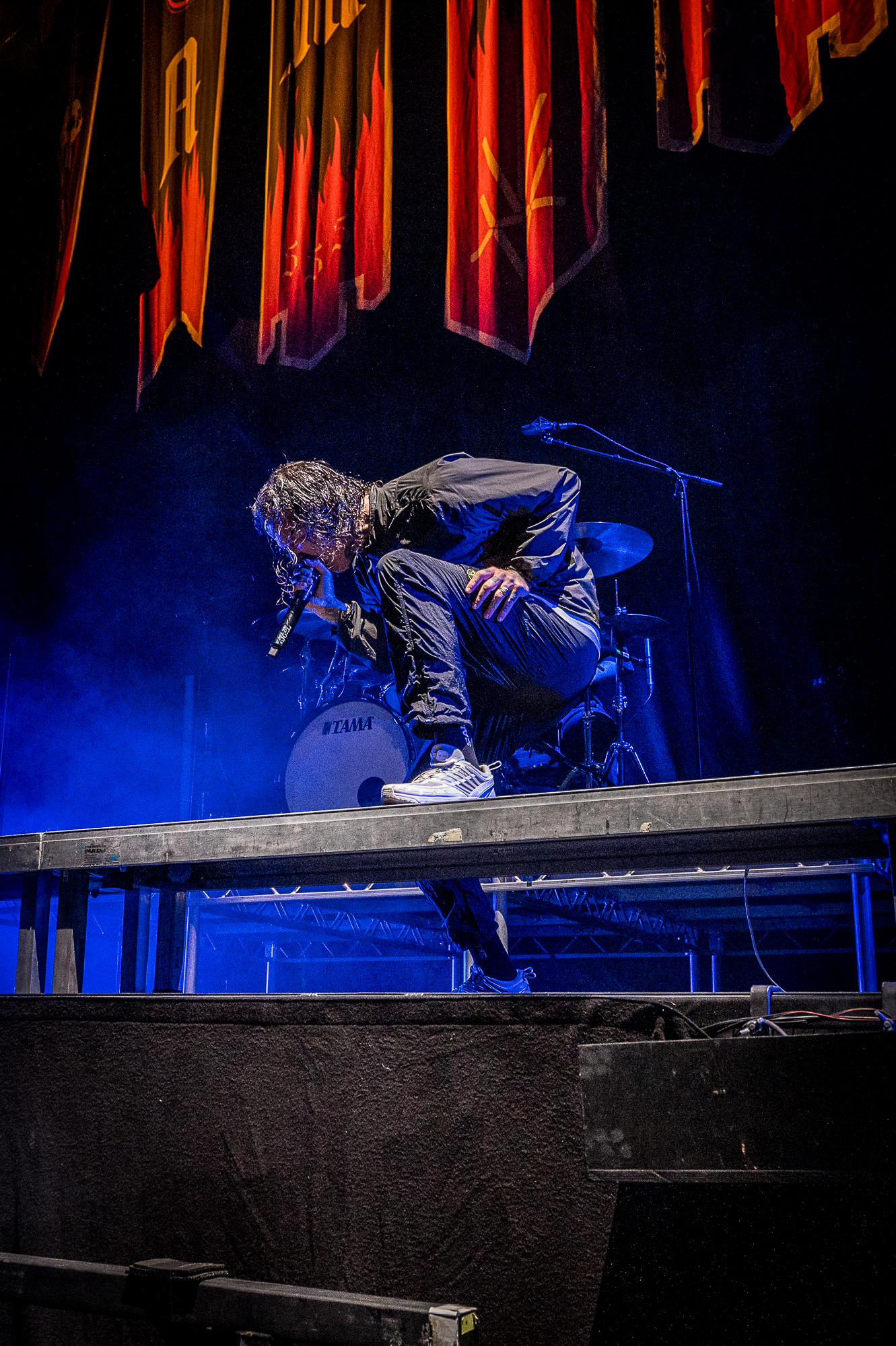 It took a long time for PARKWAY DRIVE to get to the stage, and that includes the first two songs of this setlist. Energy was high for opener Carrion, euphoric and bouncing, as Prey takes full advantage of the crowd’s elated status. The band churn out heavy riffs on a small central stage, as frontman Winston McCall flails around the stage in full white pyjama couture, KATE BUSH Wuthering Heights style.Â