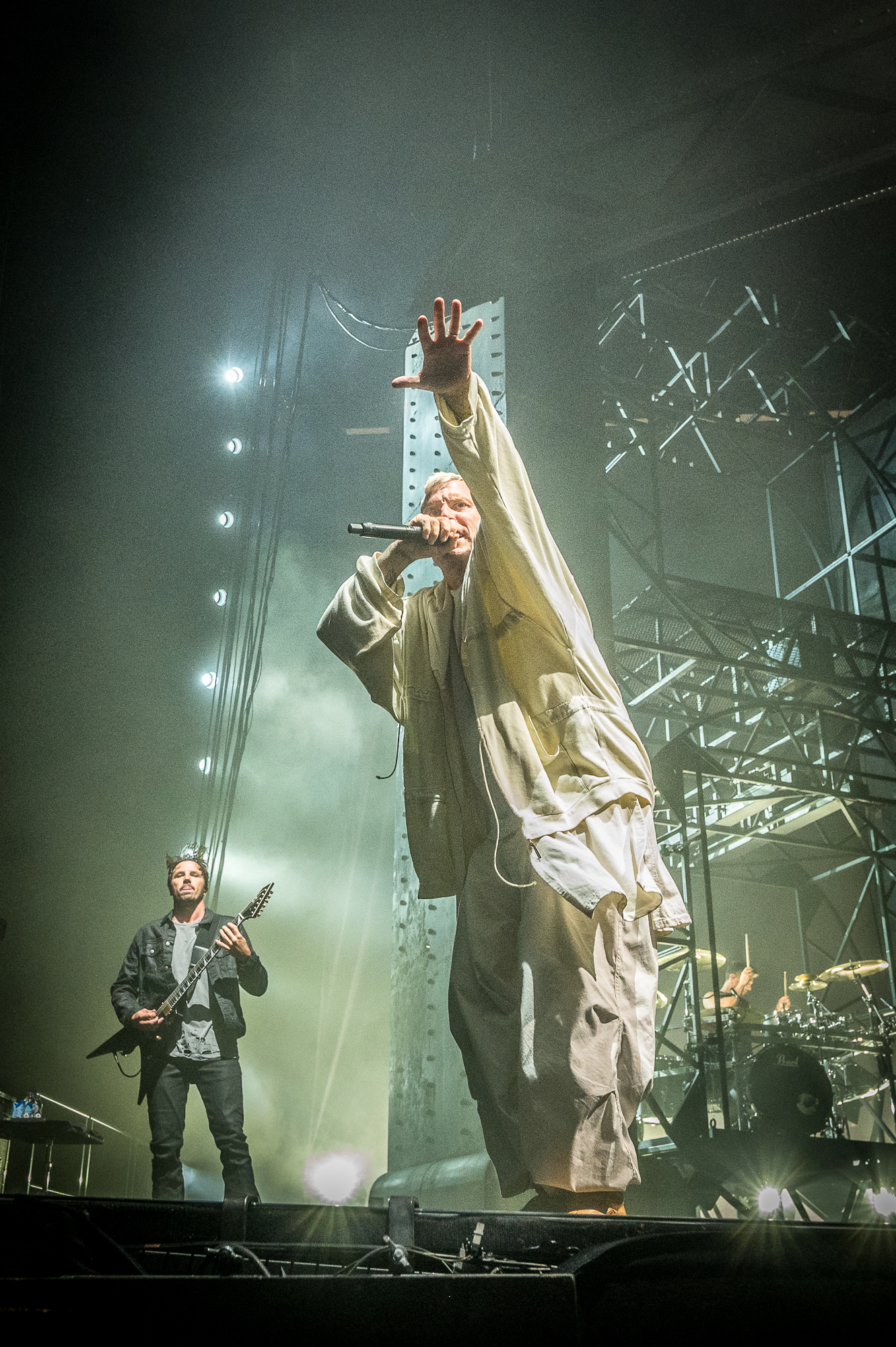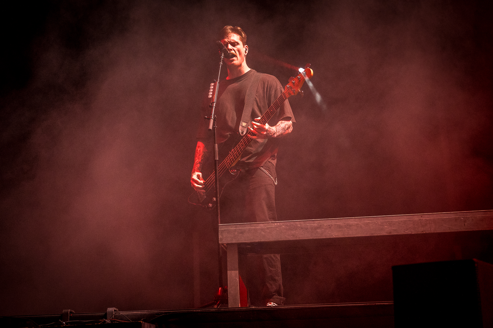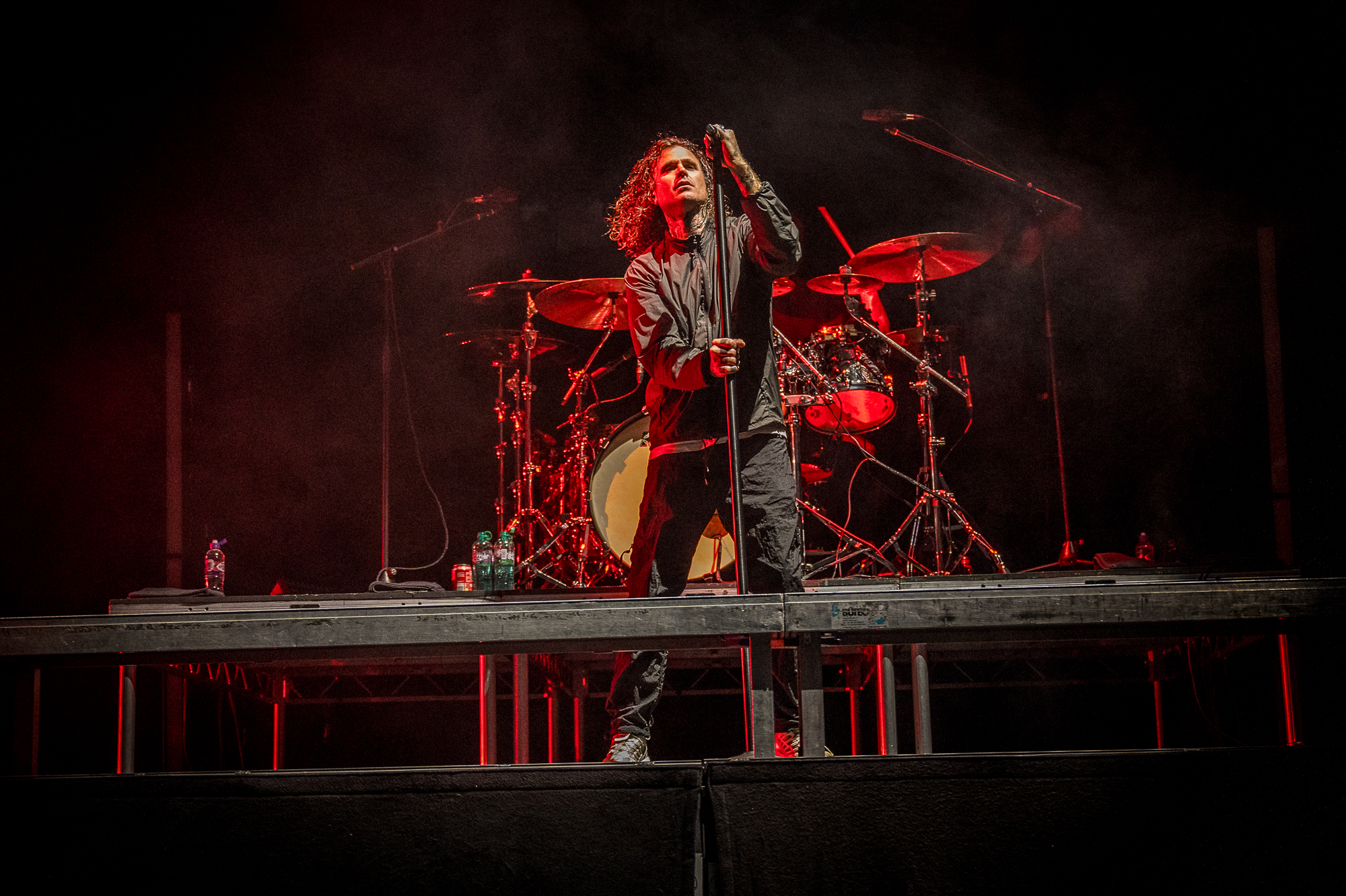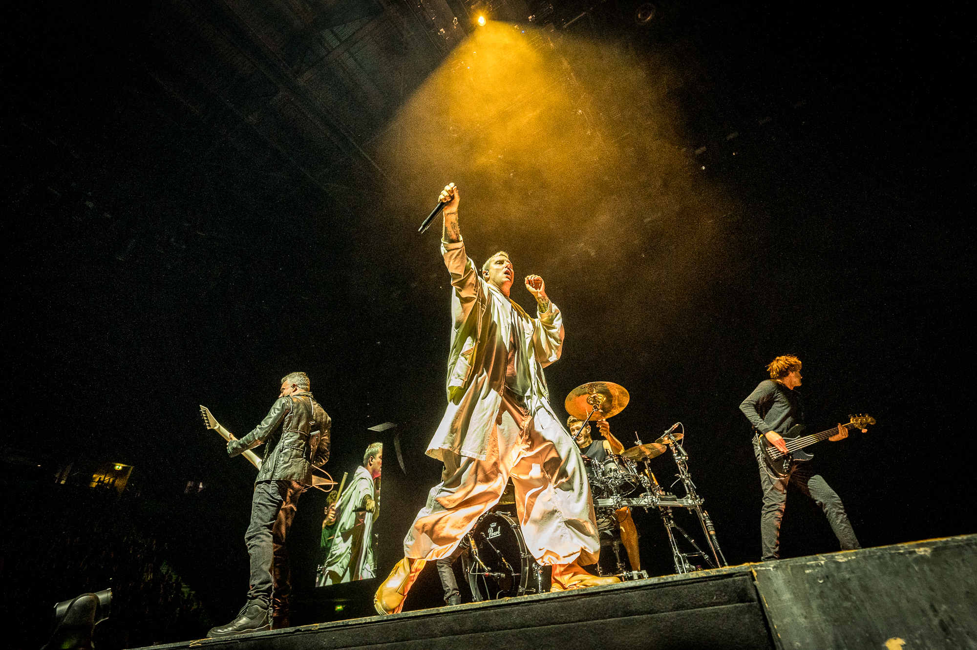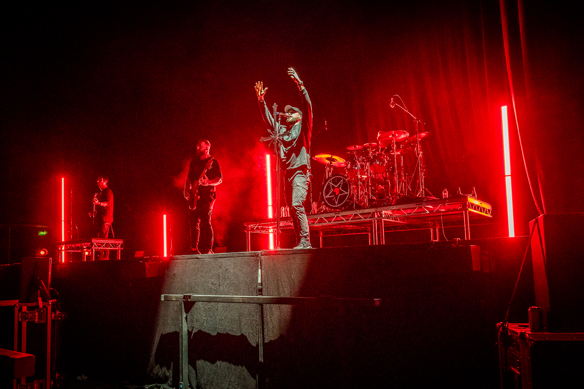 In an attempt to go right back to their roots, the band pushed on with a special mash-up edition of their first album, Killing With A Smile. Ten minutes of full-frontal ferocity, wall-to-wall mosh pits in the swirling sea that overtook the arena’s packed floor. Ten minutes later, Winston decides to take centre stage, becoming an anchor point for the crowd to rally around him for Idols and Anchors. Other tracks like Chronos and Darker Still are elevated spectacularly by a three-piece string accompaniment. The show becomes a symphony, hitting the heavy with the sweet bliss of the duelling violins. Wishing Wells, whilst slow to start, feels eerie with the oncoming rain, with wicked meaning drawn out by the robe-clad dancers, occult and unnerving.Â