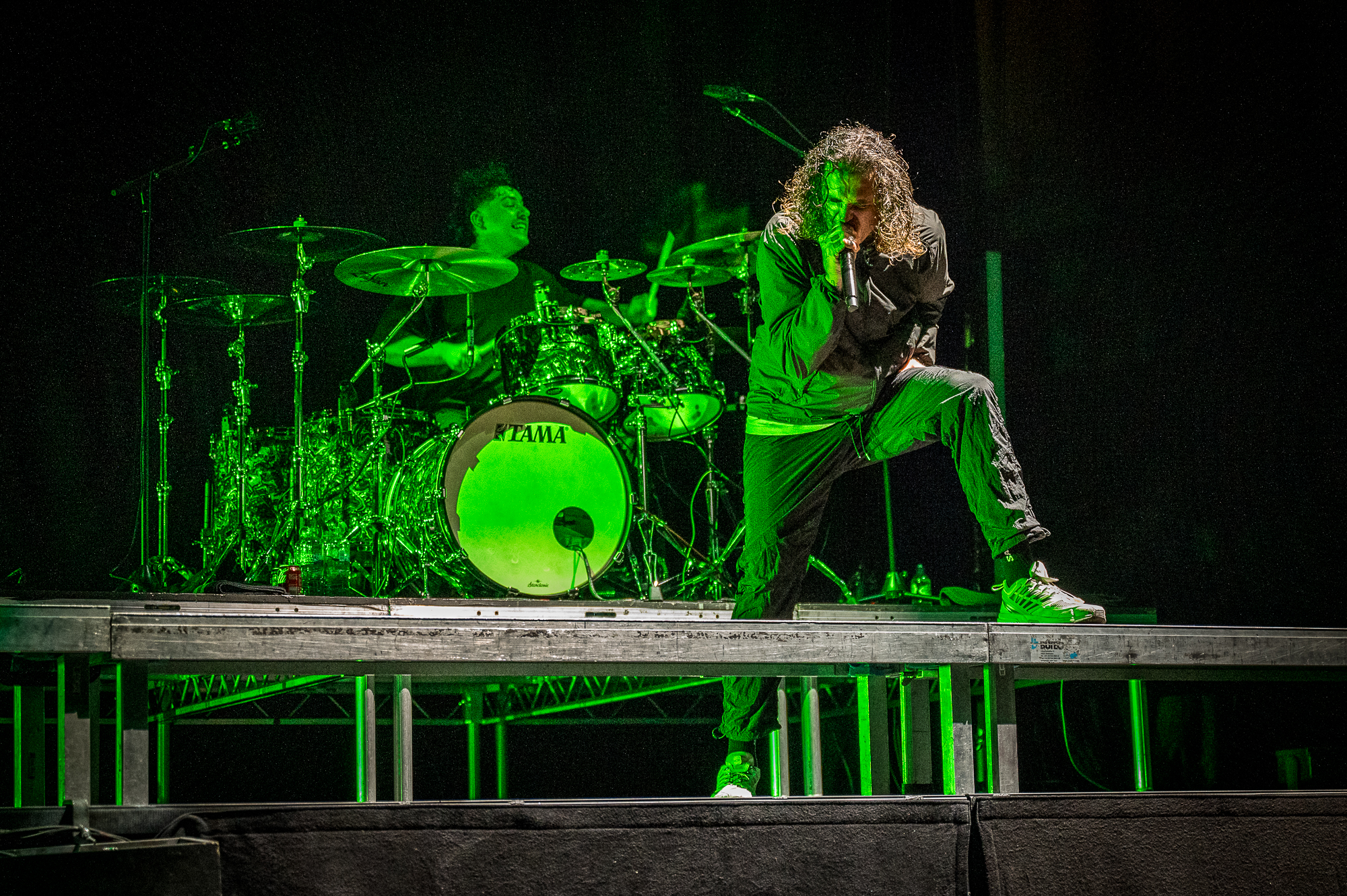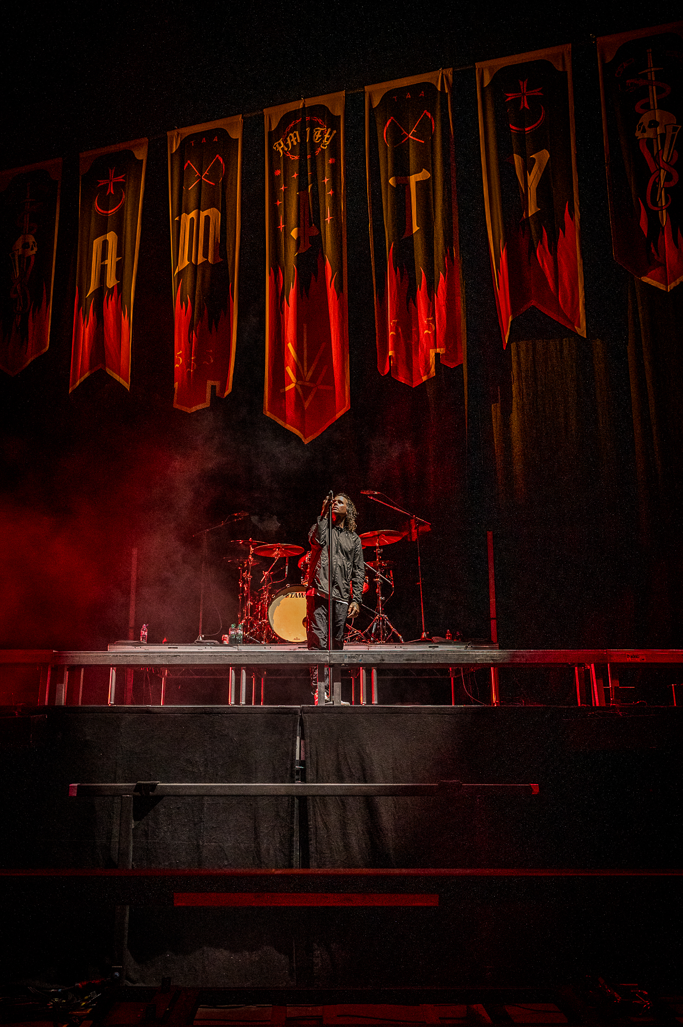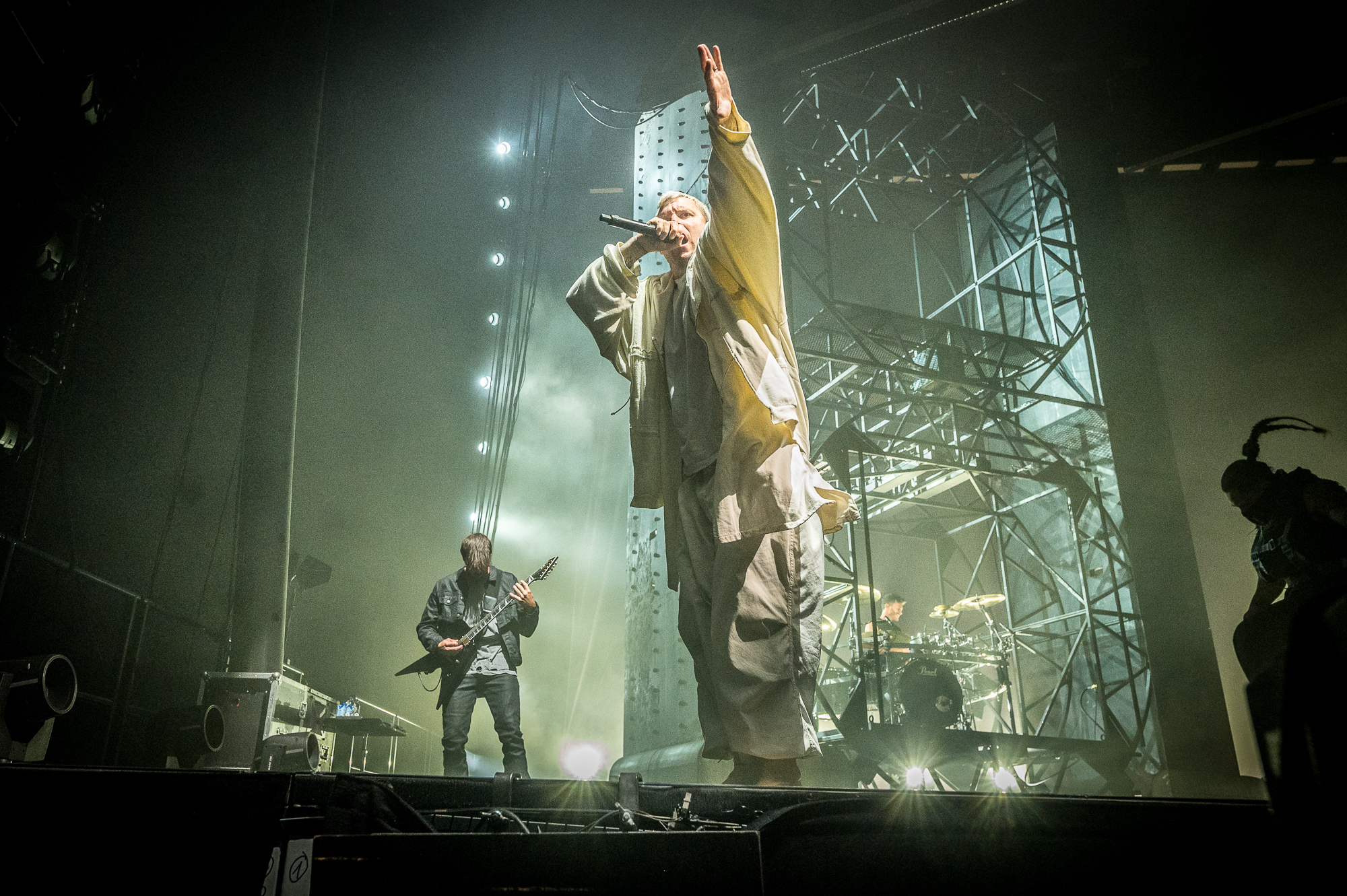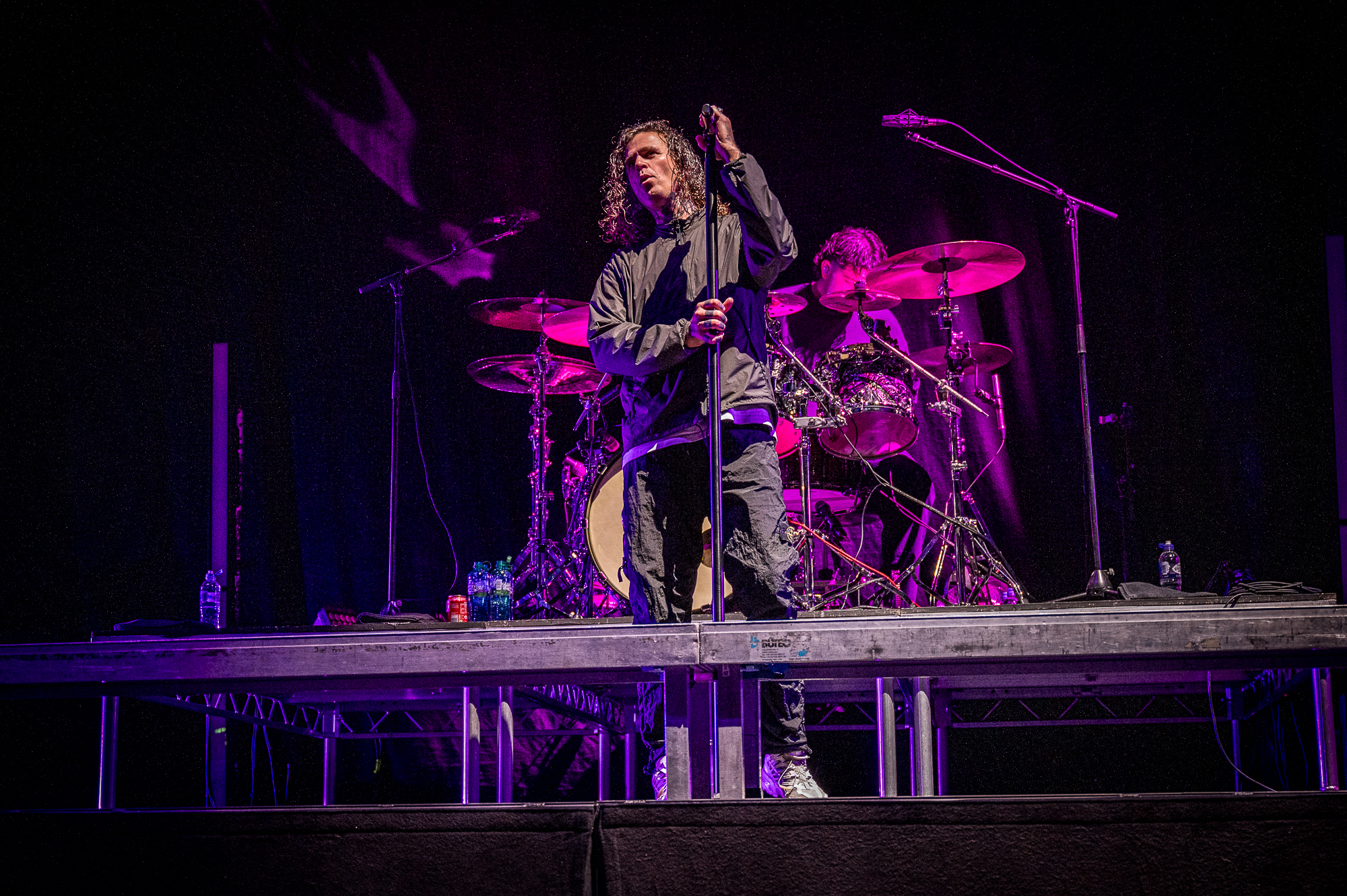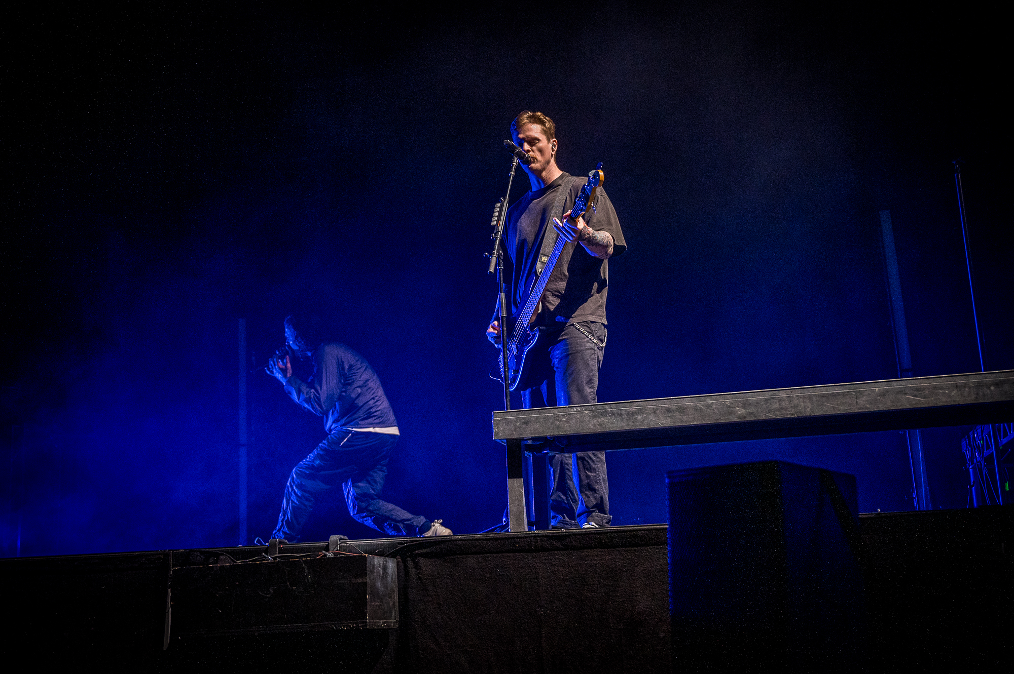 In an attempt to go right back to their roots, the band pushed on with a special mash-up edition of their first album, Killing With A Smile. Ten minutes of full-frontal ferocity, wall-to-wall mosh pits in the swirling sea that overtook the arena’s packed floor. Ten minutes later, Winston decides to take centre stage, becoming an anchor point for the crowd to rally around him for Idols and Anchors. Other tracks like Chronos and Darker Still are elevated spectacularly by a three-piece string accompaniment. The show becomes a symphony, hitting the heavy with the sweet bliss of the duelling violins. Wishing Wells, whilst slow to start, feels eerie with the oncoming rain, with wicked meaning drawn out by the robe-clad dancers, occult and unnerving.Â