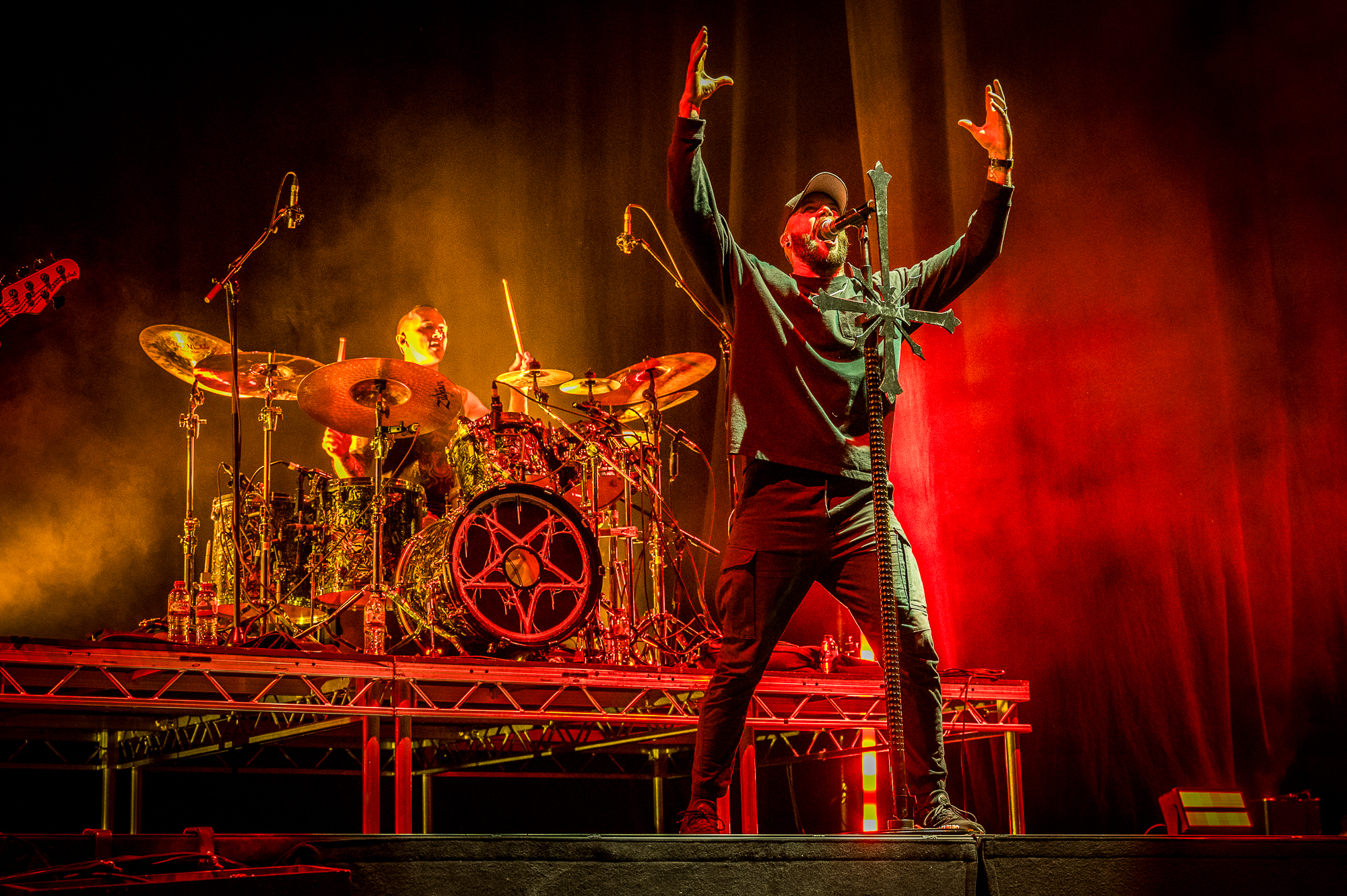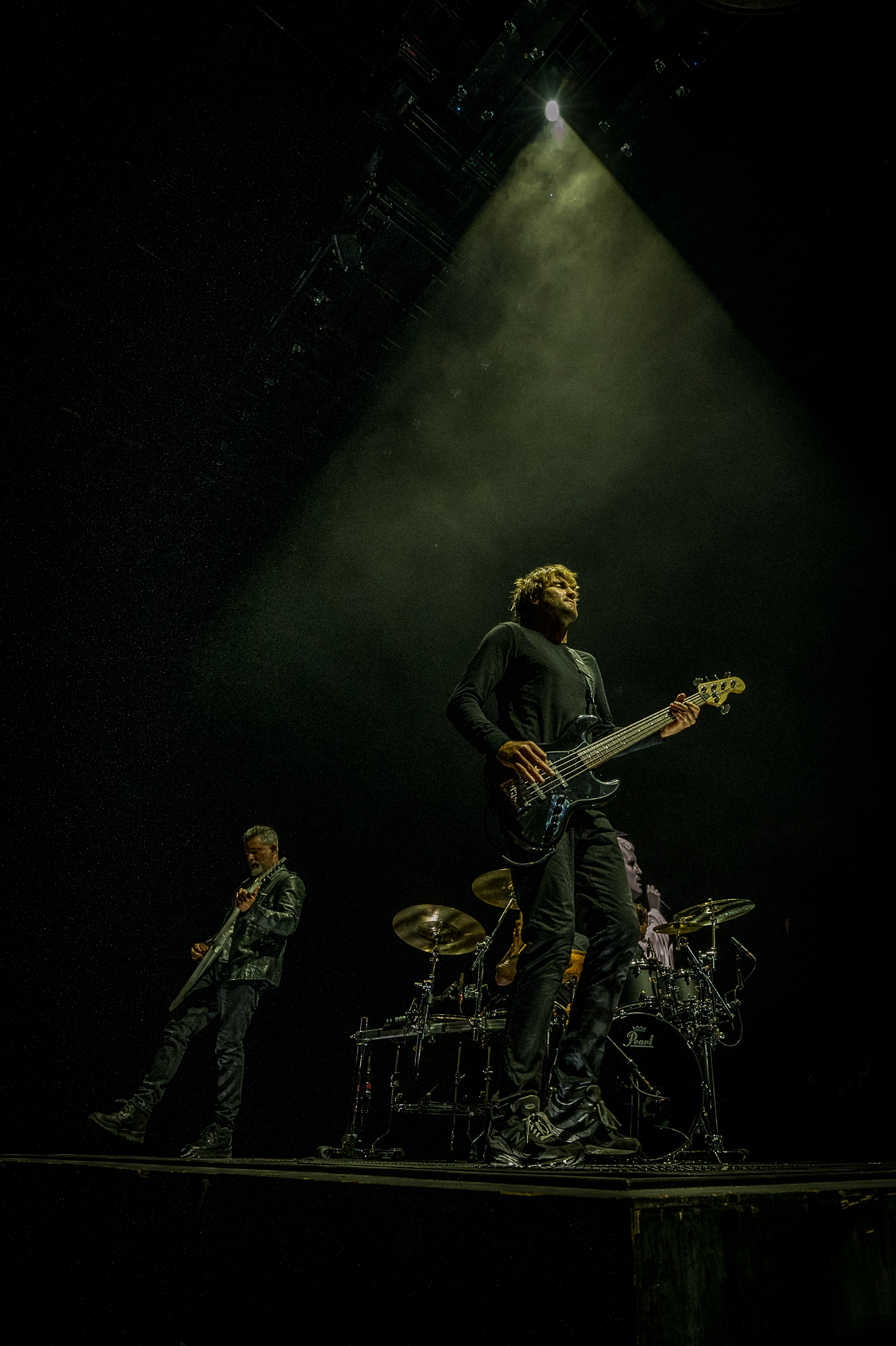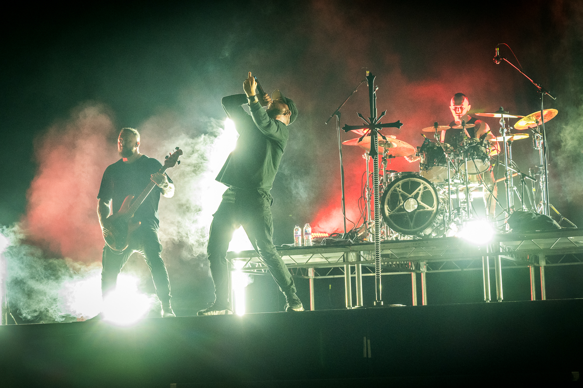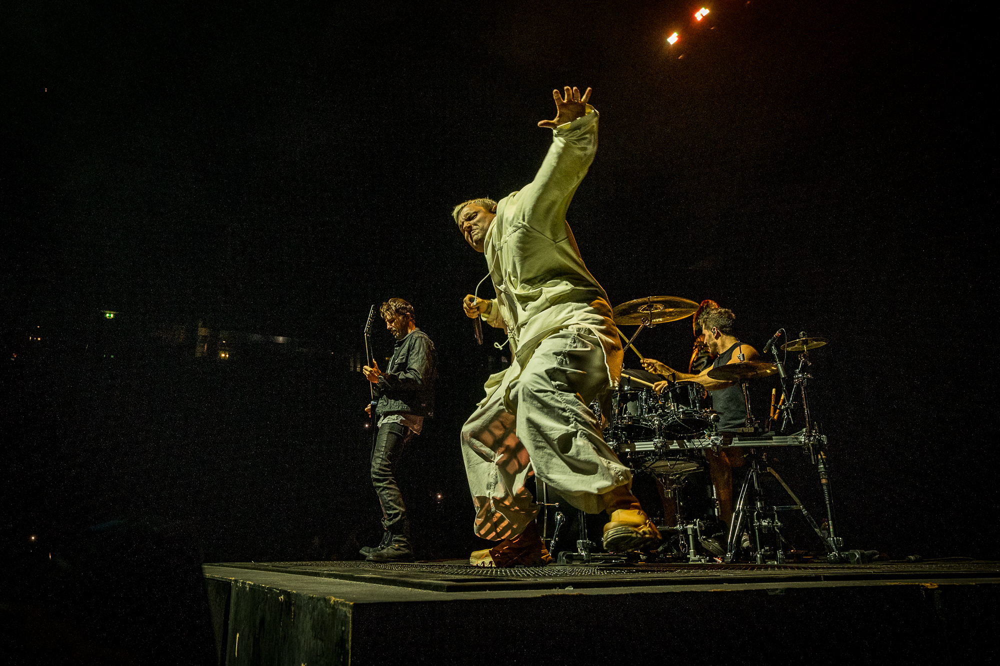 In an attempt to go right back to their roots, the band pushed on with a special mash-up edition of their first album, Killing With A Smile. Ten minutes of full-frontal ferocity, wall-to-wall mosh pits in the swirling sea that overtook the arena’s packed floor. Ten minutes later, Winston decides to take centre stage, becoming an anchor point for the crowd to rally around him for Idols and Anchors. Other tracks like Chronos and Darker Still are elevated spectacularly by a three-piece string accompaniment. The show becomes a symphony, hitting the heavy with the sweet bliss of the duelling violins. Wishing Wells, whilst slow to start, feels eerie with the oncoming rain, with wicked meaning drawn out by the robe-clad dancers, occult and unnerving.Â