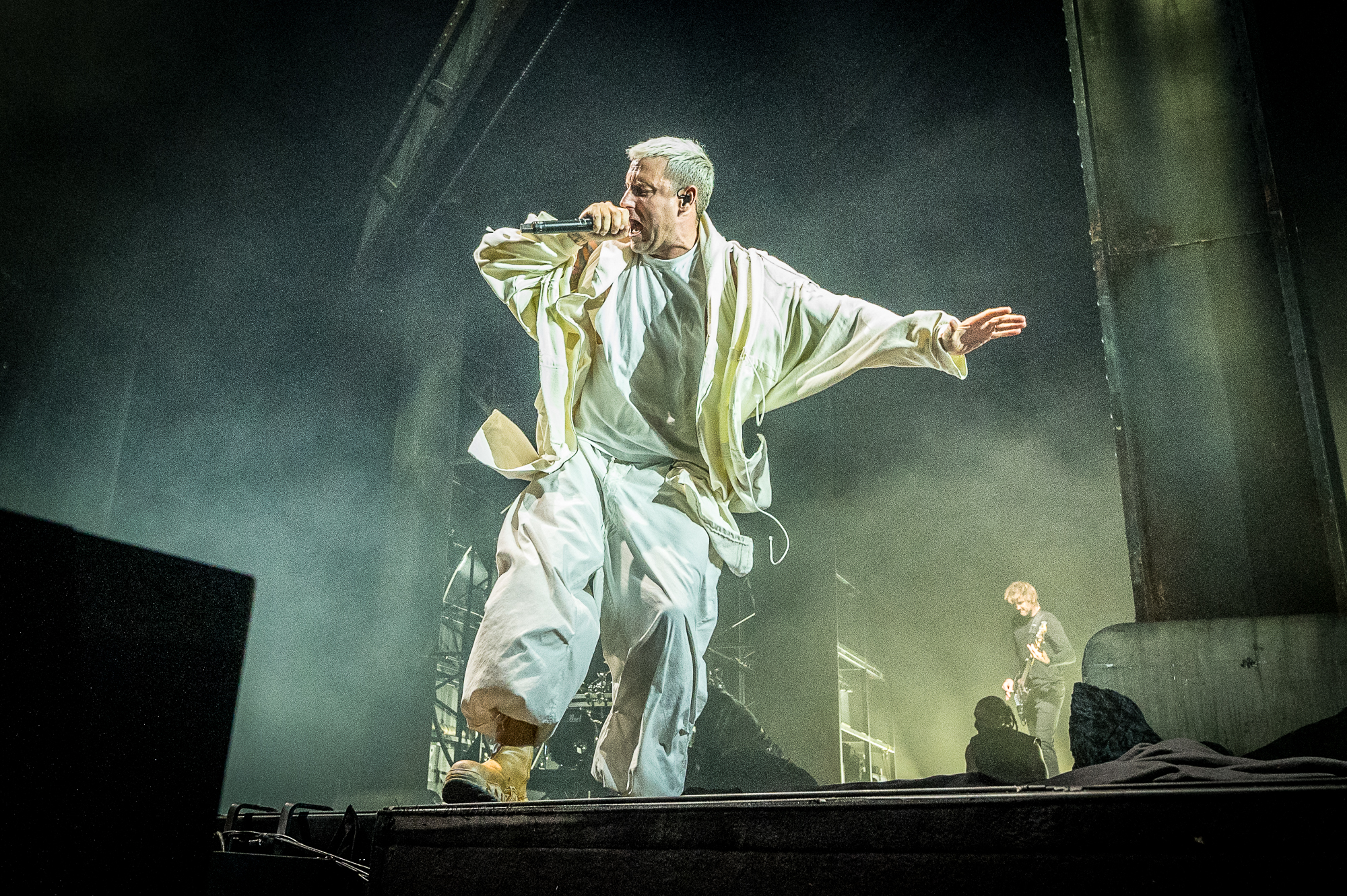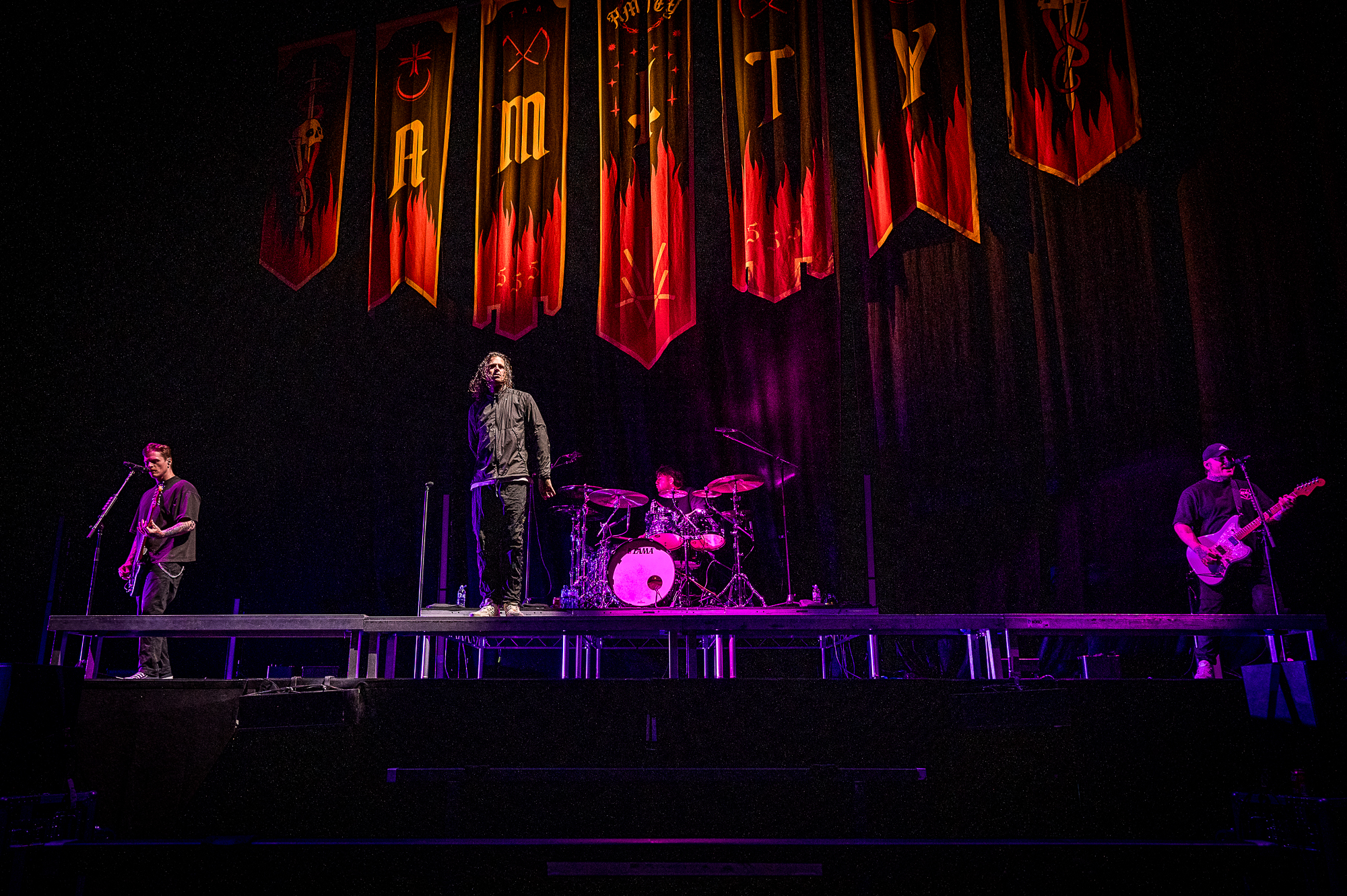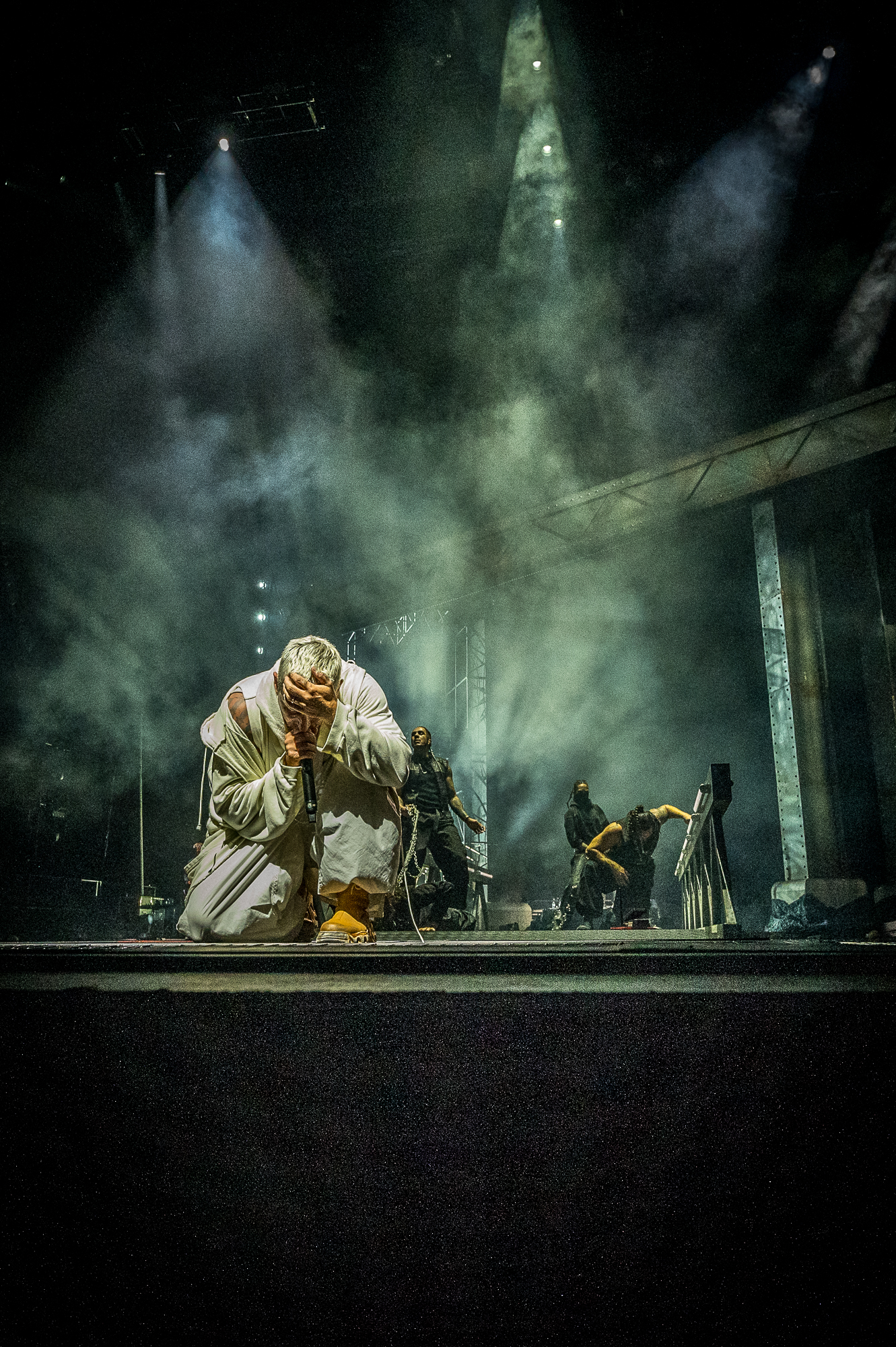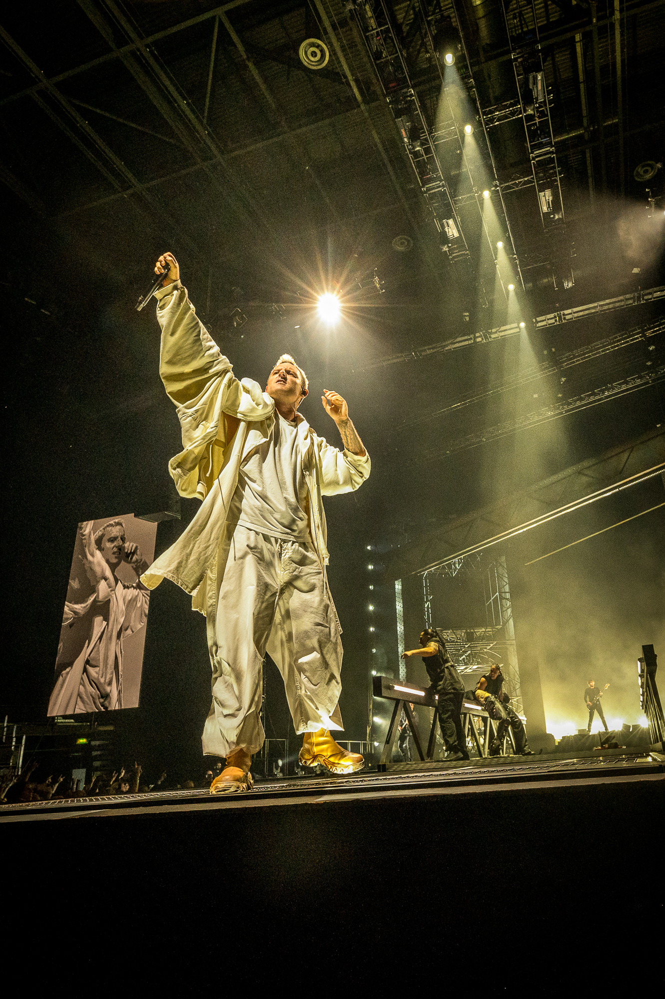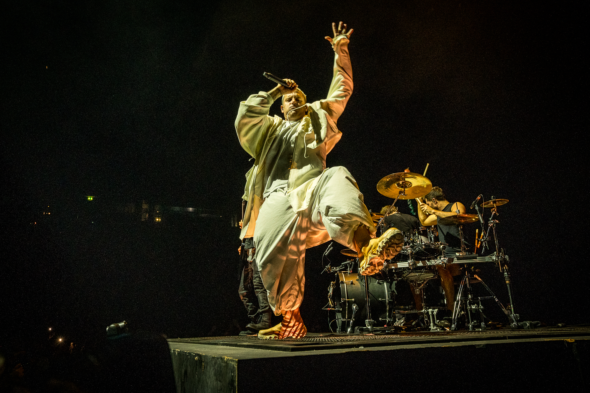 In an attempt to go right back to their roots, the band pushed on with a special mash-up edition of their first album, Killing With A Smile. Ten minutes of full-frontal ferocity, wall-to-wall mosh pits in the swirling sea that overtook the arena’s packed floor. Ten minutes later, Winston decides to take centre stage, becoming an anchor point for the crowd to rally around him for Idols and Anchors. Other tracks like Chronos and Darker Still are elevated spectacularly by a three-piece string accompaniment. The show becomes a symphony, hitting the heavy with the sweet bliss of the duelling violins. Wishing Wells, whilst slow to start, feels eerie with the oncoming rain, with wicked meaning drawn out by the robe-clad dancers, occult and unnerving.Â