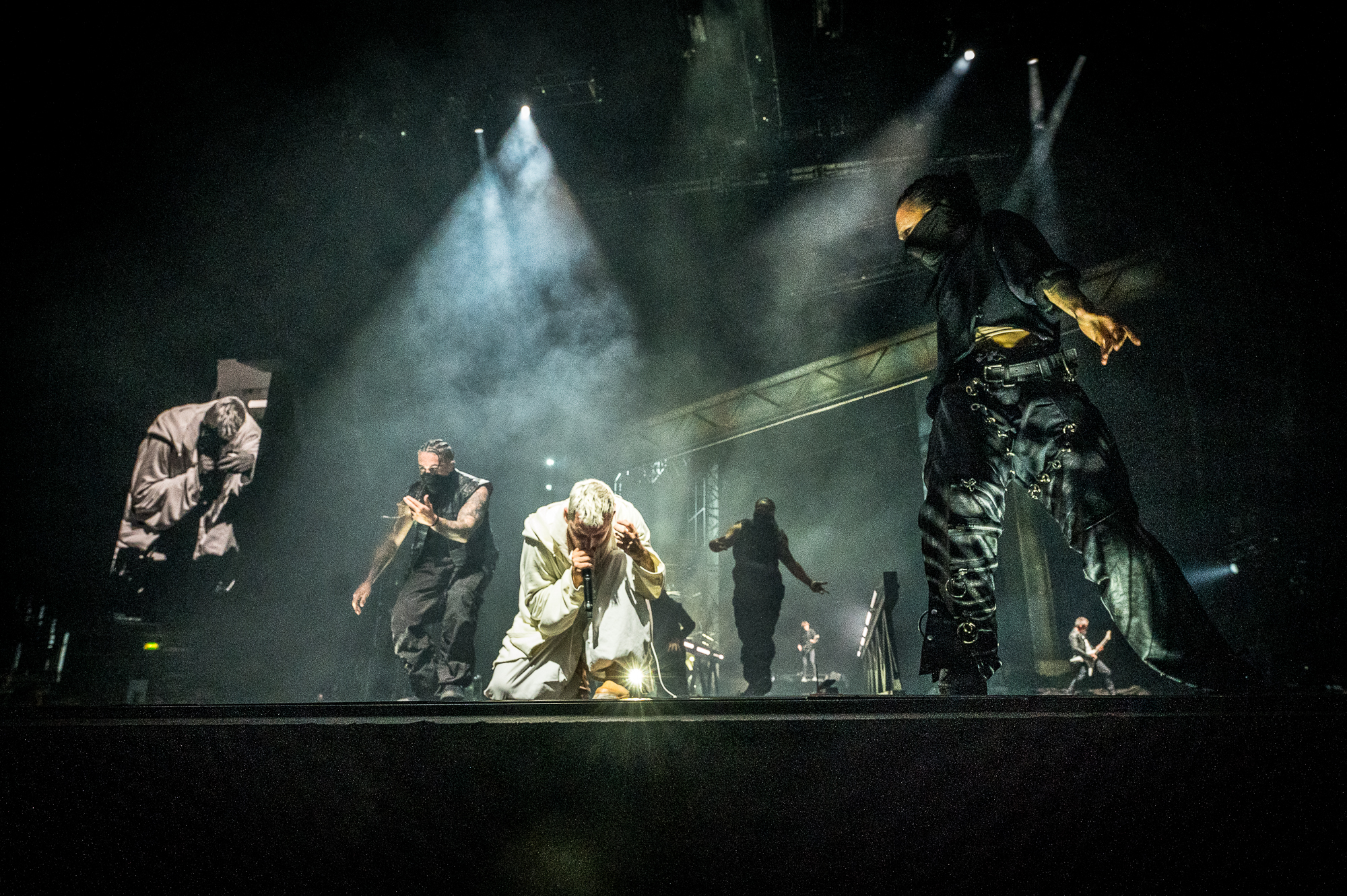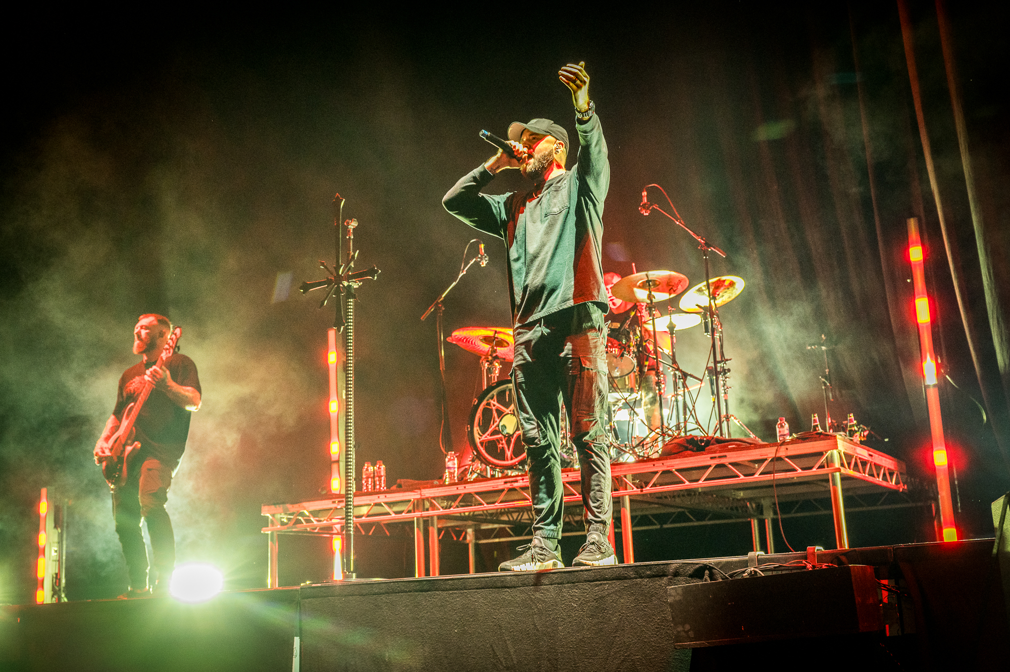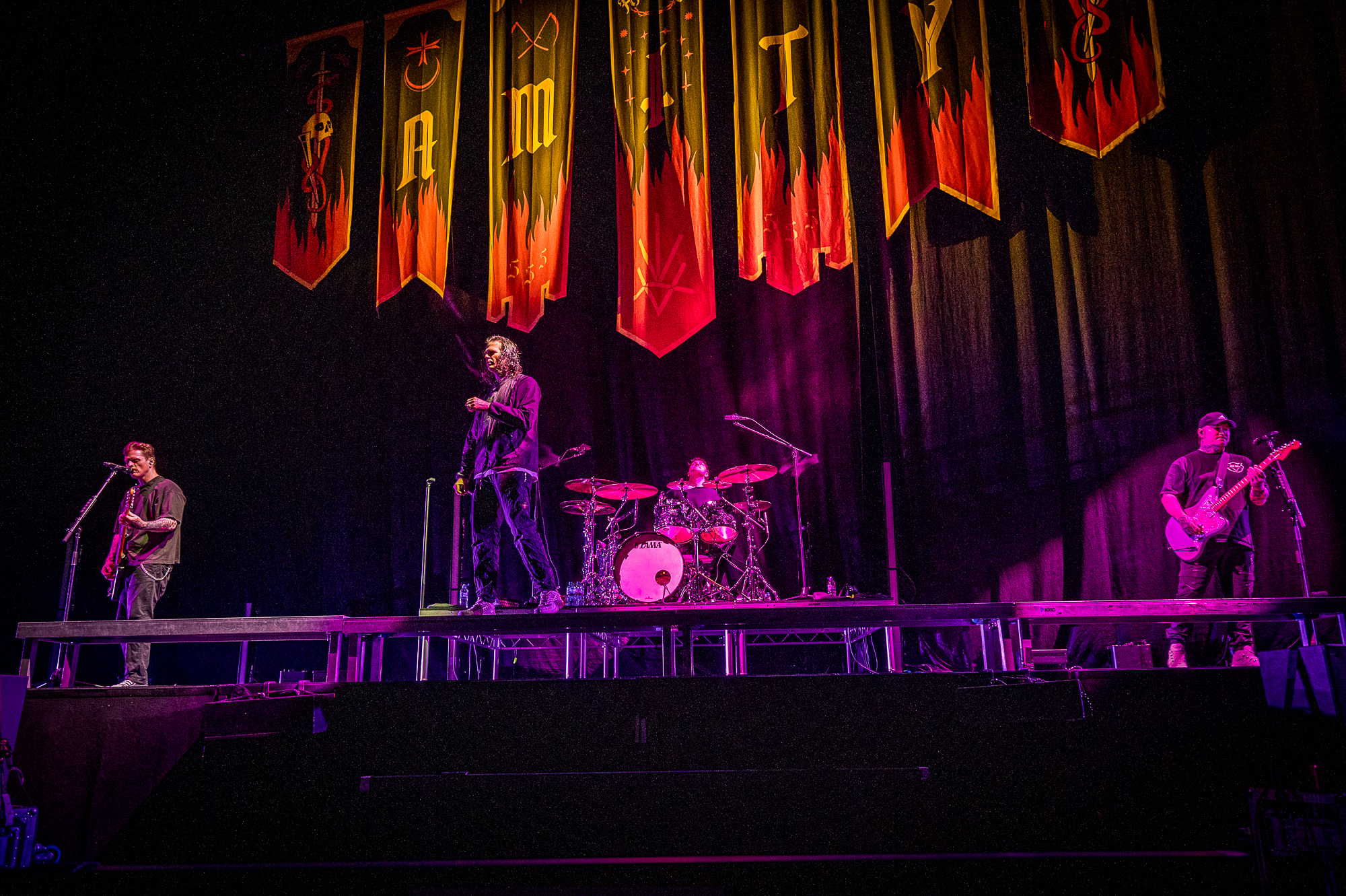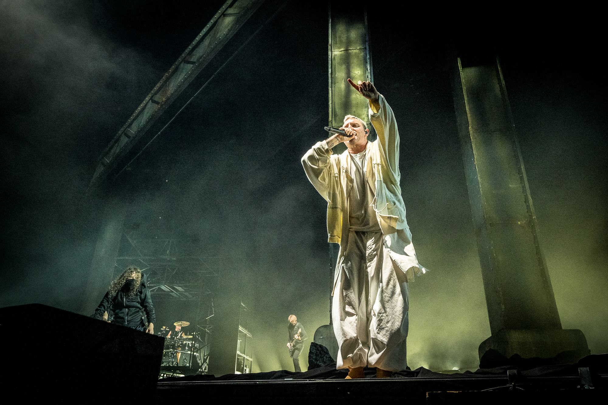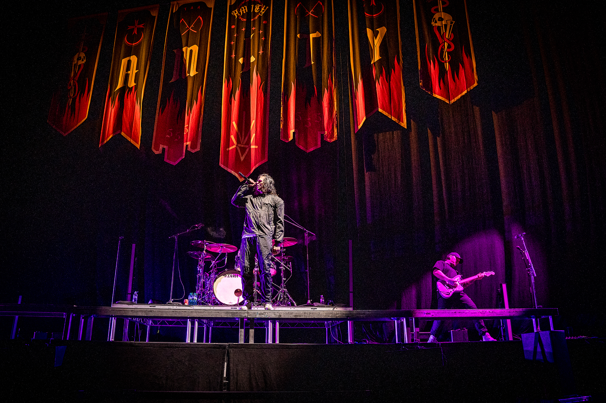 In an attempt to go right back to their roots, the band pushed on with a special mash-up edition of their first album, Killing With A Smile. Ten minutes of full-frontal ferocity, wall-to-wall mosh pits in the swirling sea that overtook the arena’s packed floor. Ten minutes later, Winston decides to take centre stage, becoming an anchor point for the crowd to rally around him for Idols and Anchors. Other tracks like Chronos and Darker Still are elevated spectacularly by a three-piece string accompaniment. The show becomes a symphony, hitting the heavy with the sweet bliss of the duelling violins. Wishing Wells, whilst slow to start, feels eerie with the oncoming rain, with wicked meaning drawn out by the robe-clad dancers, occult and unnerving.Â