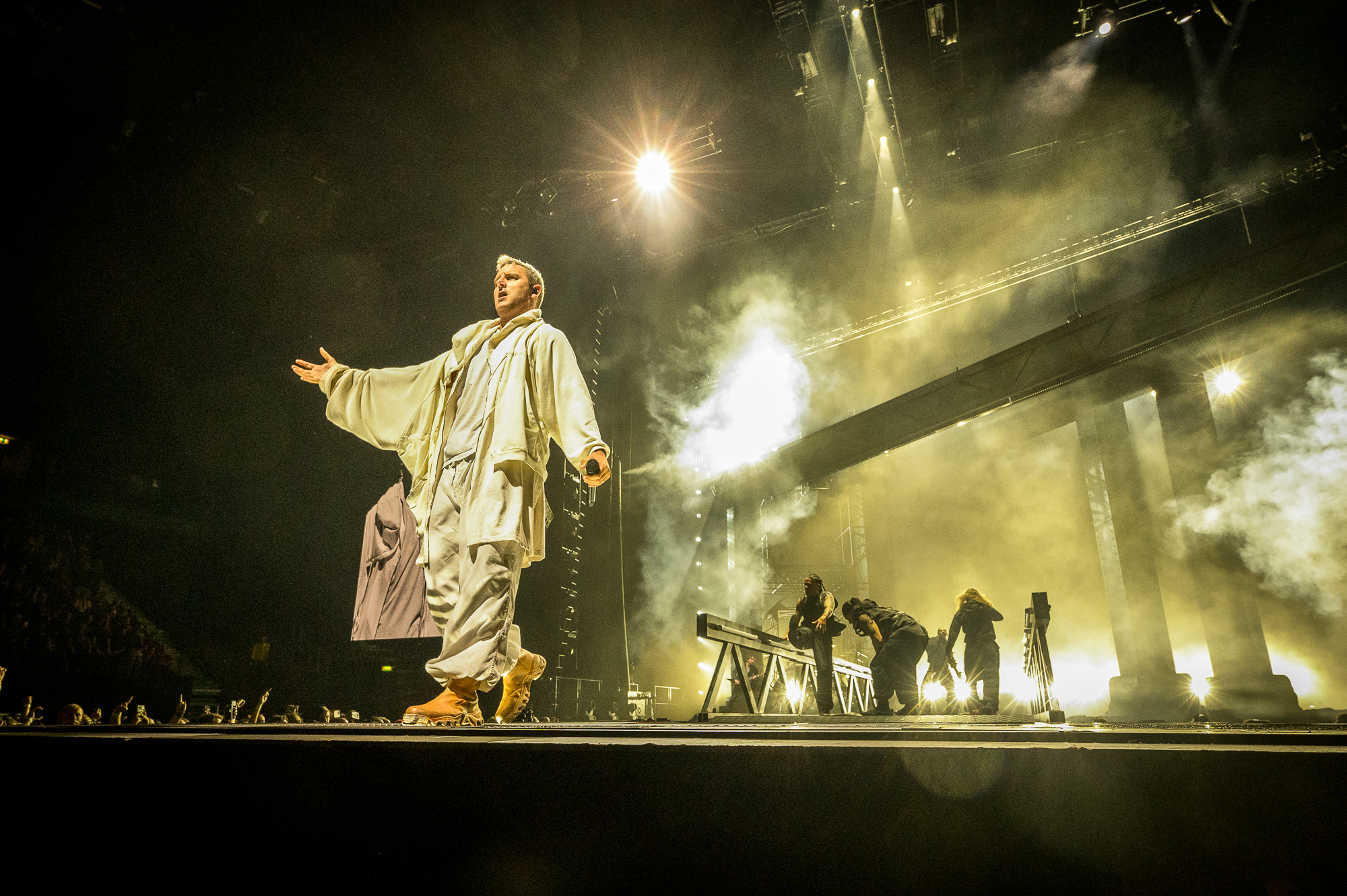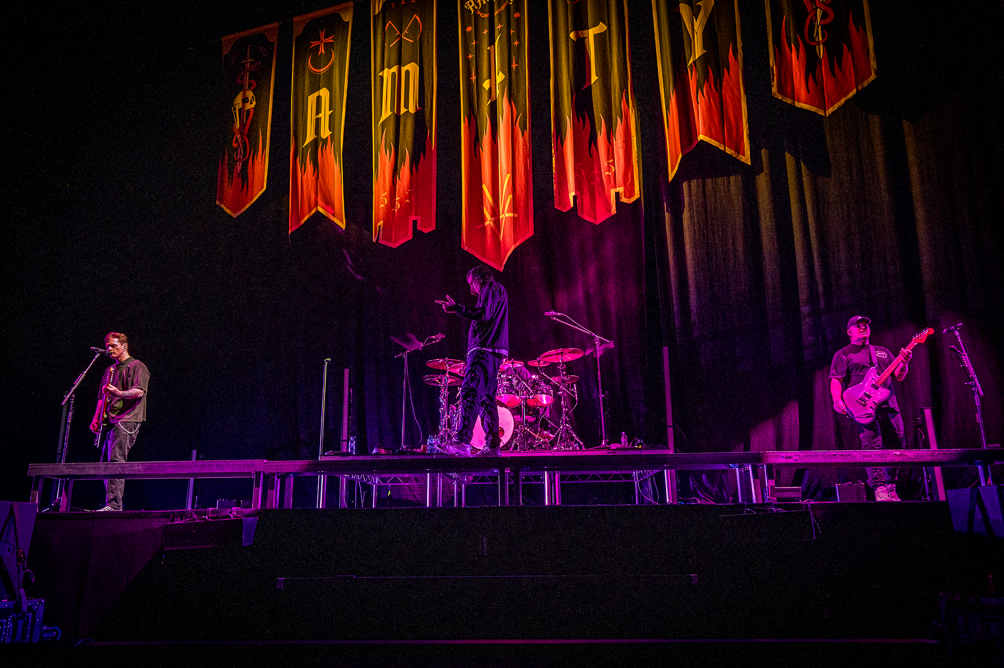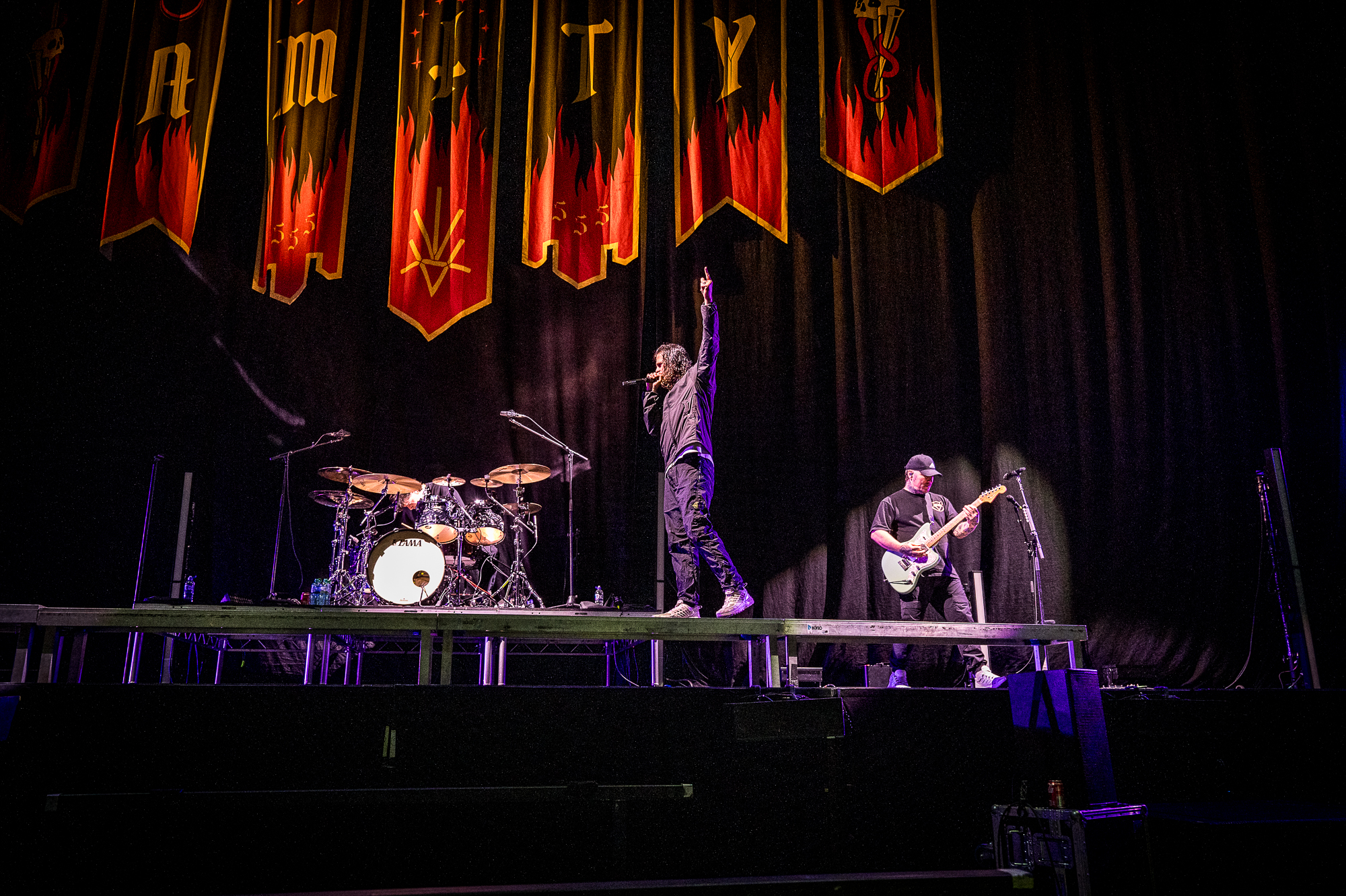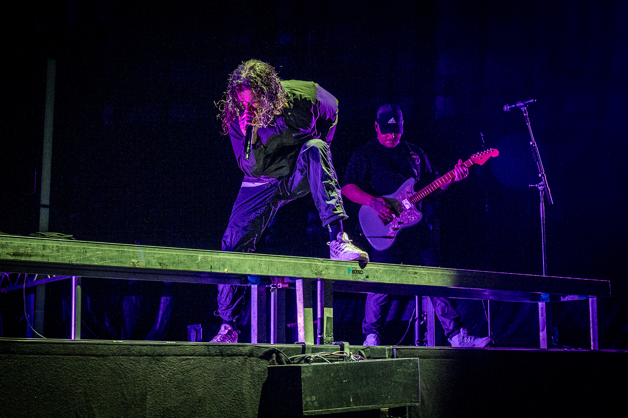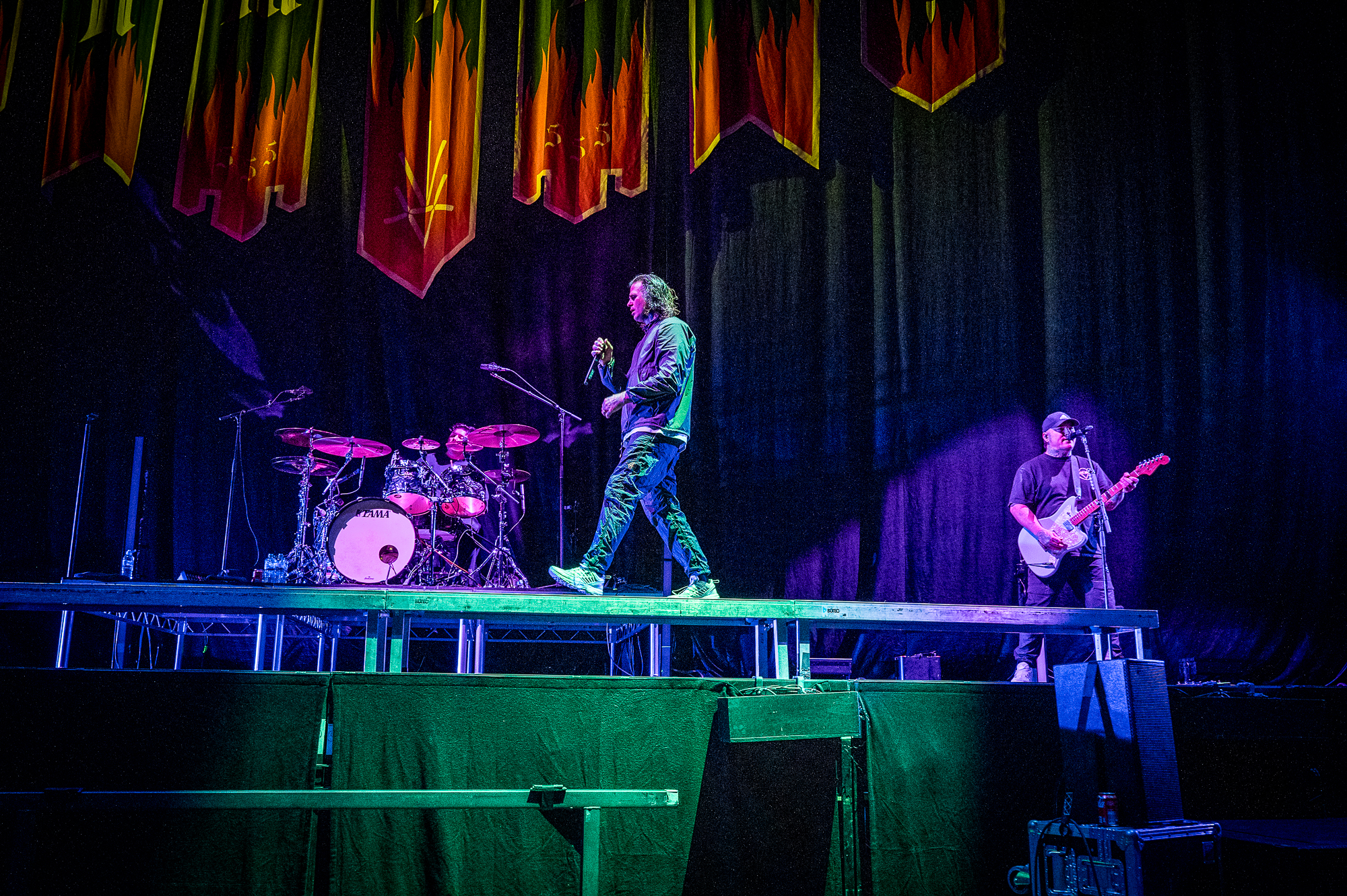 In an attempt to go right back to their roots, the band pushed on with a special mash-up edition of their first album, Killing With A Smile. Ten minutes of full-frontal ferocity, wall-to-wall mosh pits in the swirling sea that overtook the arena’s packed floor. Ten minutes later, Winston decides to take centre stage, becoming an anchor point for the crowd to rally around him for Idols and Anchors. Other tracks like Chronos and Darker Still are elevated spectacularly by a three-piece string accompaniment. The show becomes a symphony, hitting the heavy with the sweet bliss of the duelling violins. Wishing Wells, whilst slow to start, feels eerie with the oncoming rain, with wicked meaning drawn out by the robe-clad dancers, occult and unnerving.Â