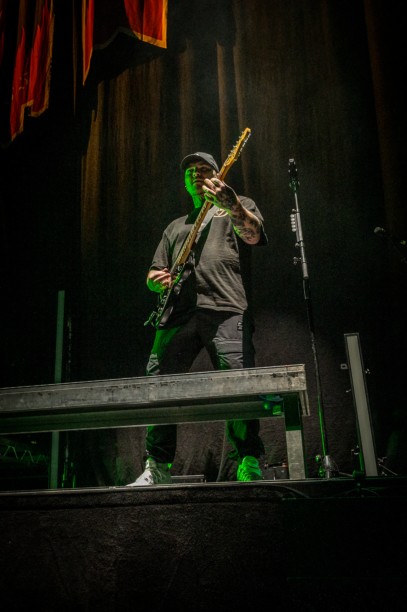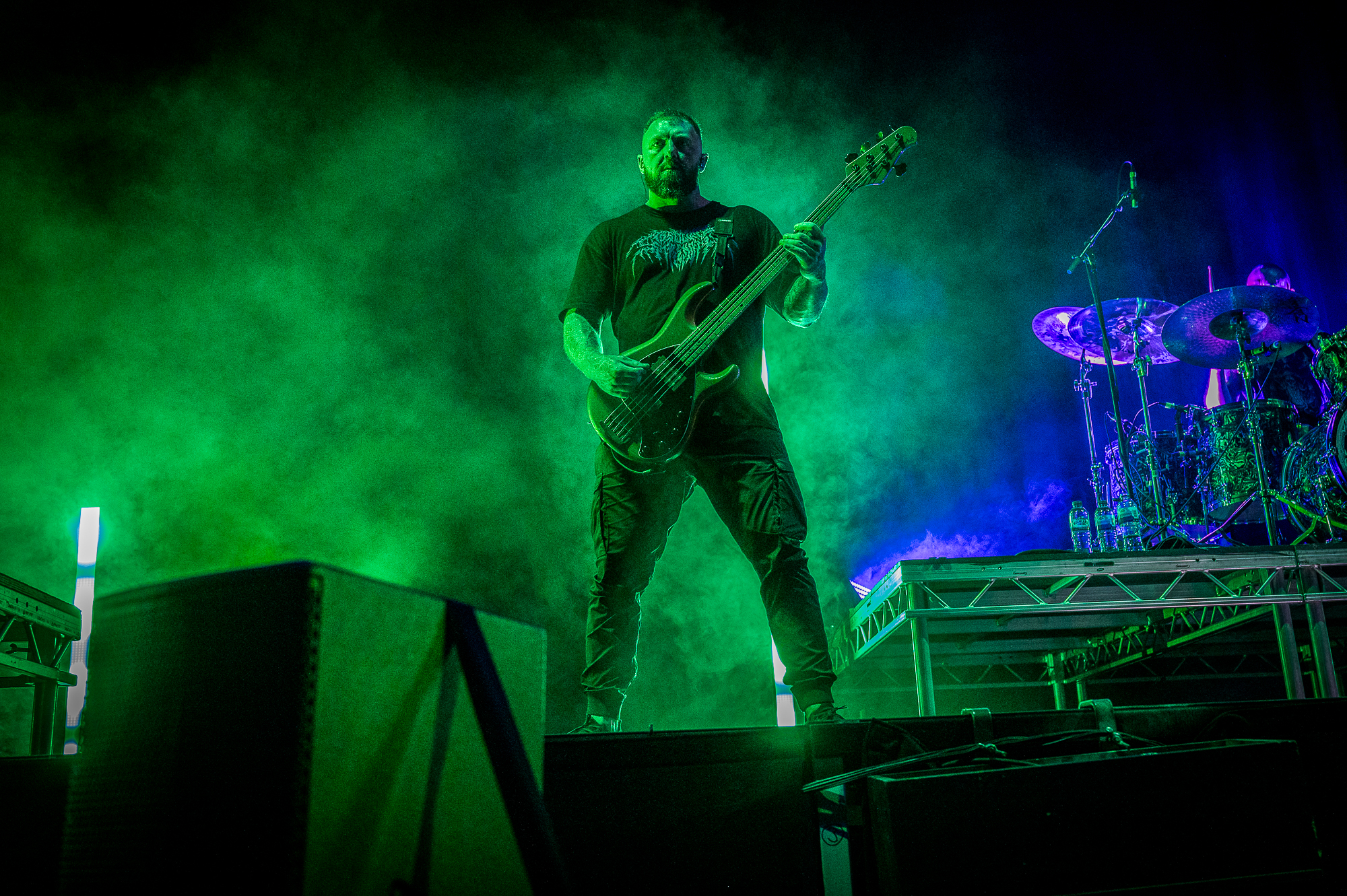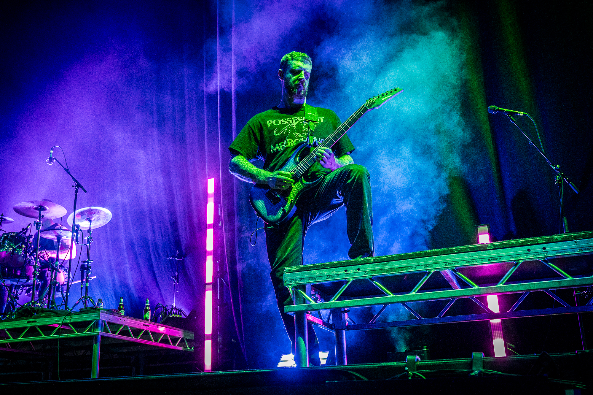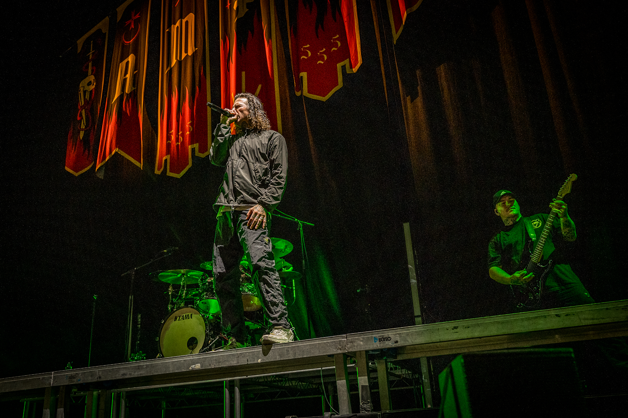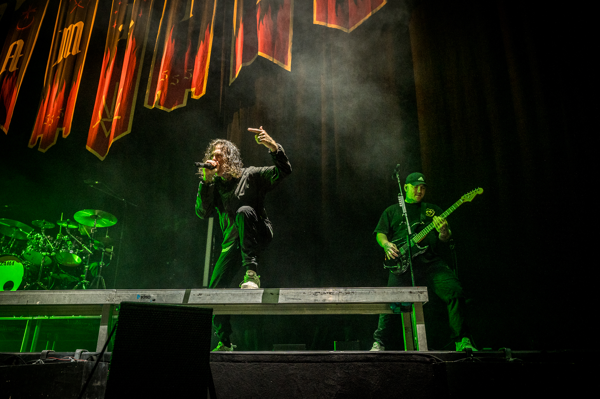 Both supports, THE AMITY AFFLICTION and THY ART IS MURDER, stood at opposite ends of the heavy scene, but this Aussie grand slam was assembled with a true representation of what the country could offer. Openers THE AMITY AFFLICTION were strong, bullish with their low growls that cut through the arena crowd. A strong first impression, that was a slow burn until the pits began to open. Washed in acid greens and bathed in those signature all-encompassing choruses, the highs did get lost in the mix, but still hit home with their signature hits like Drag The Lake and It’s Hell Down Here.Â